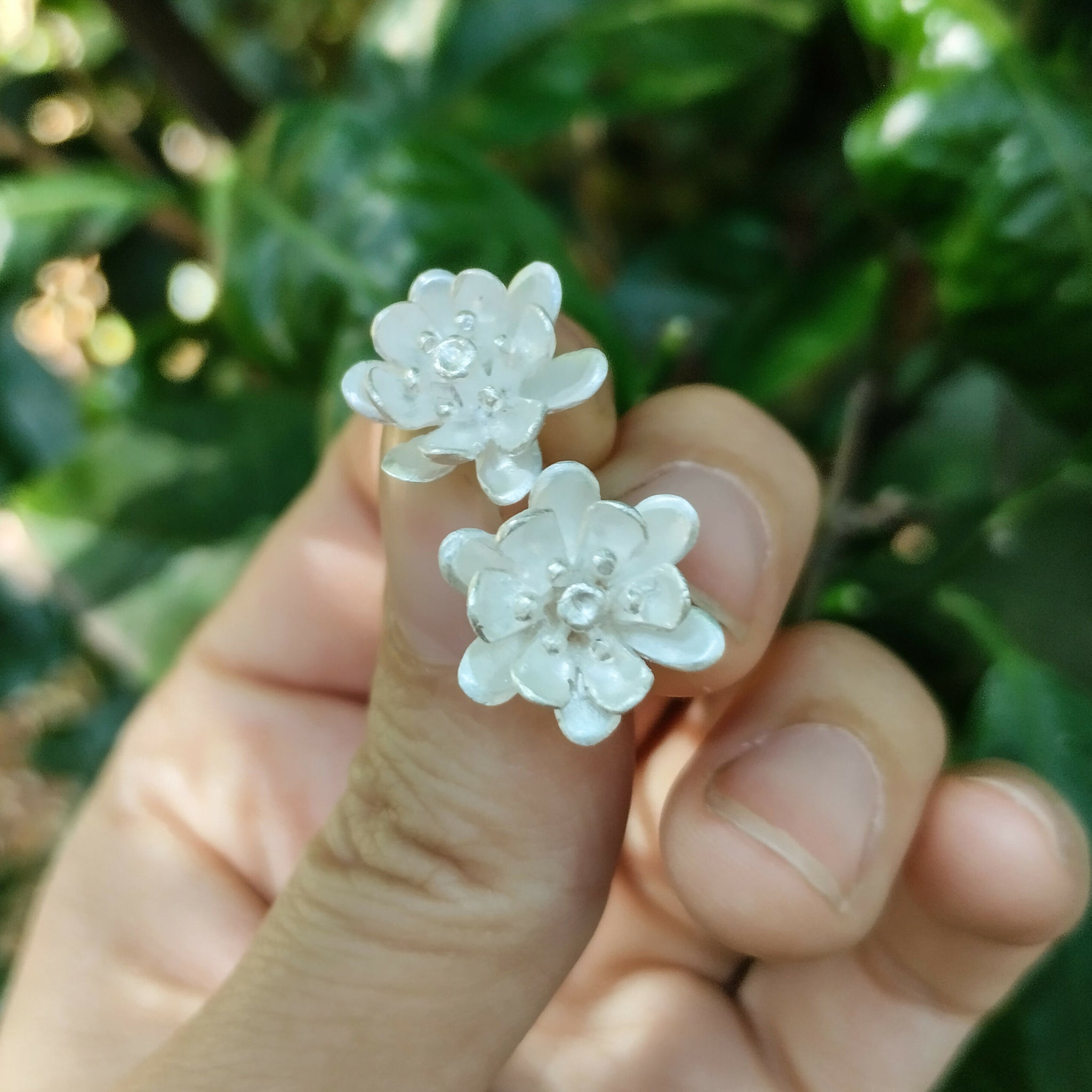Aros inspirados en la flor de Michay, que es la flor del Calafate. Pertenece a nuestra colección Endémica, ya que este arbusto es parte de la biodiverasidad botánica de nuestro país, habita el sur de Chiloé y zonas cordilleranas. Está hecho a mano construido a partir de distintas técnicas en metal. Hecho en plata 950.