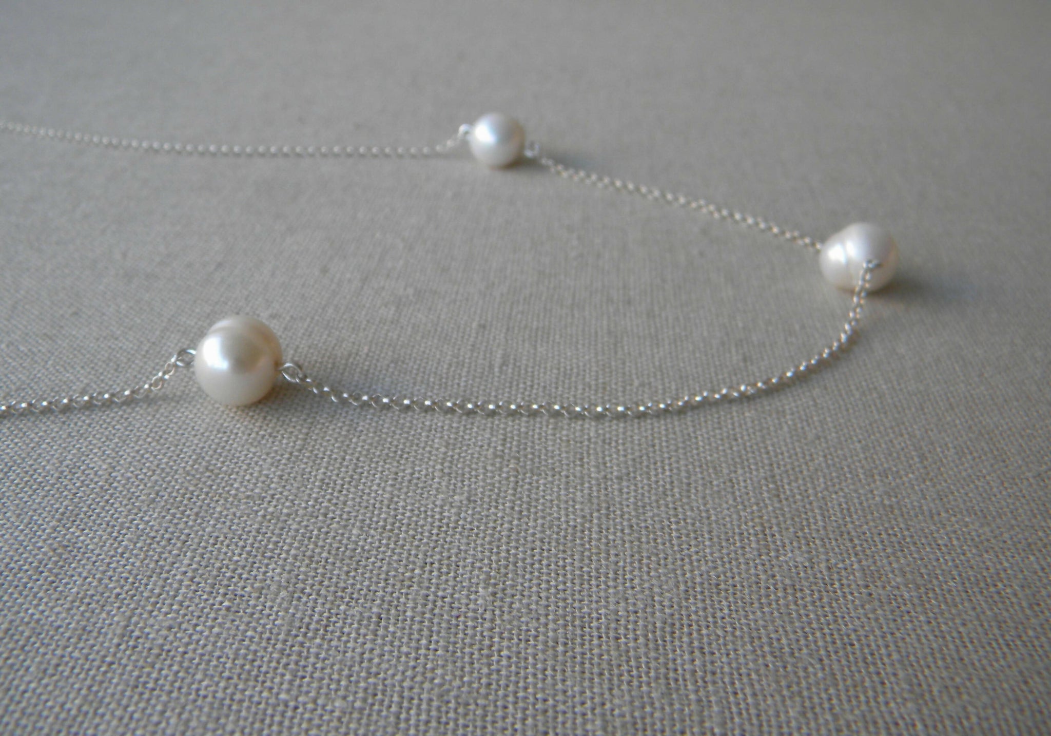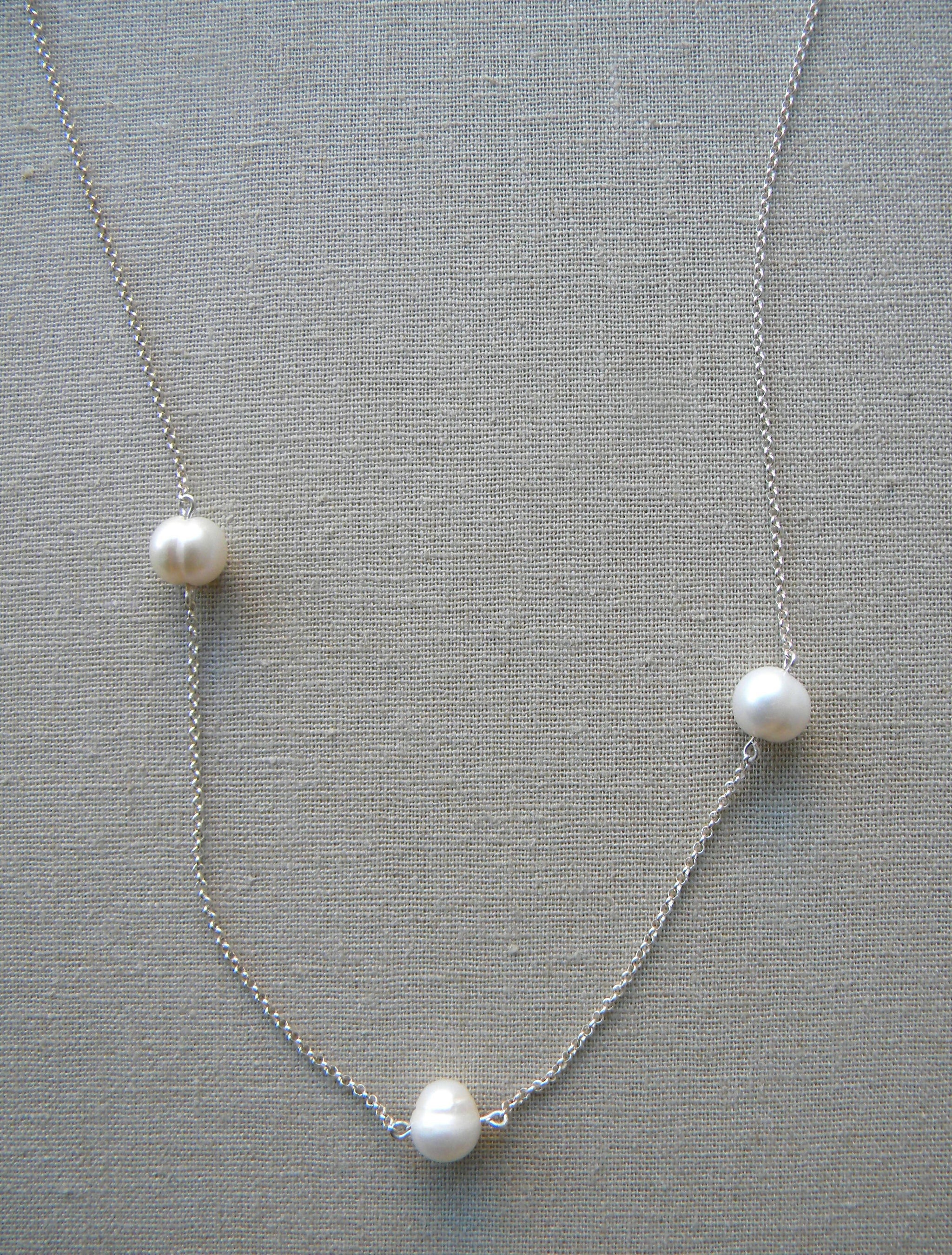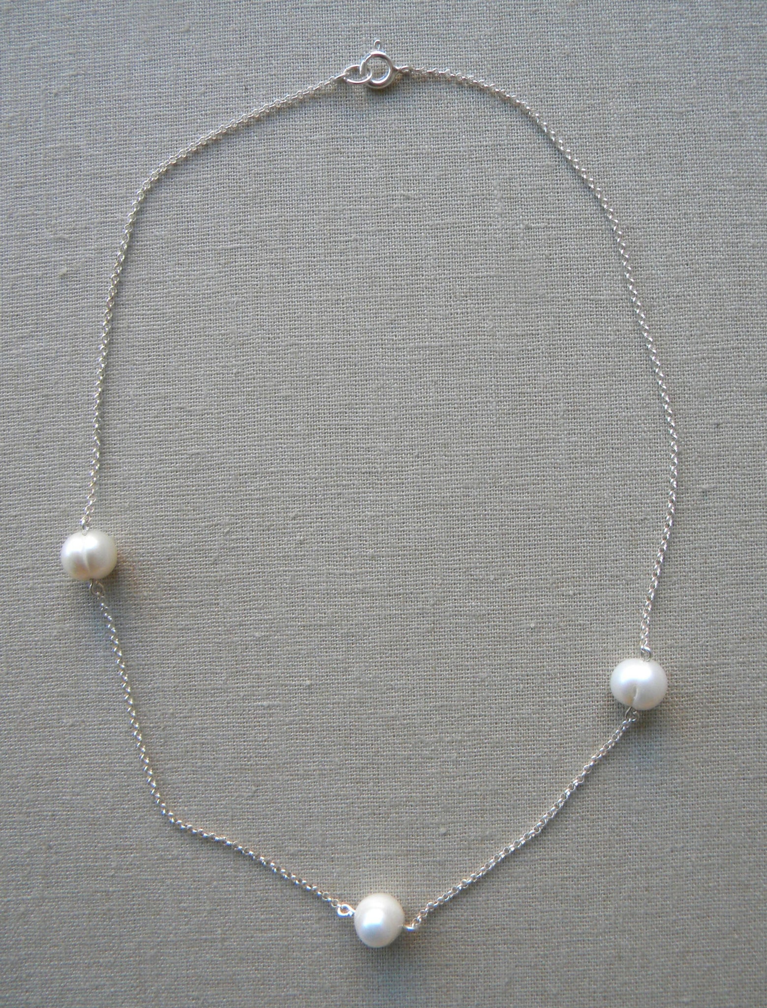 Collar corto de cadena de plata de 45cm de largo con 3 perlas grandes de río con un diseño en forma asimétrica que lo hace diferente.