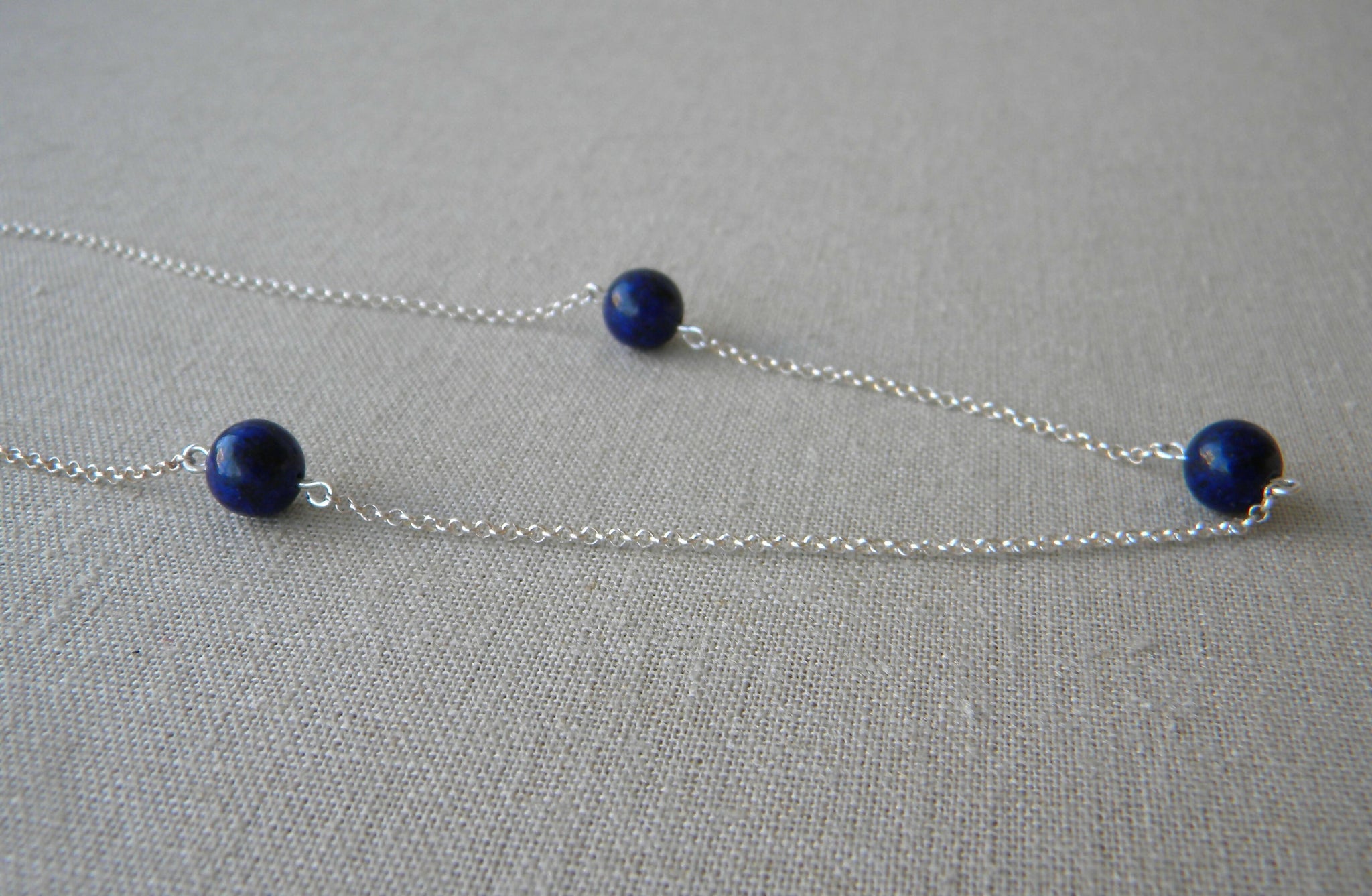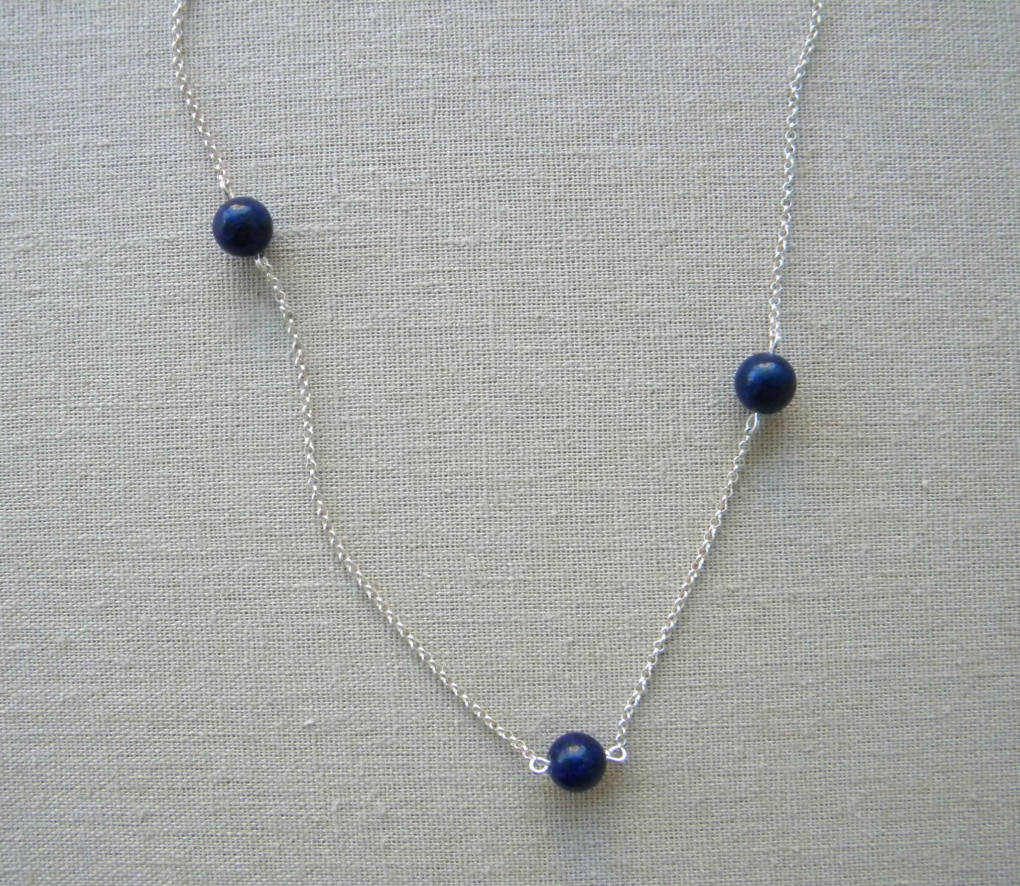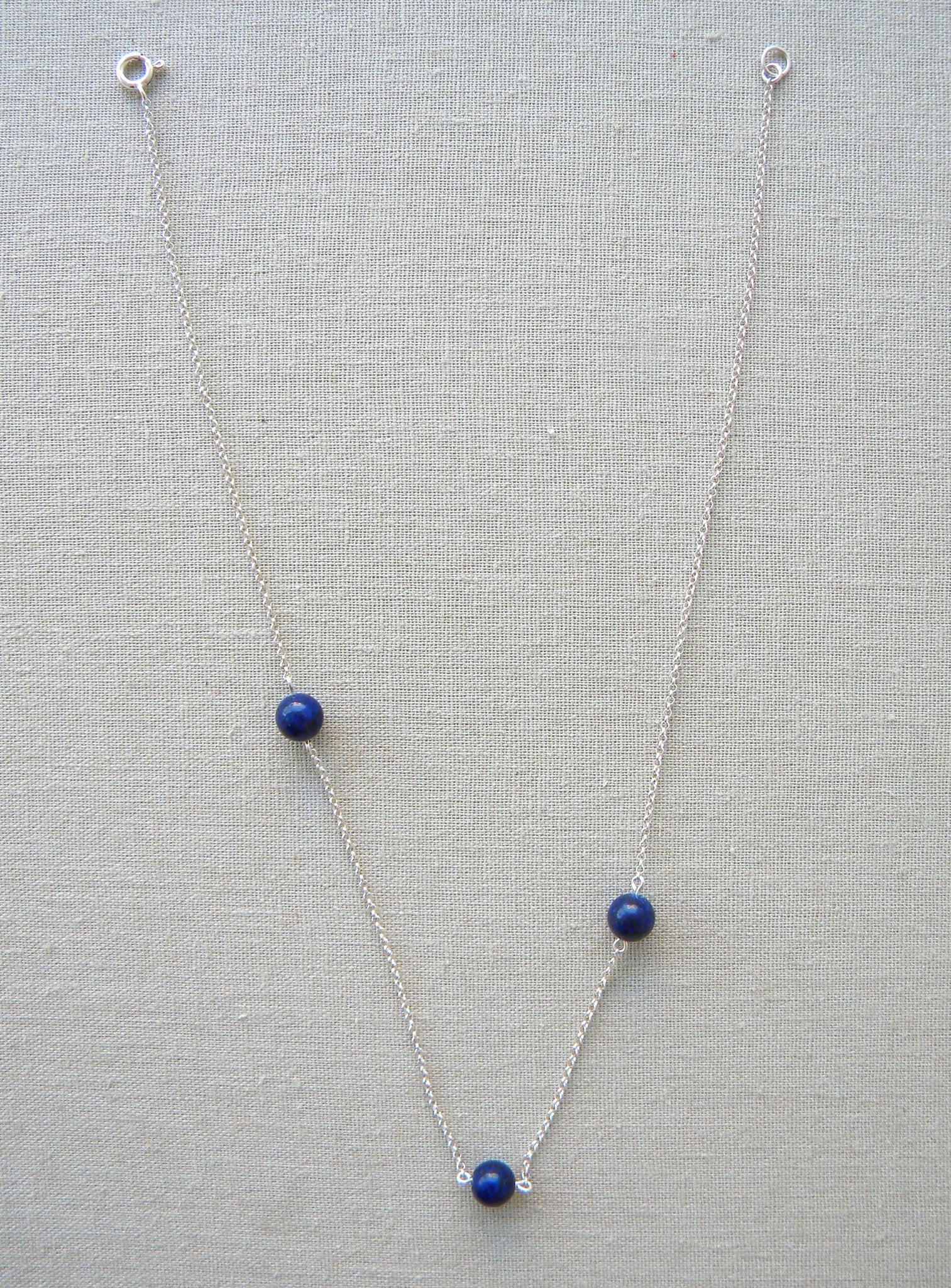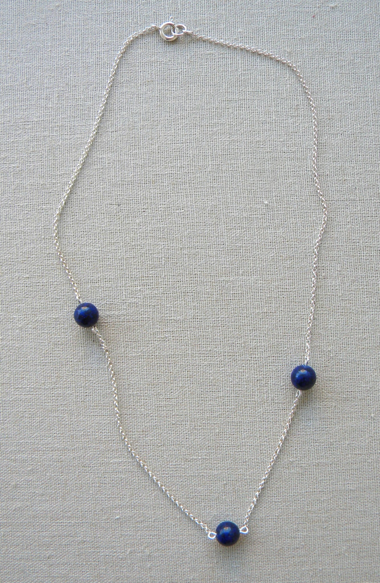 Collar corto de cadena de plata de 45cm de largo con 3 piedras de lapislázuli medianas con un diseño en forma asimétrica que lo hace original.