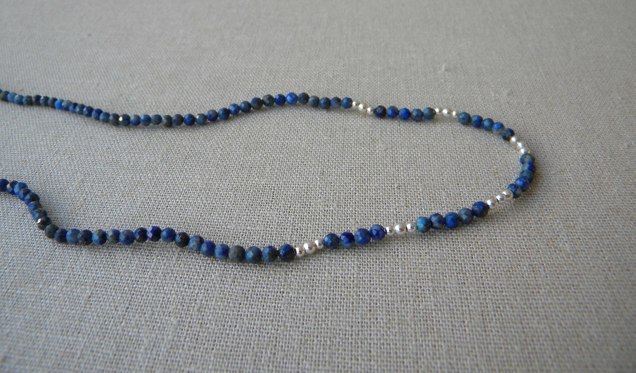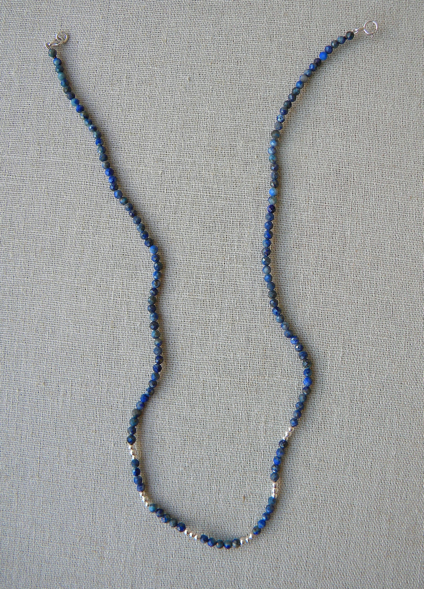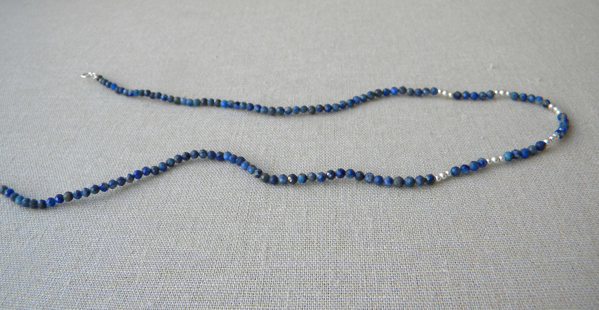 Es un collar ALWA hecho con mostacillas chicas de plata 950 combinadas con piedras semipreciosas chilenas de lapislázuli muy finas y facetadas.