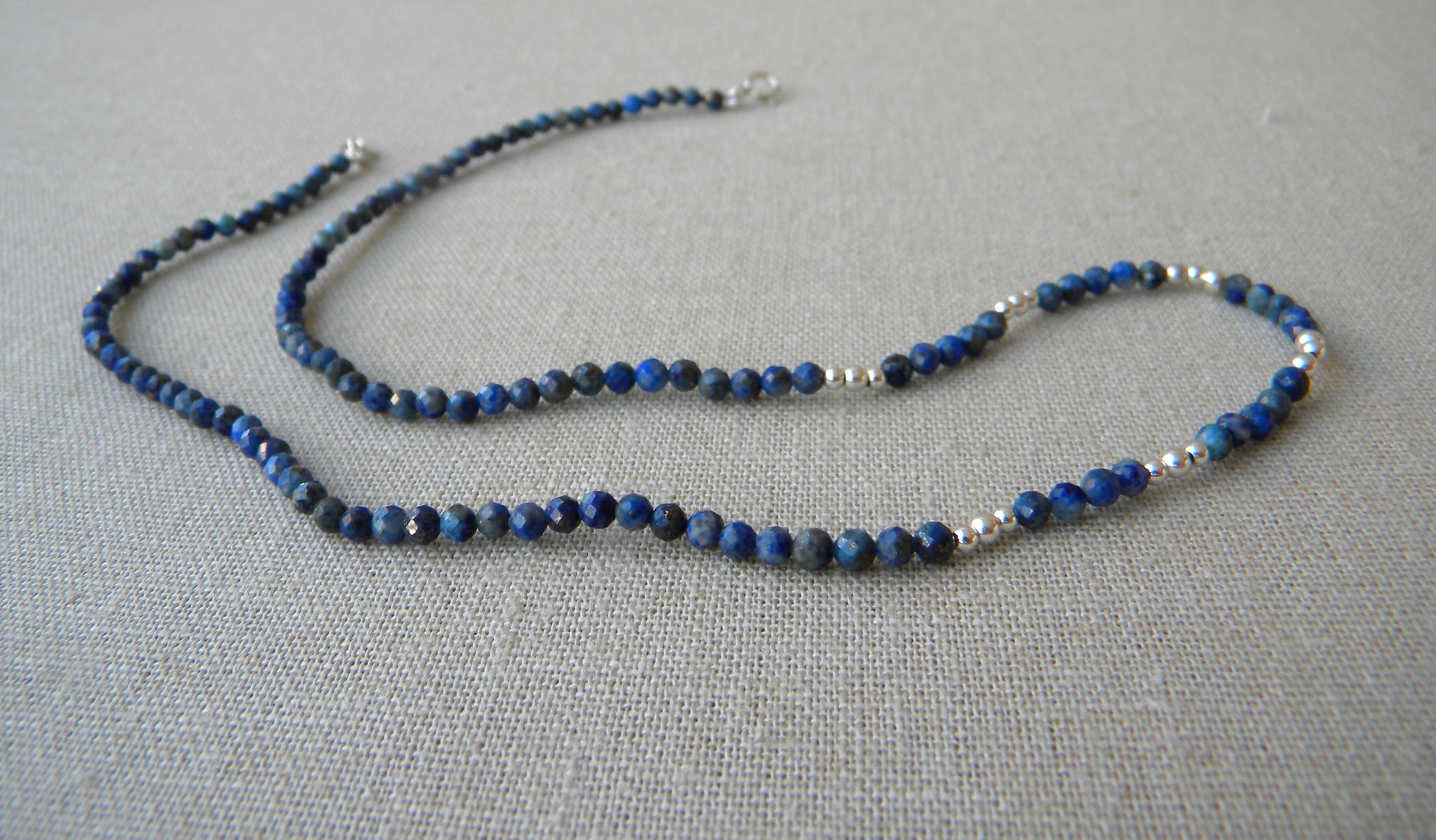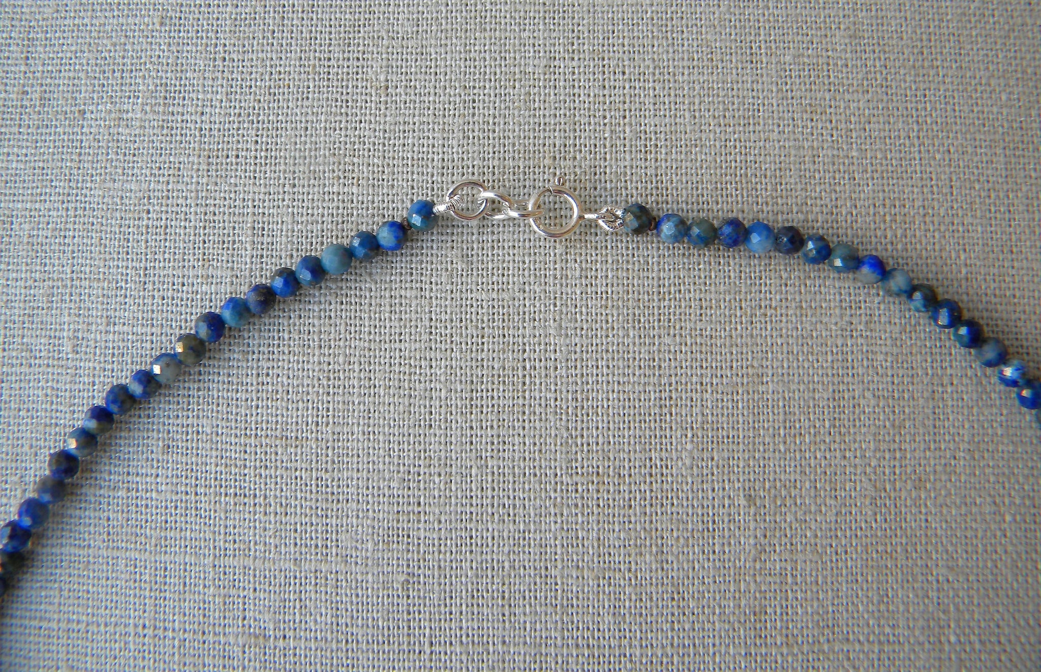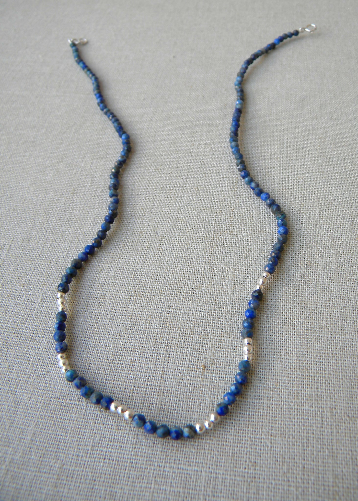 Es un collar ALWA hecho con mostacillas chicas de plata 950 combinadas con piedras semipreciosas chilenas de lapislázuli muy finas y facetadas.