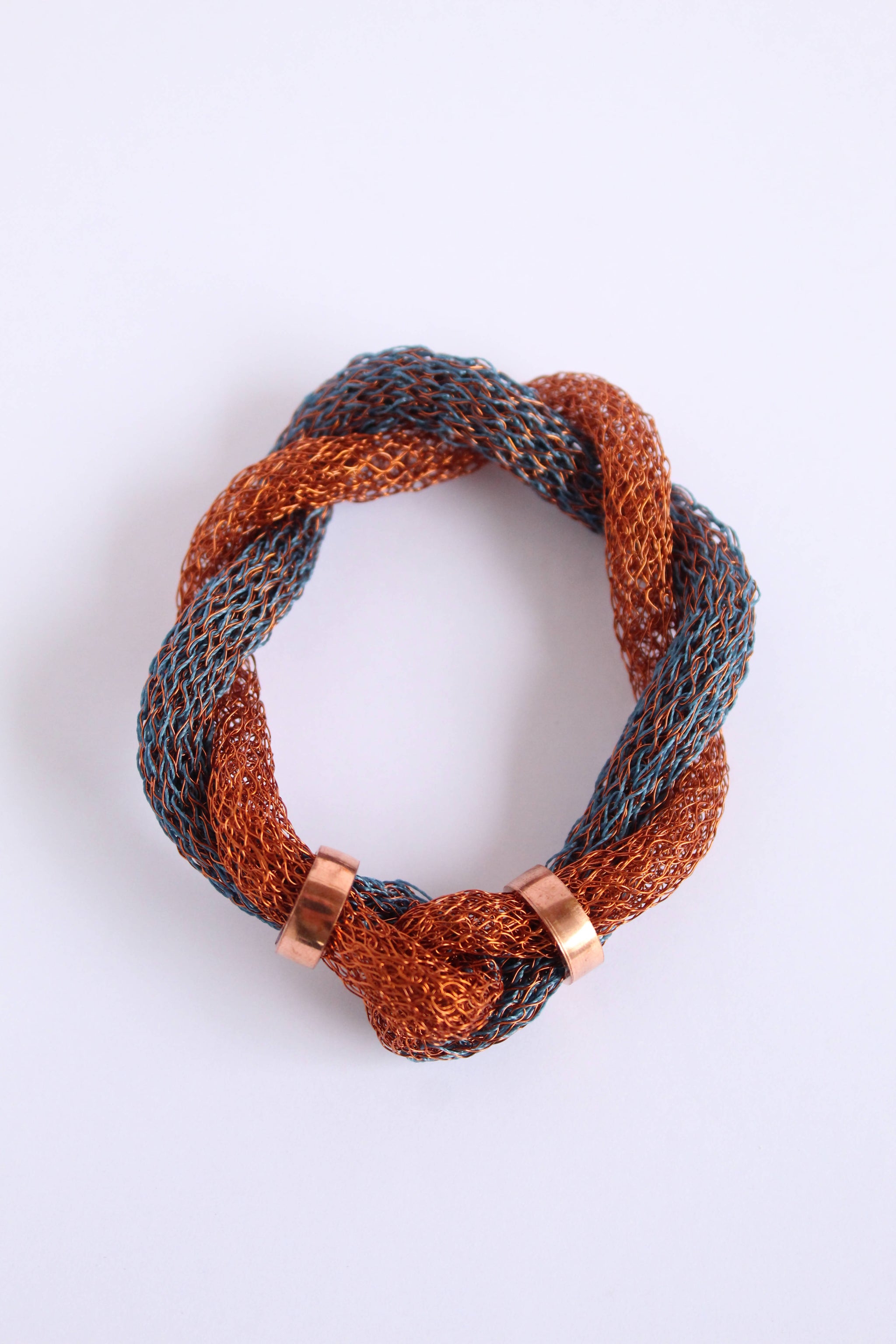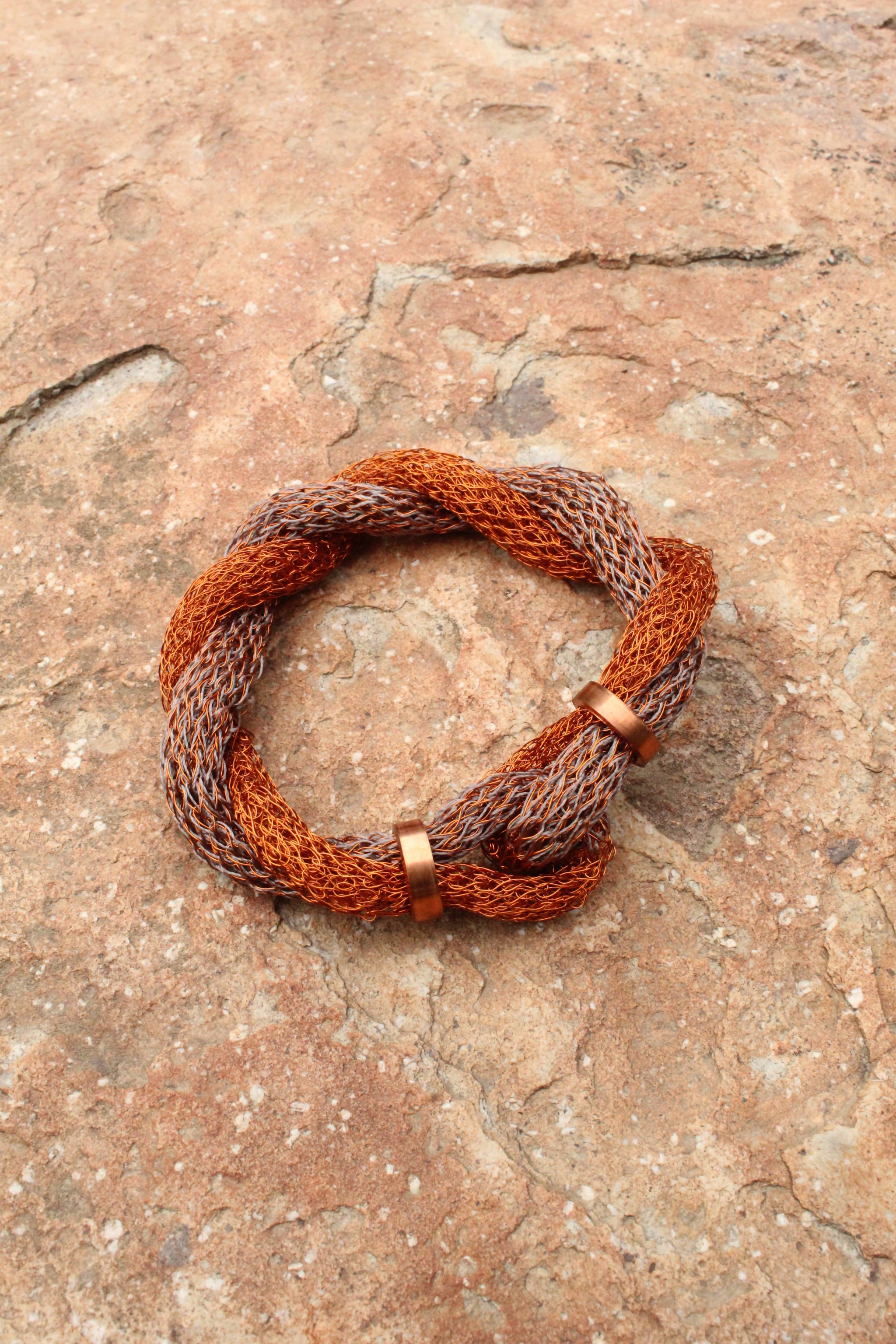 Pulsera tejida en alambre de cobre e hilo, un cordón doble que se mantiene unido con la aplicación de un anillo de tubería de cobre fijada con costura echa a mano.