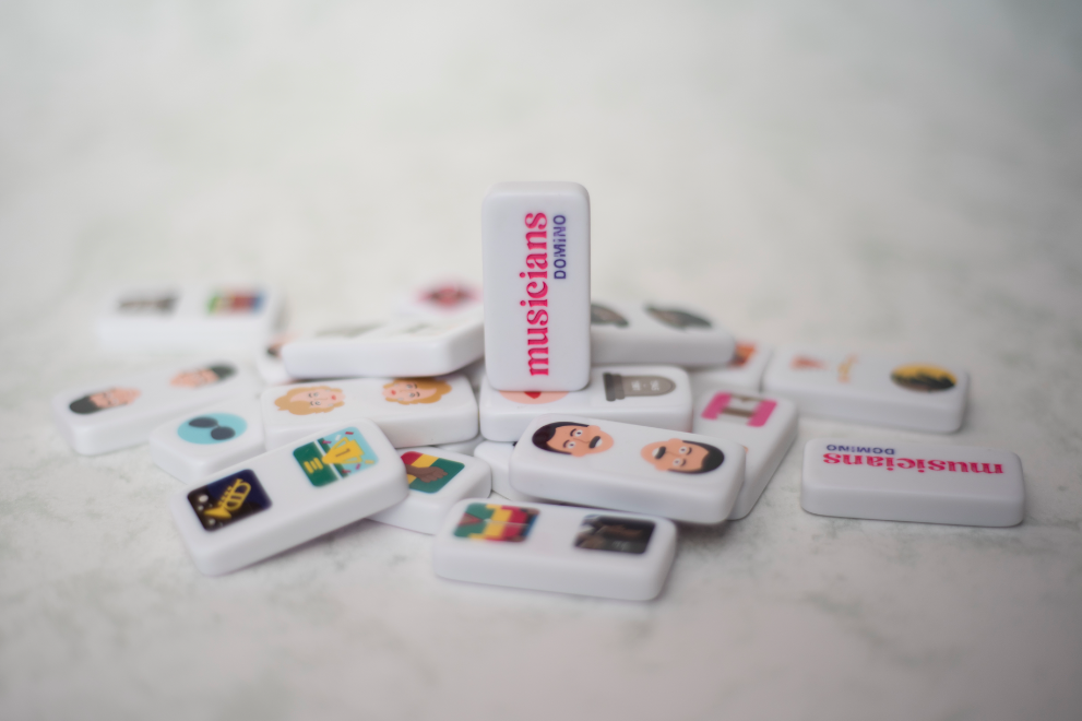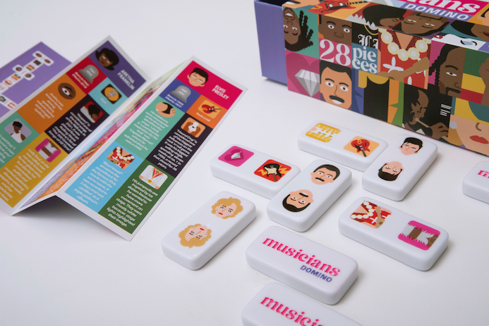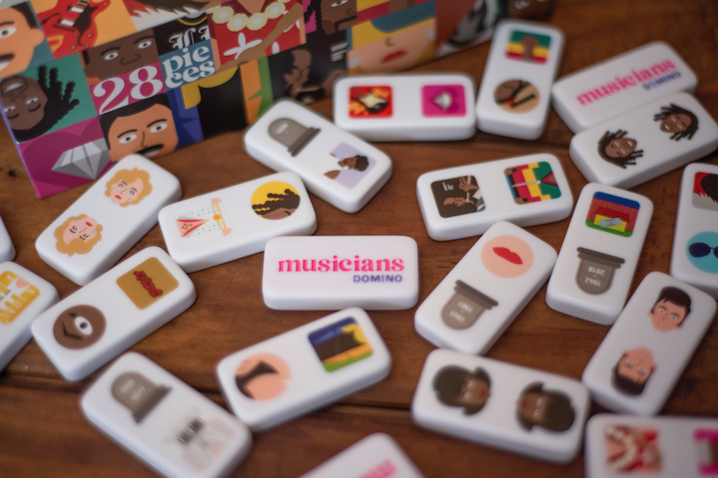 En este Dominó debes relacionar los diferentes músicos con sus canciones, y otros elementos característicos de su vida, como por ejemplo disco famoso, outfit icónico, característica física, entre otros. Esto incrementa el desafío, ya que debes ir aprendiendo acerca de la vida de: Madonna, Snoop Dogg, Aretha Franklin, Freddie Mercury, Elvis Presley, Bob Marley y Miles Davis para poder ganar. / Incluye 28 piezas e instrucciones de juego.
