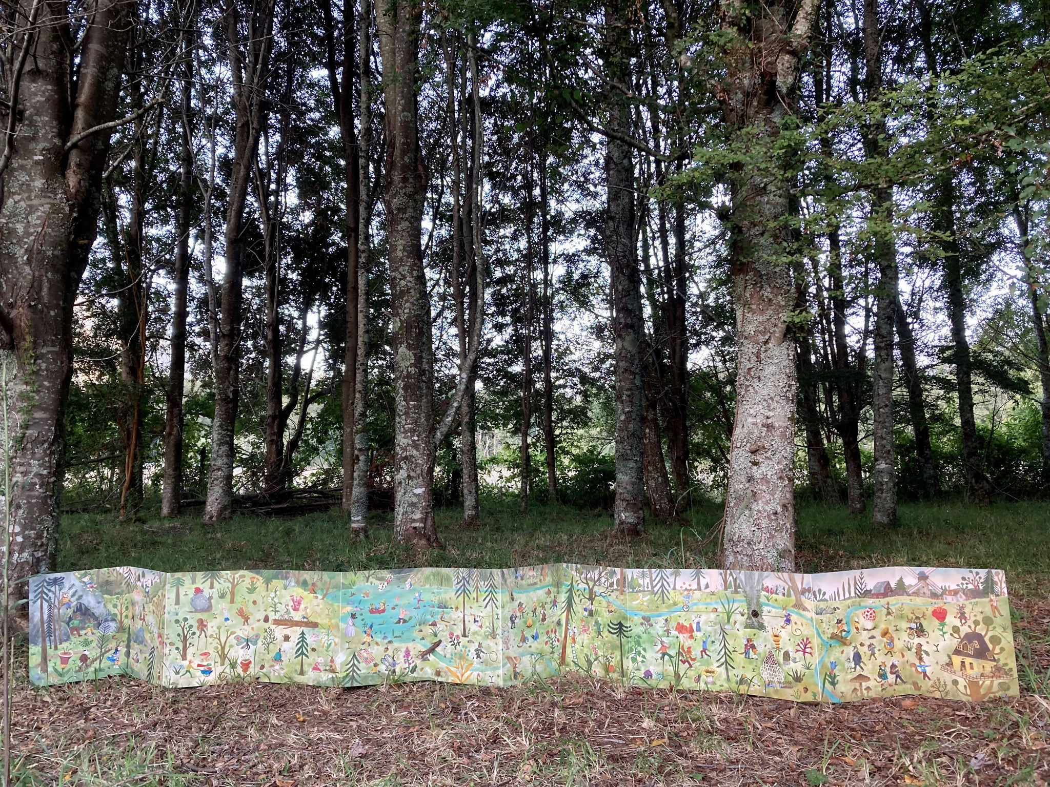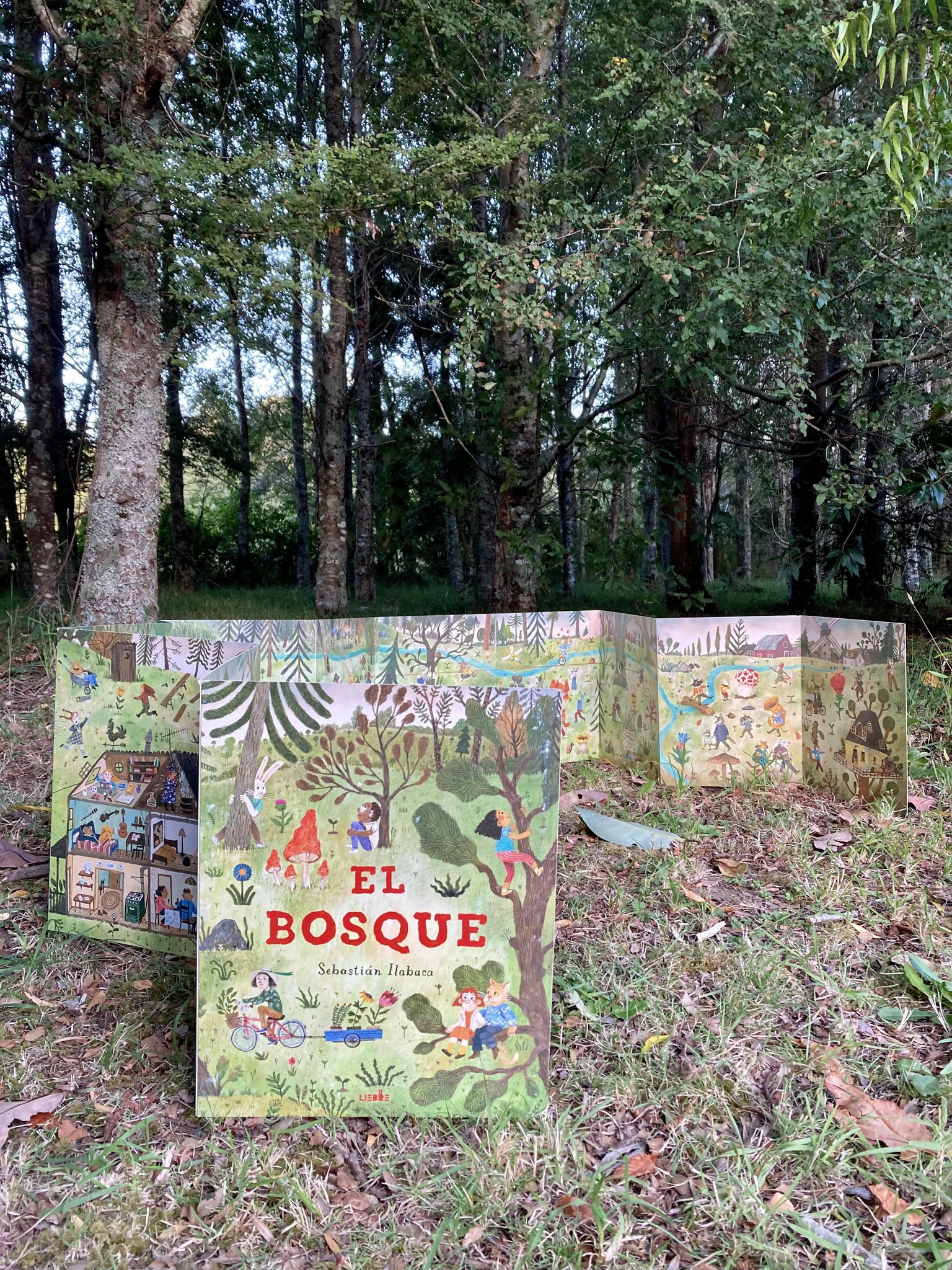 Libro de cartoné que se despliega llegando a una extensión de 3,36 metros. Sin textos, este acordeón totalmente ilustrado por tiro y retiro permite a los lectores rodearse de paisajes ilustrados, divertirse con las simpáticas historias que ocurren en el bosque e interactuar con las 10 solapas y troqueles. De material resistente y flexible el libro se sostiene firme lo que posibilita que un grupo de niños juegue con él por ambos lados.