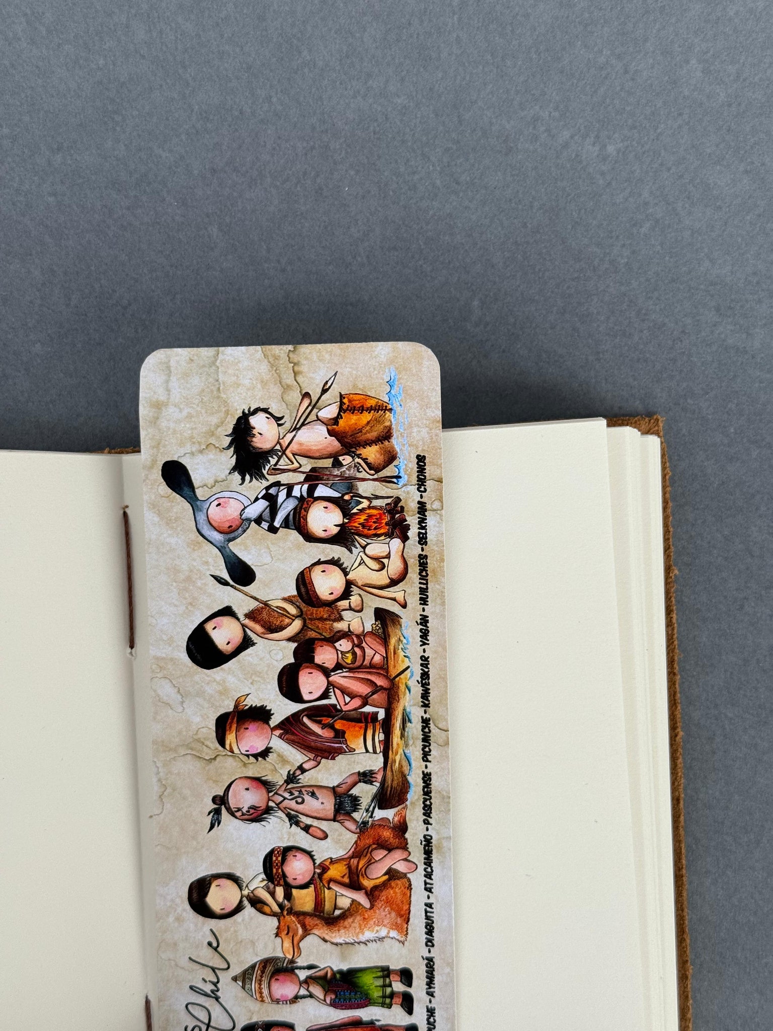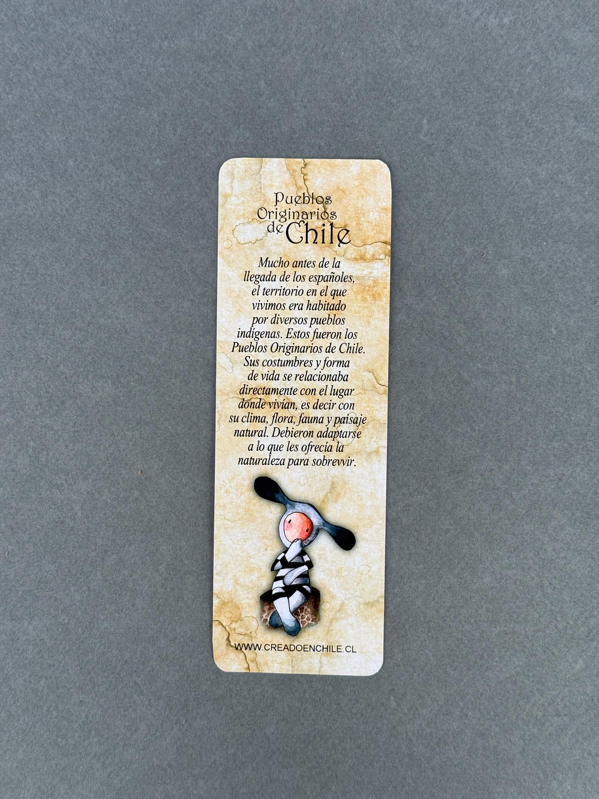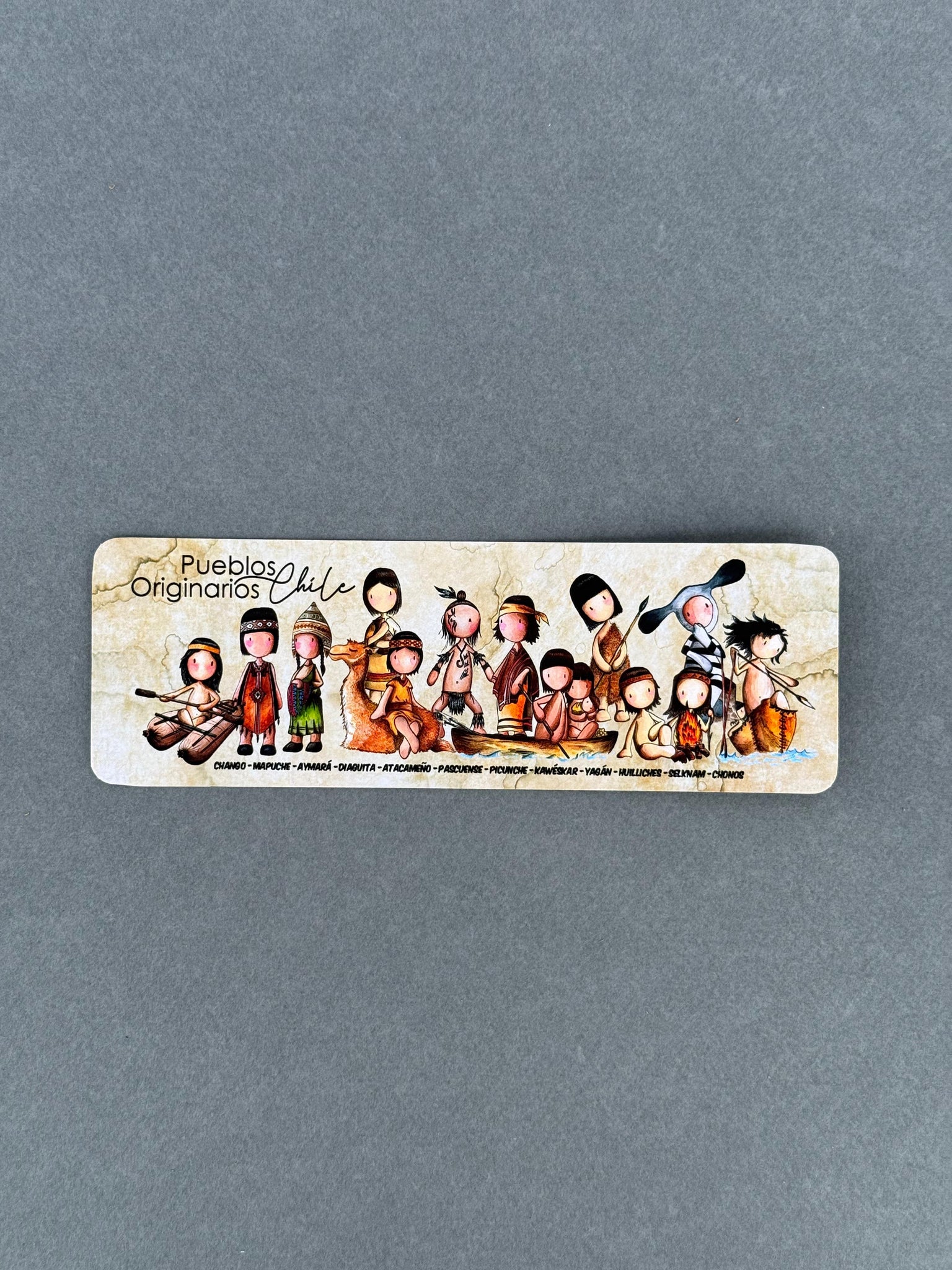 Una delicada ilustración que reúne a diversos pueblos originarios de Chile, desde el norte hasta el extremo sur del territorio, en un formato amigable, educativo y lleno de cariño. Este marcalibros rinde homenaje visual a su riqueza cultural, espiritual y ancestral.