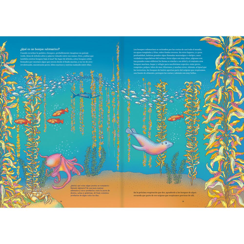 Ilustraciones cautivadoras y precisas: cada página es una explosión de color que retrata la biodiversidad marina con detalle y belleza artística.