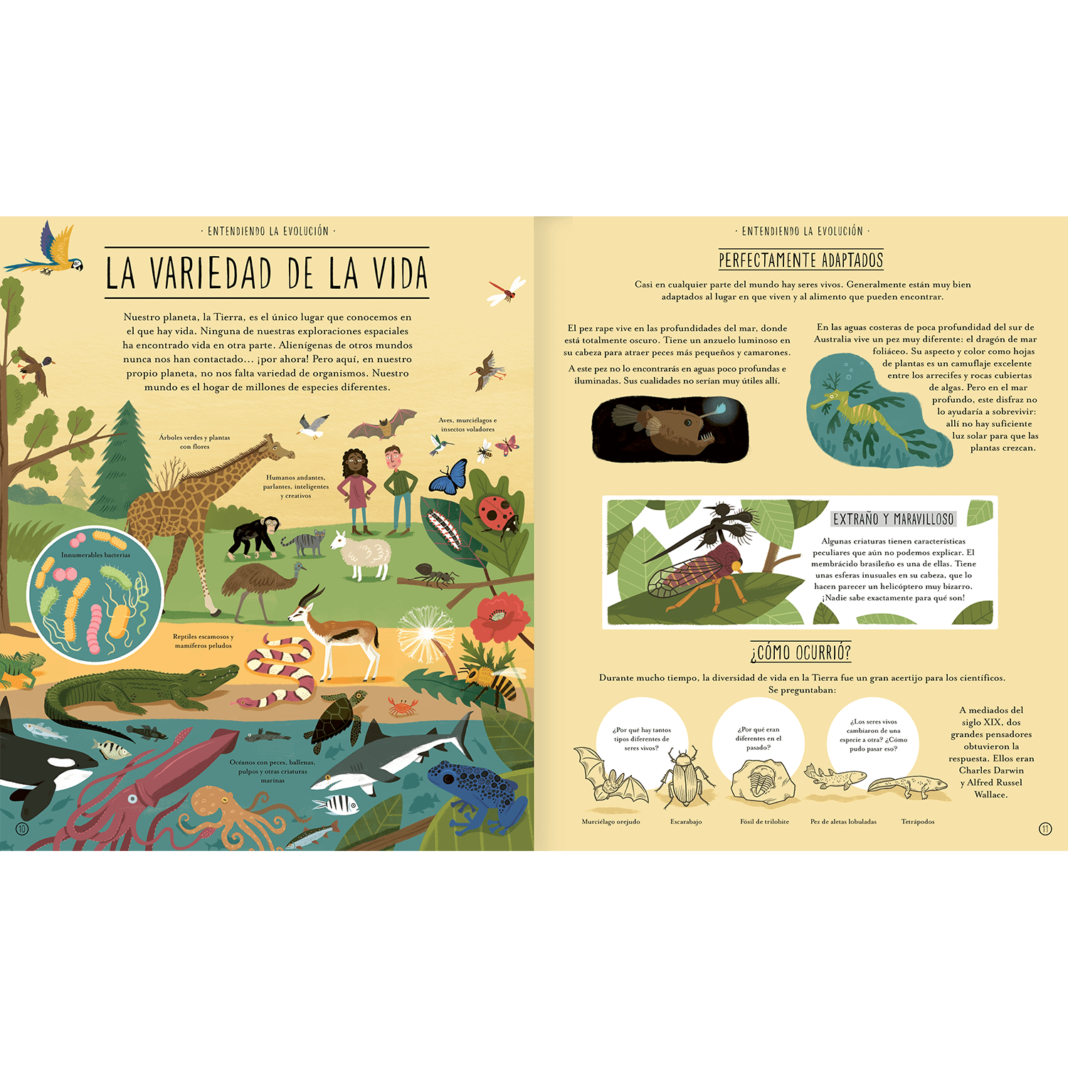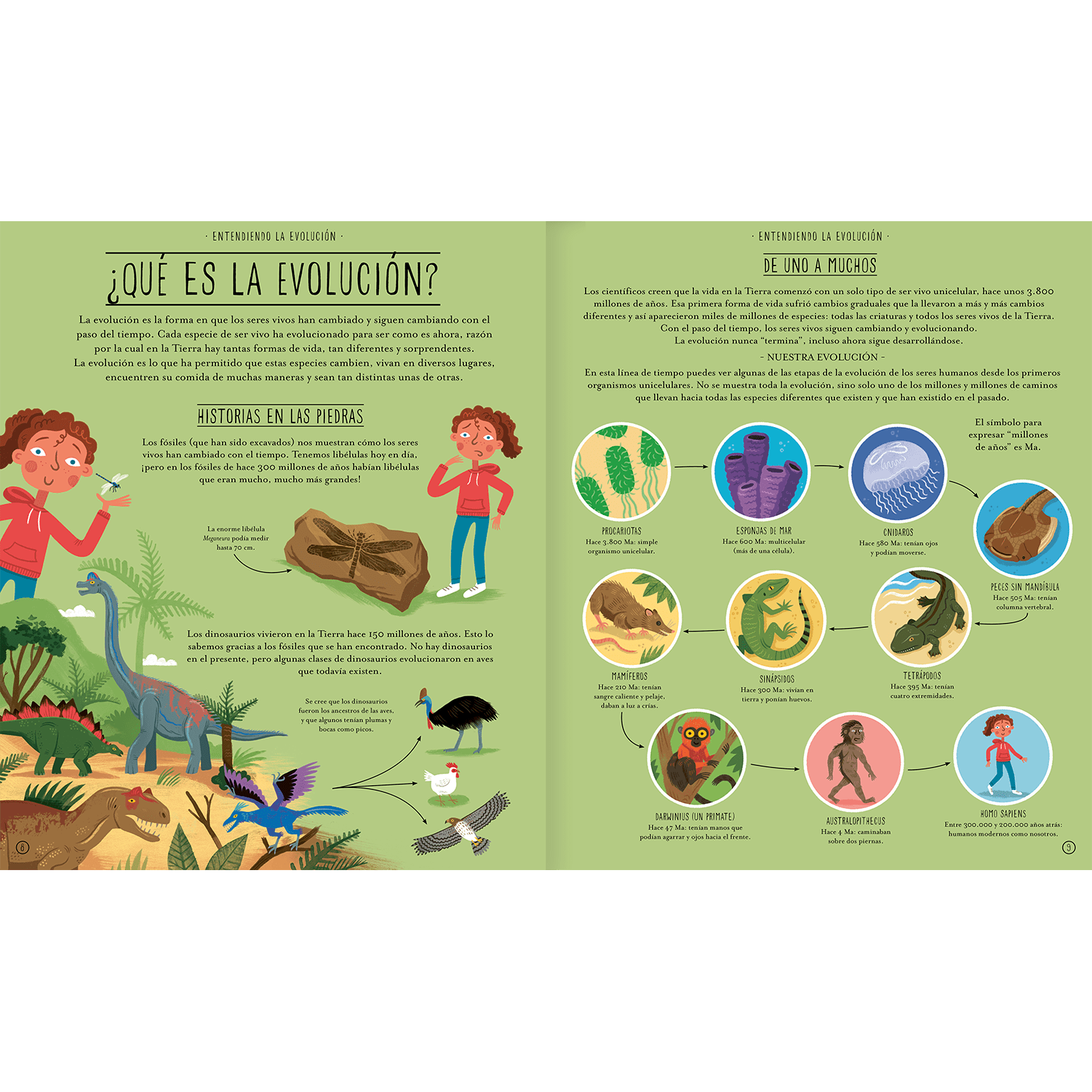 ¿Qué hace que un pez sea un pez? ¿Por qué las jirafas tienen cuellos tan largos? ¿Cómo pueden estar relacionados todos los seres vivos, desde plantas, tigres y hongos a libélulas, pulpos y humanos? La evolución tiene la respuesta a esta y muchas, muchas más preguntas sobre la vida en la Tierra. Este libro explora qué es la evolución, cómo funciona y quién descubrió sus secretos. Enseña el viaje de la vida, desde la primera, y muy simple, forma de vida que se desarrolló en la Tierra hace 3,8 miles de millones de años, ¡hasta los increíbles simios parlantes que habitan en el planeta hoy en día, que conocemos como seres humanos!