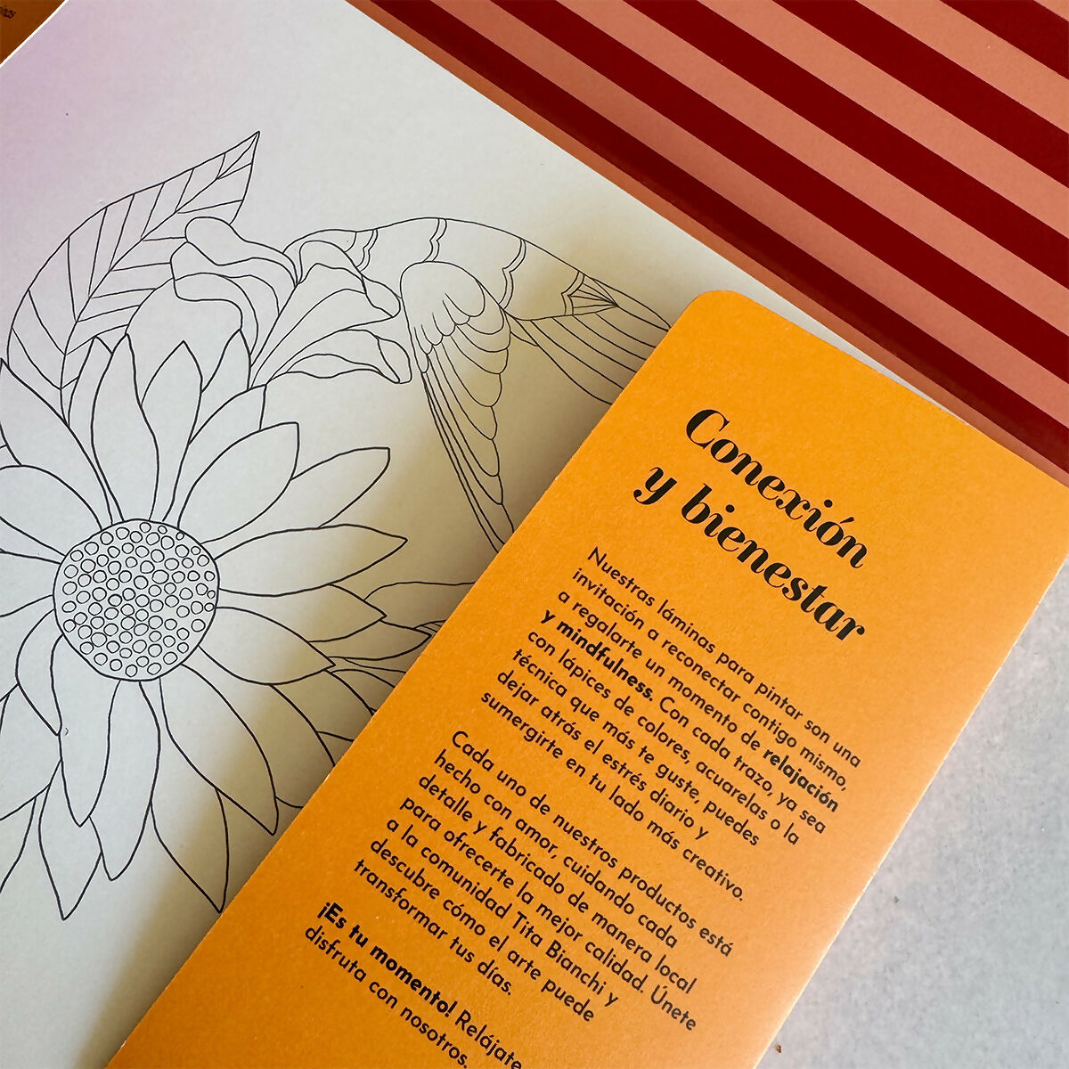 Esta carpeta es un nuevo formato de láminas para colorear de la colección Primavera, con ilustraciones inspiradas en la naturaleza, pájaros, mariposas flores y botánica.