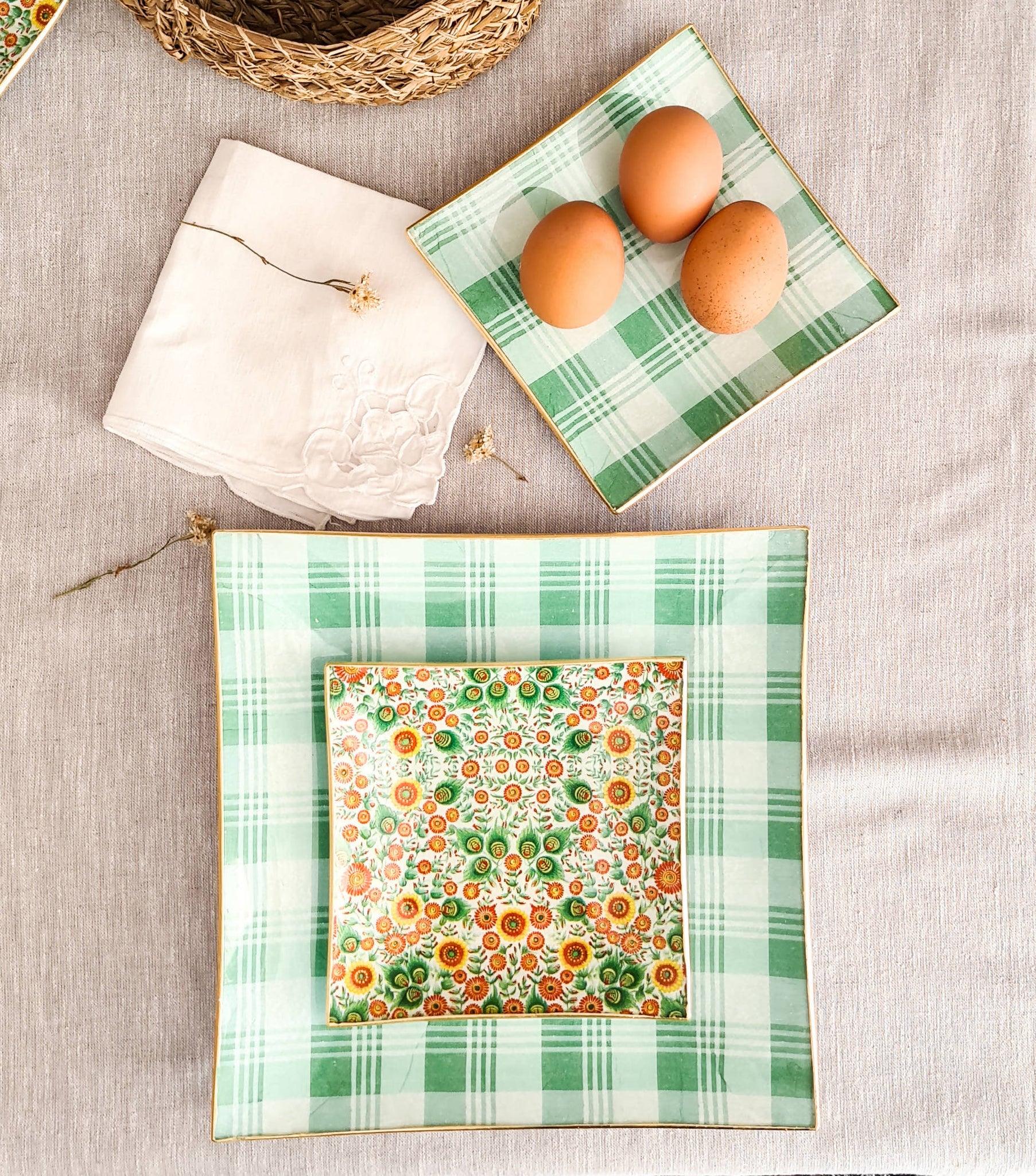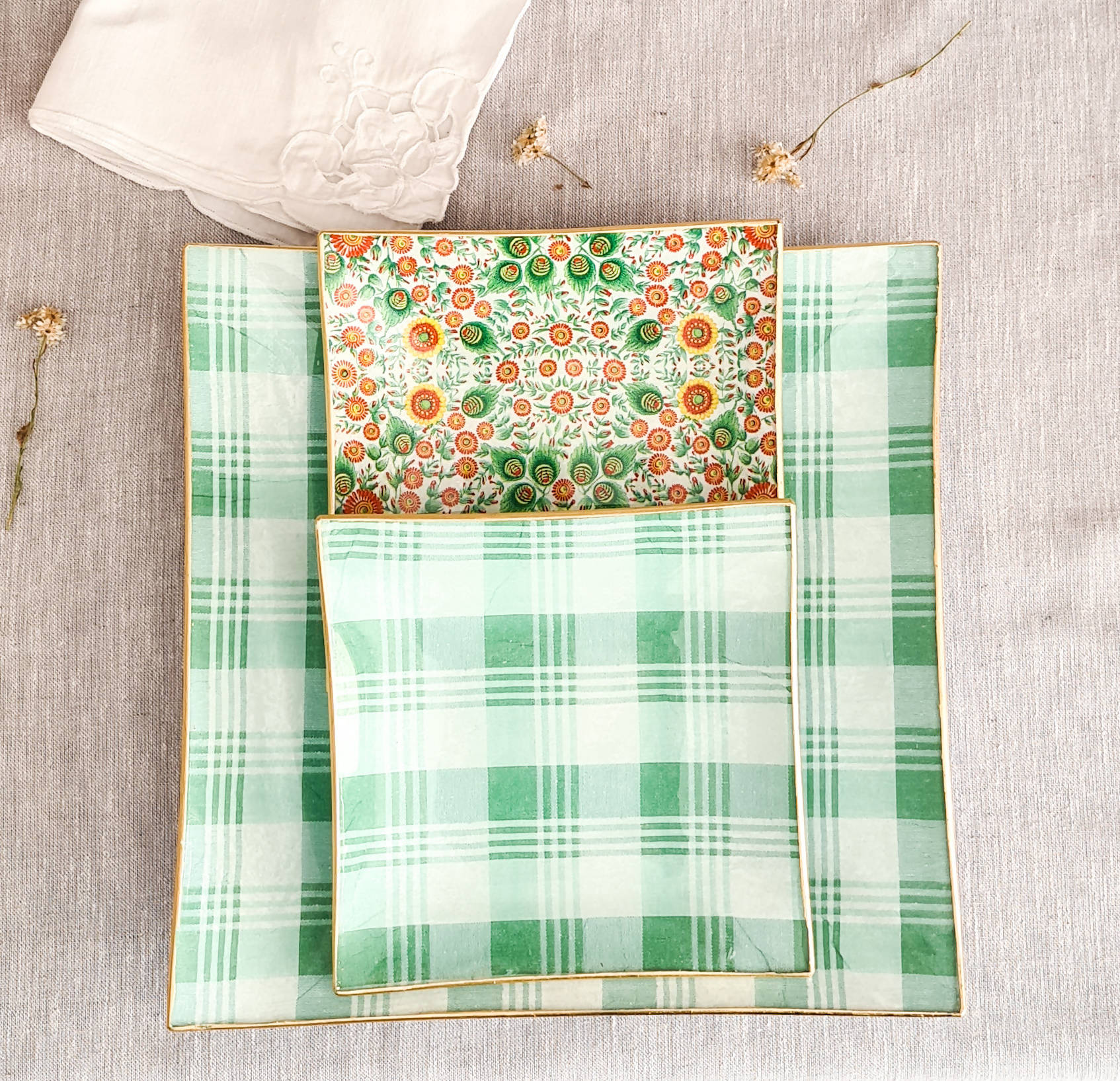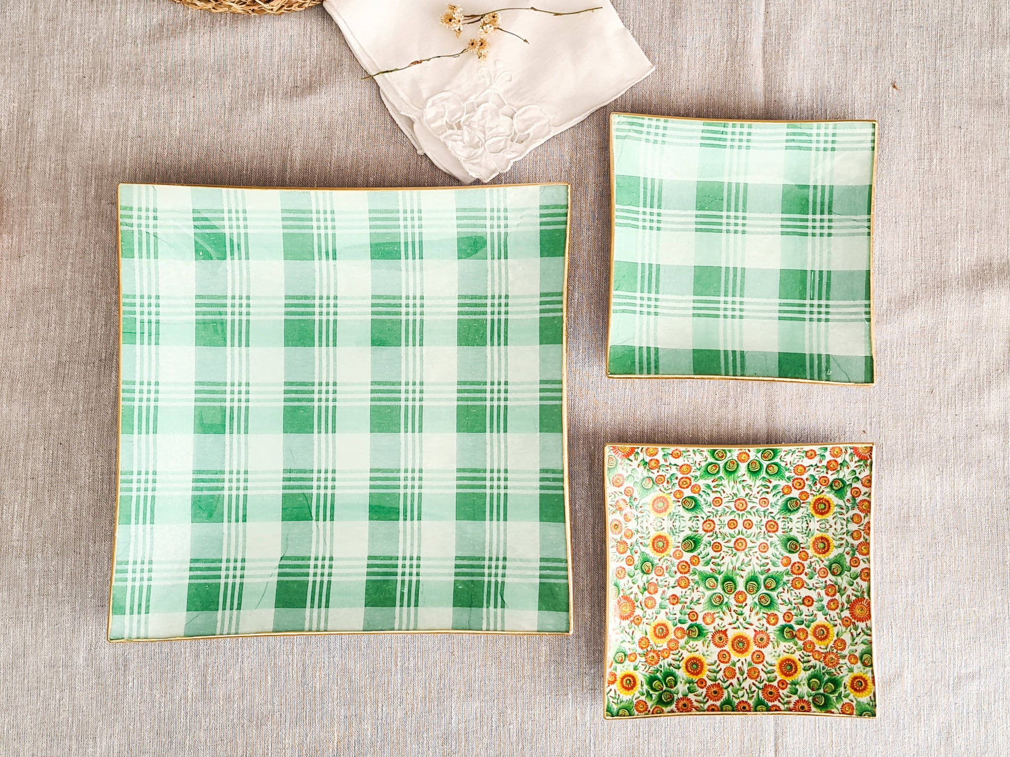 Plato cuadrado de 25 cm, + 2 platos cuadrados de 16 cm, de vidrio templado con tratamiento artesanal de decoupage. Apto para el lavado a mano y para el uso de comidas o elementos calientes sobre la superficie.
