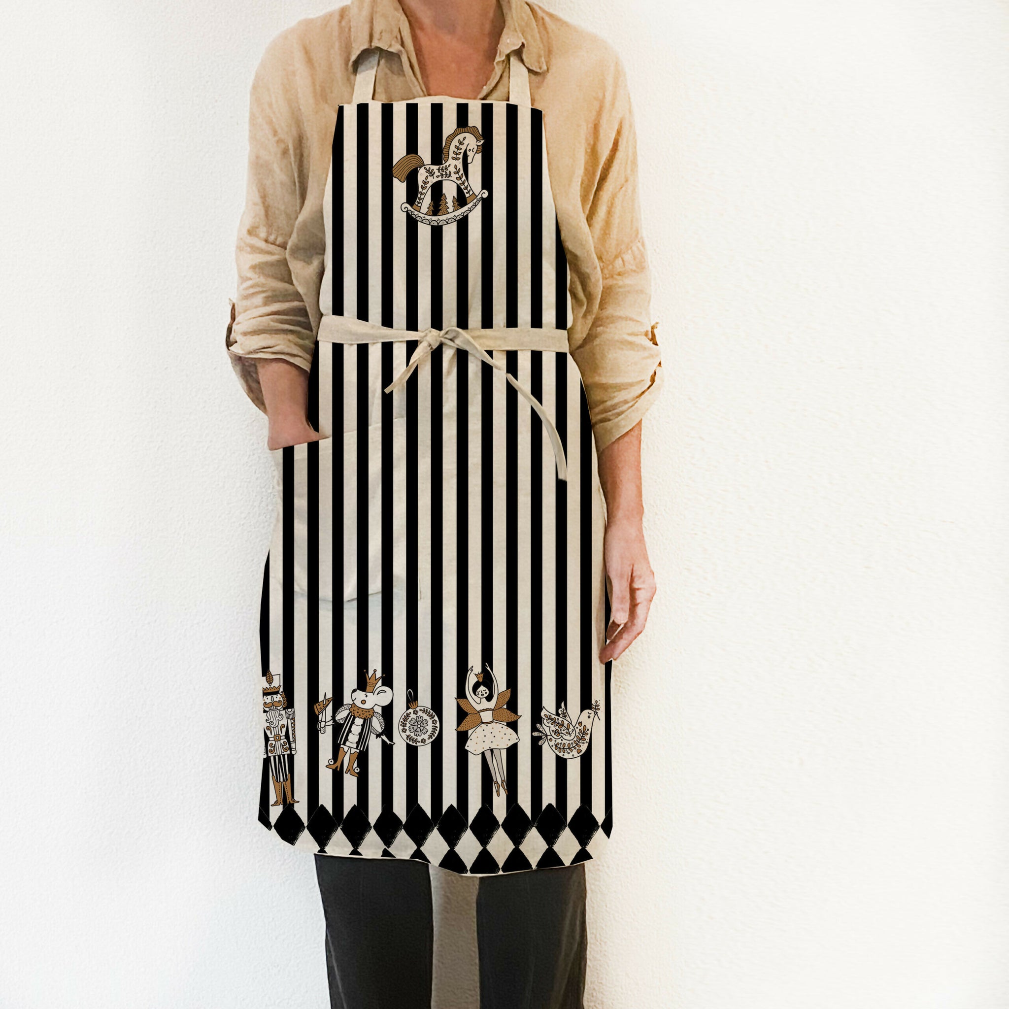 Celebra la Navidad con estilo y practicidad gracias a nuestro Delantal Cascanueces Dorado .Confeccionado en linet estampado, combina diseño único, comodidad y un toque festivo que hará brillar cada momento en la cocina o al compartir con tus seres queridos.