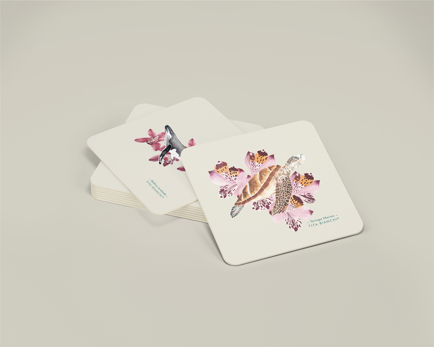 Pack de 6 posavasos inspirados en el mundo marino, con ilustraciones pintadas en acuarela. Lavables.