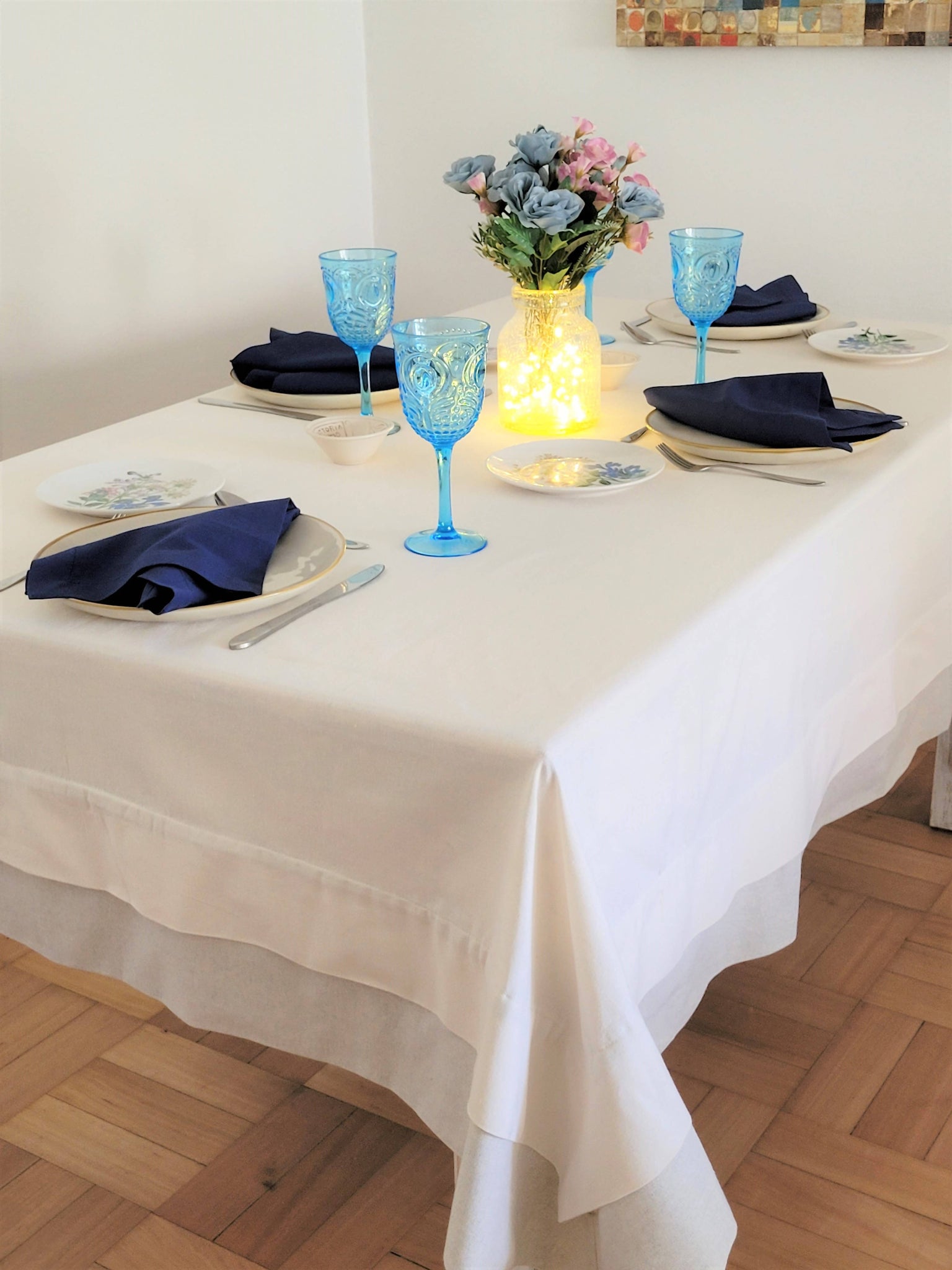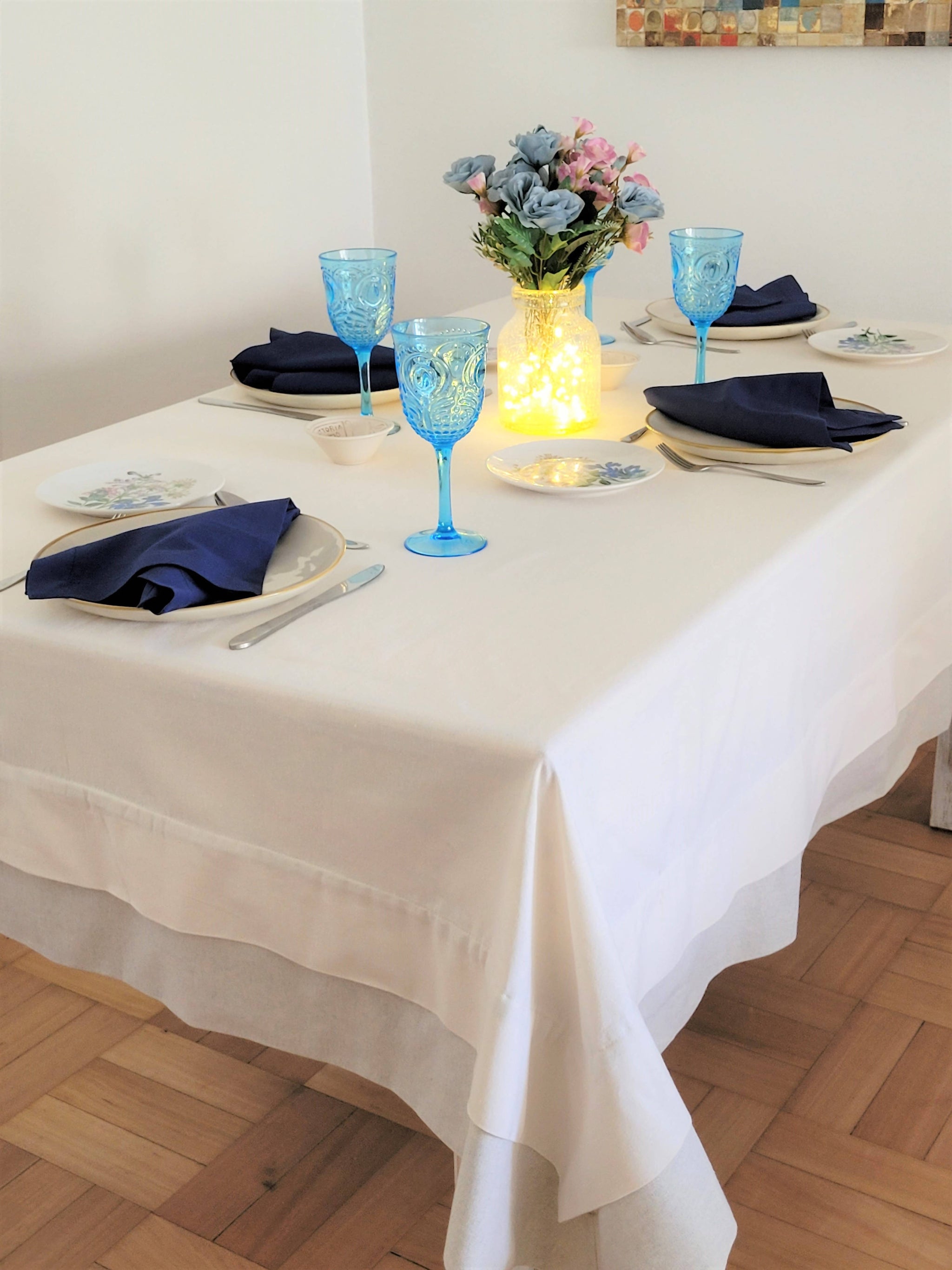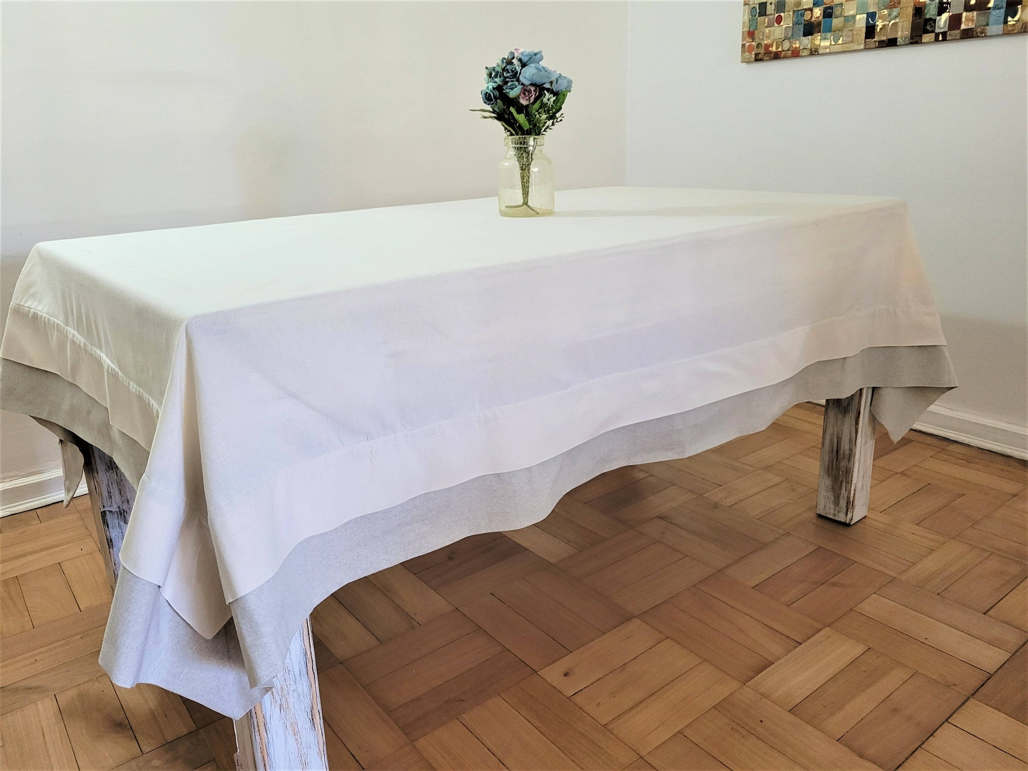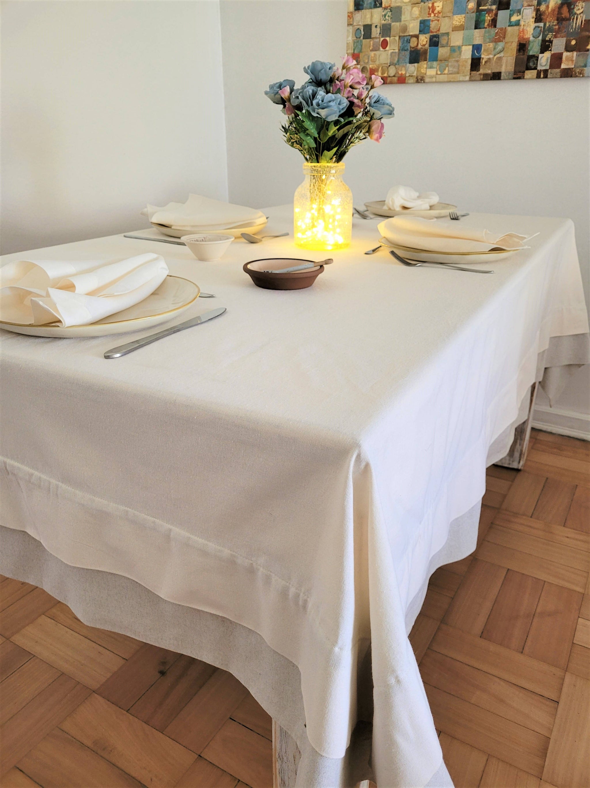 Precioso mantel de lino español de color blanco invierno con una doble costura en sus puntas de color masilla, que le da un toque distinto y original a tu mesa.