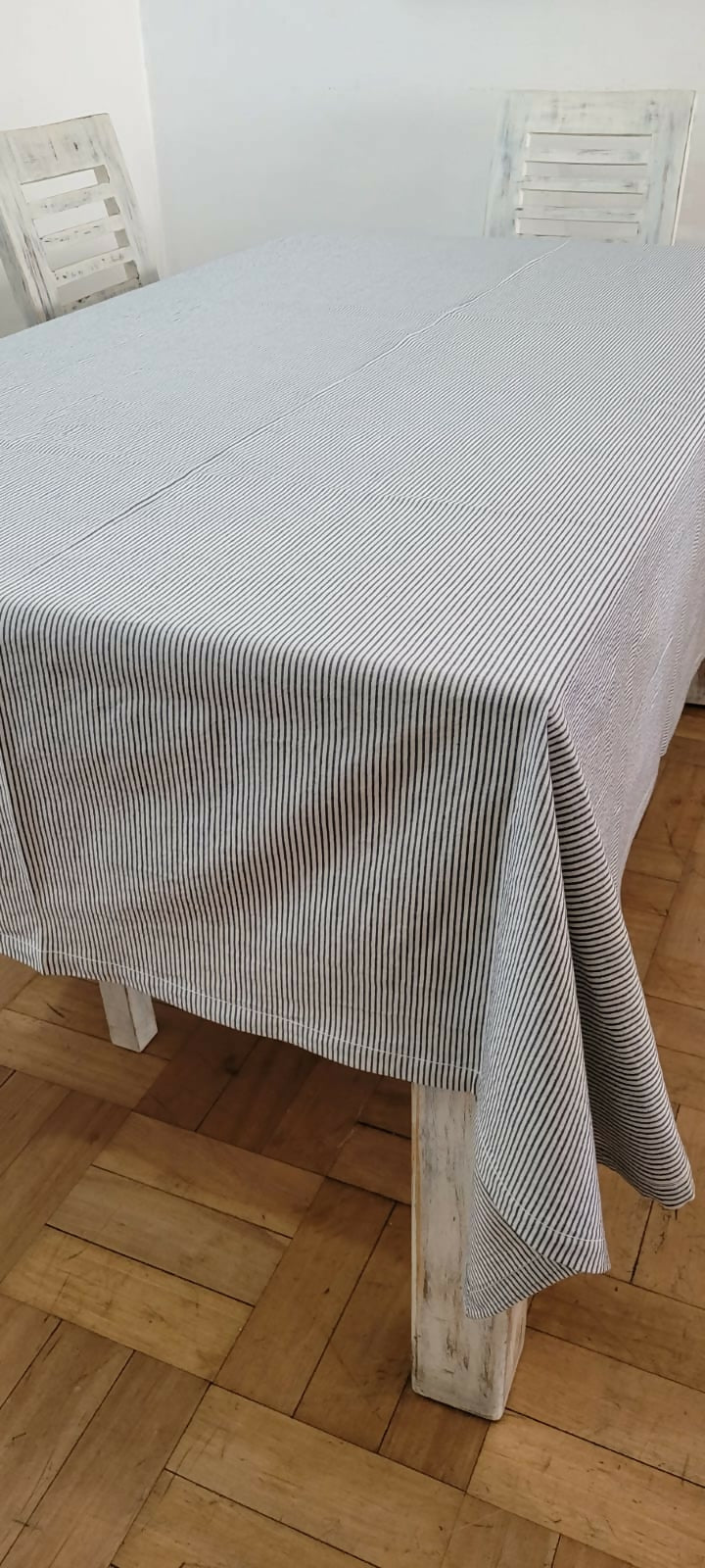 Precioso mantel rayado finito azul con blanco, en tela Tusor, 100% algodon.