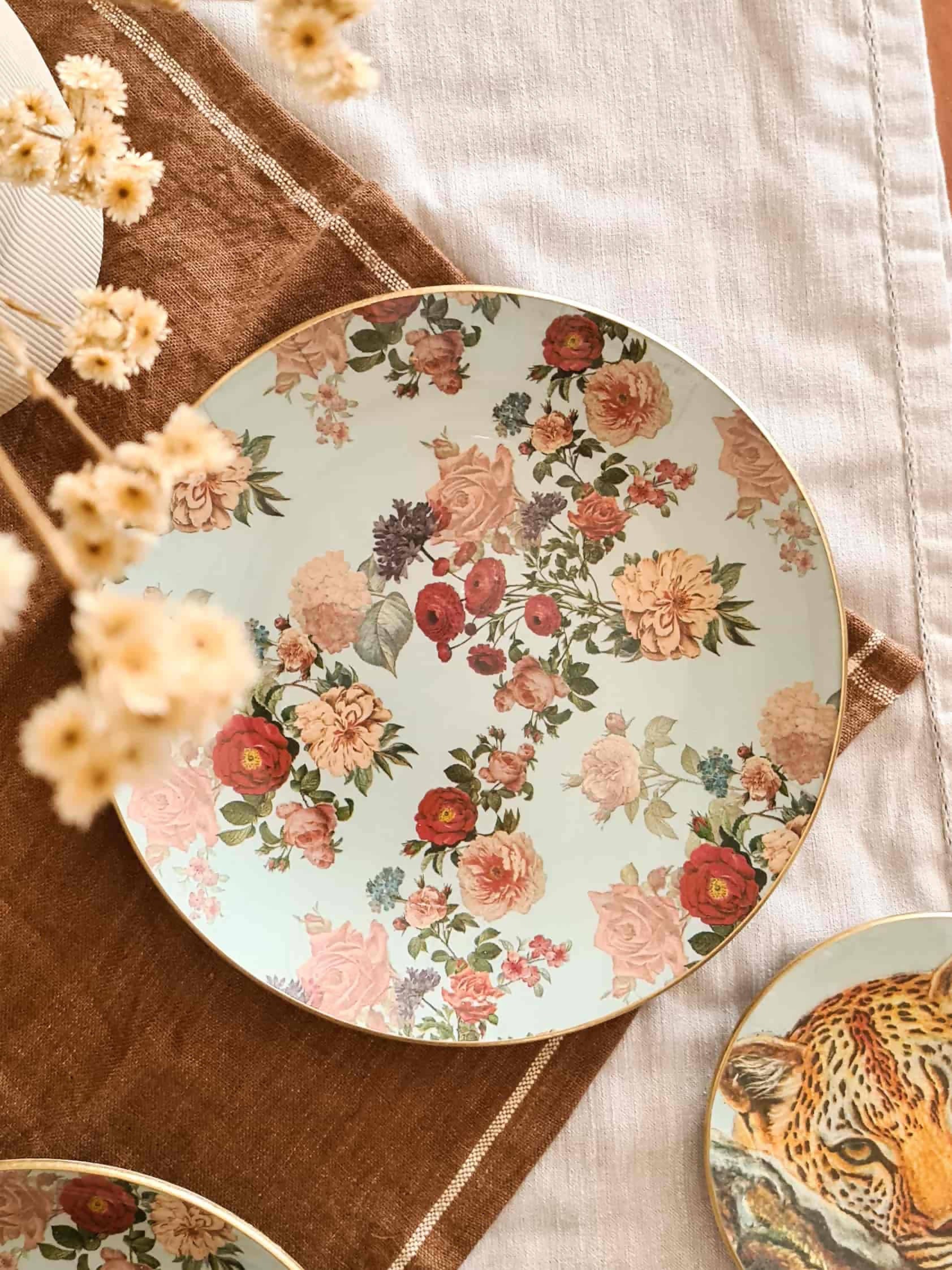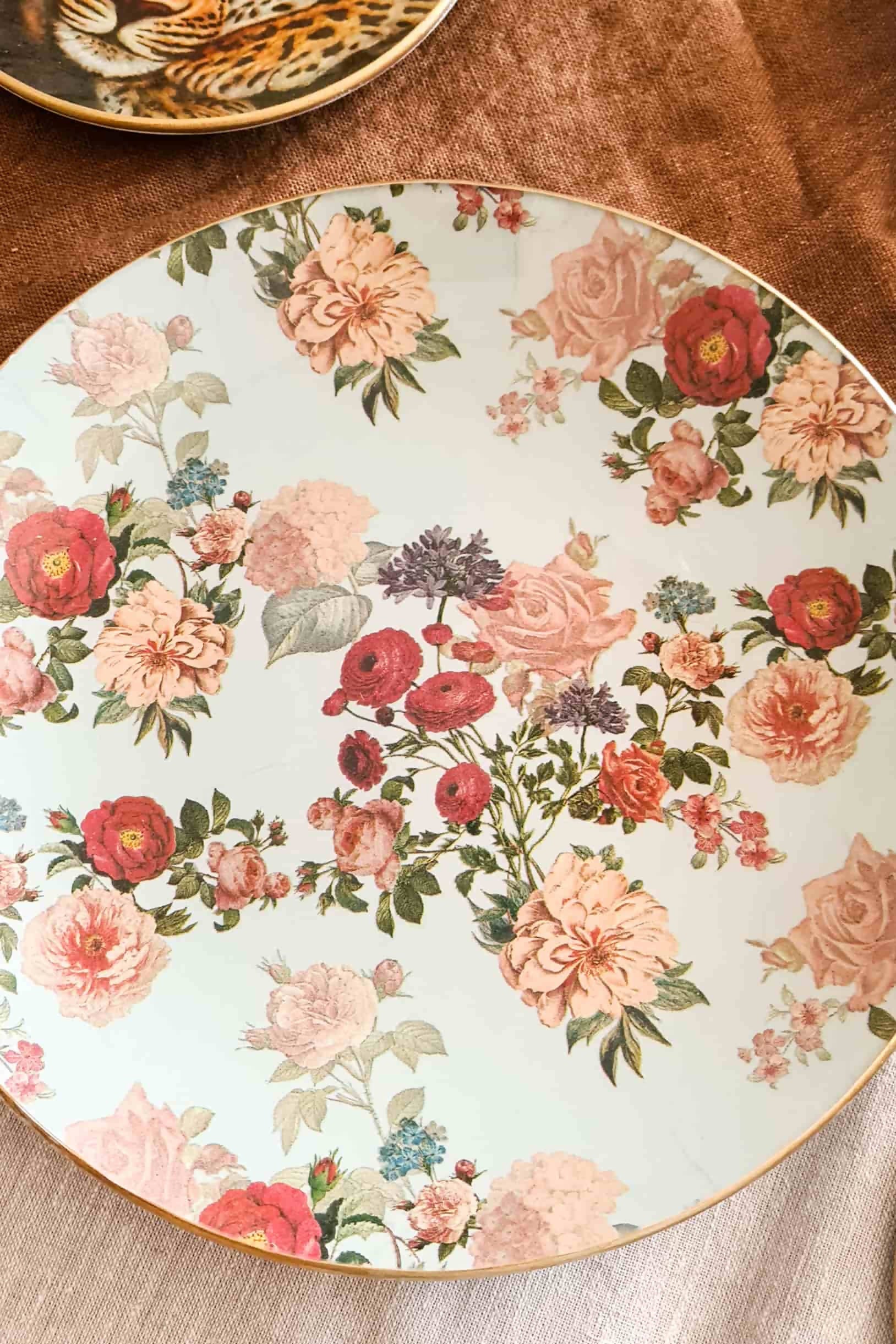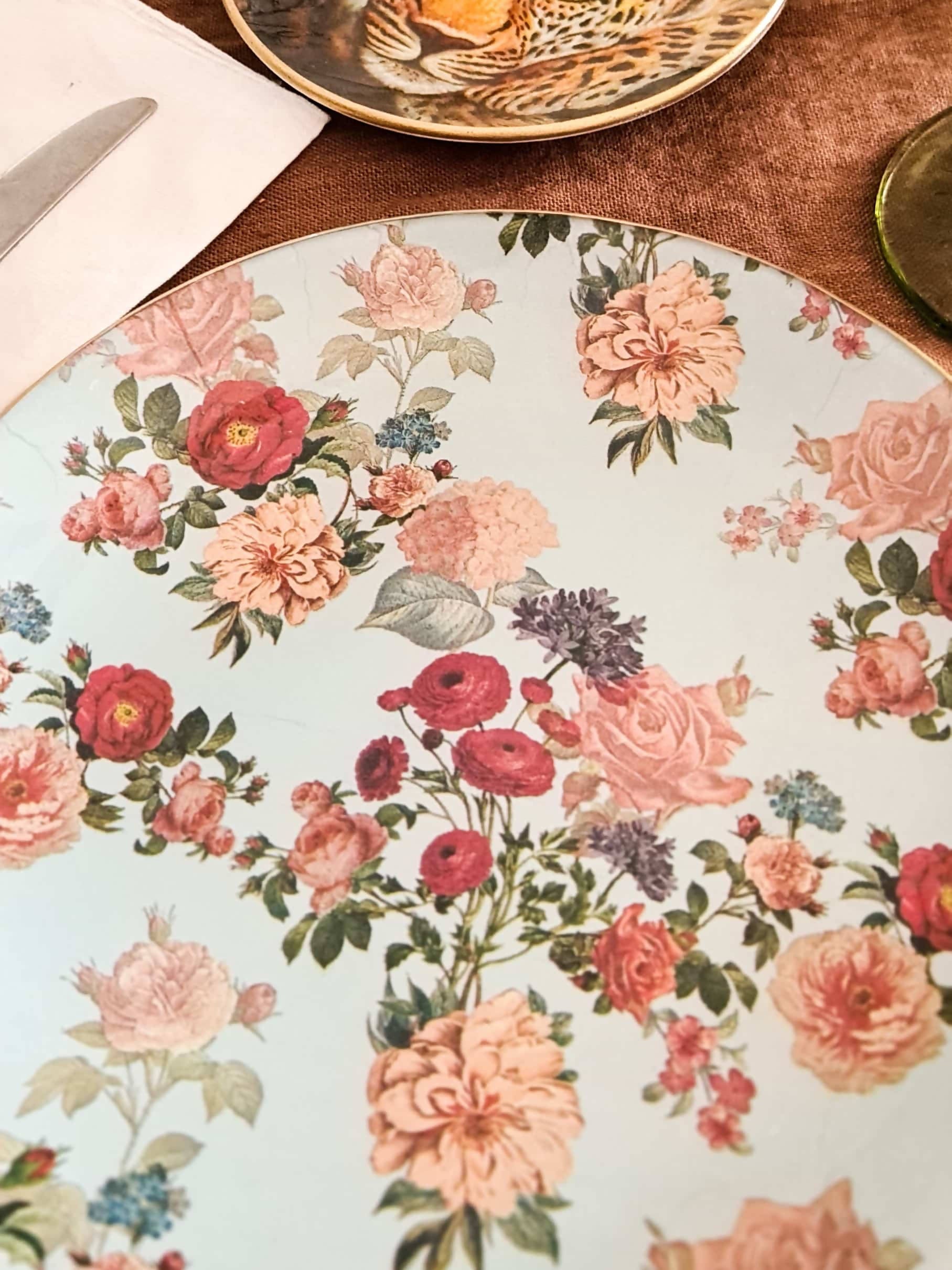 Plato redondo de vidrio templado de 25 cm, con tratamiento artesanal de decoupage. Apto para el lavado a mano y para el uso de comidas o elementos calientes sobre la superficie.