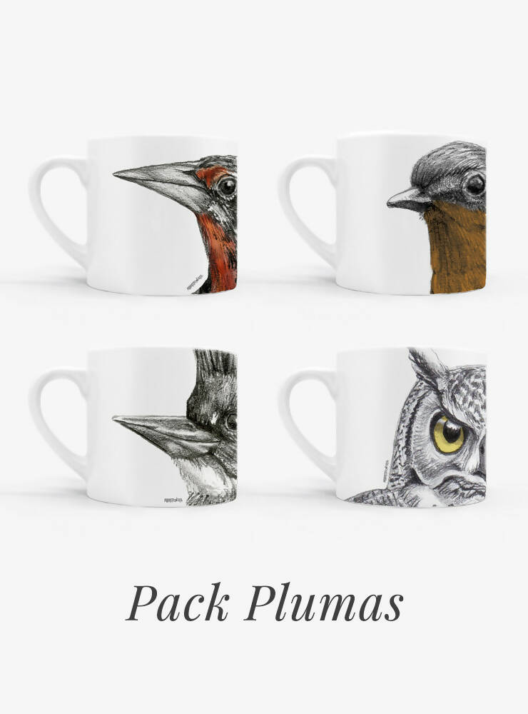 Set 4 tazas 6 onzas PLUMAS: Martín pescador, chucao, loica, tucúquere
