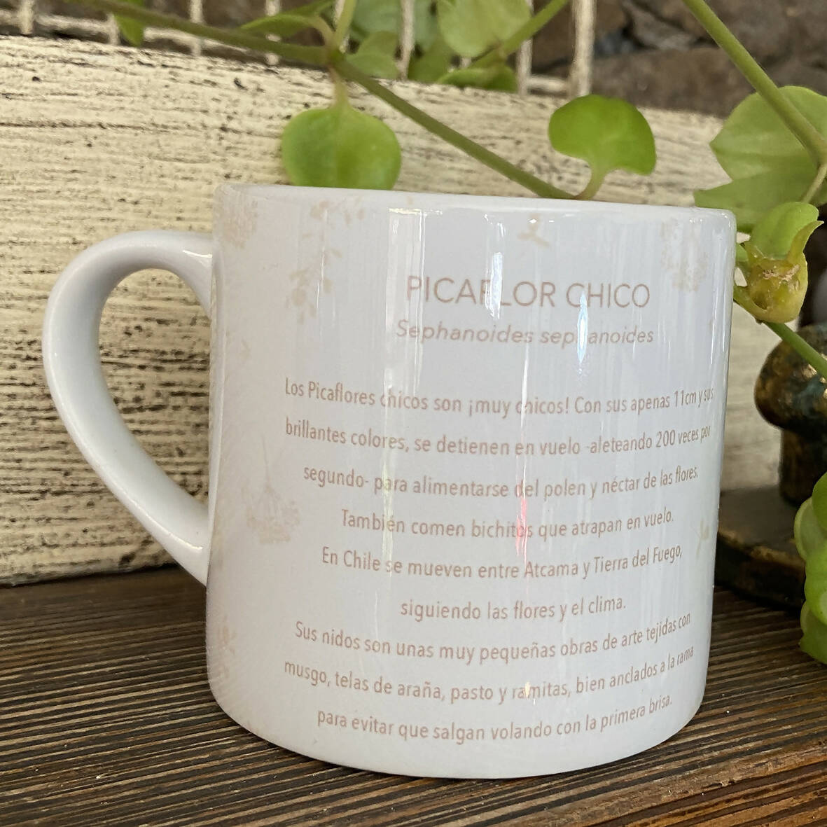 - Ilustraciones originales: Cada taza presenta en un lado la imagen de un ave chilena, mientras que en el otro encontrarás una breve descripción de sus características y peculiaridades.