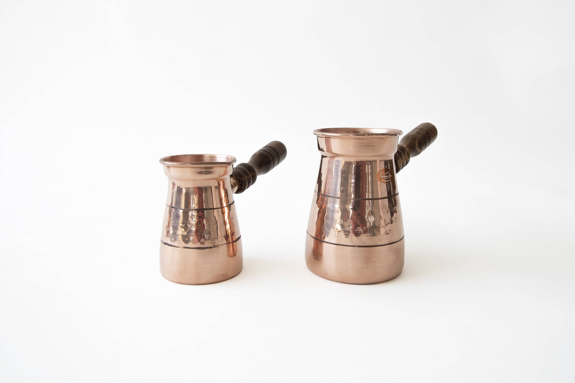 Set de Cafeteras Turcas de cobre dos tamaños.Presentación estuche papelería negro a medida. cafetera Pequeña sirve para dos café expresso y cafetera grande pueden alcanzar 8 tacitas cafe expresso.
