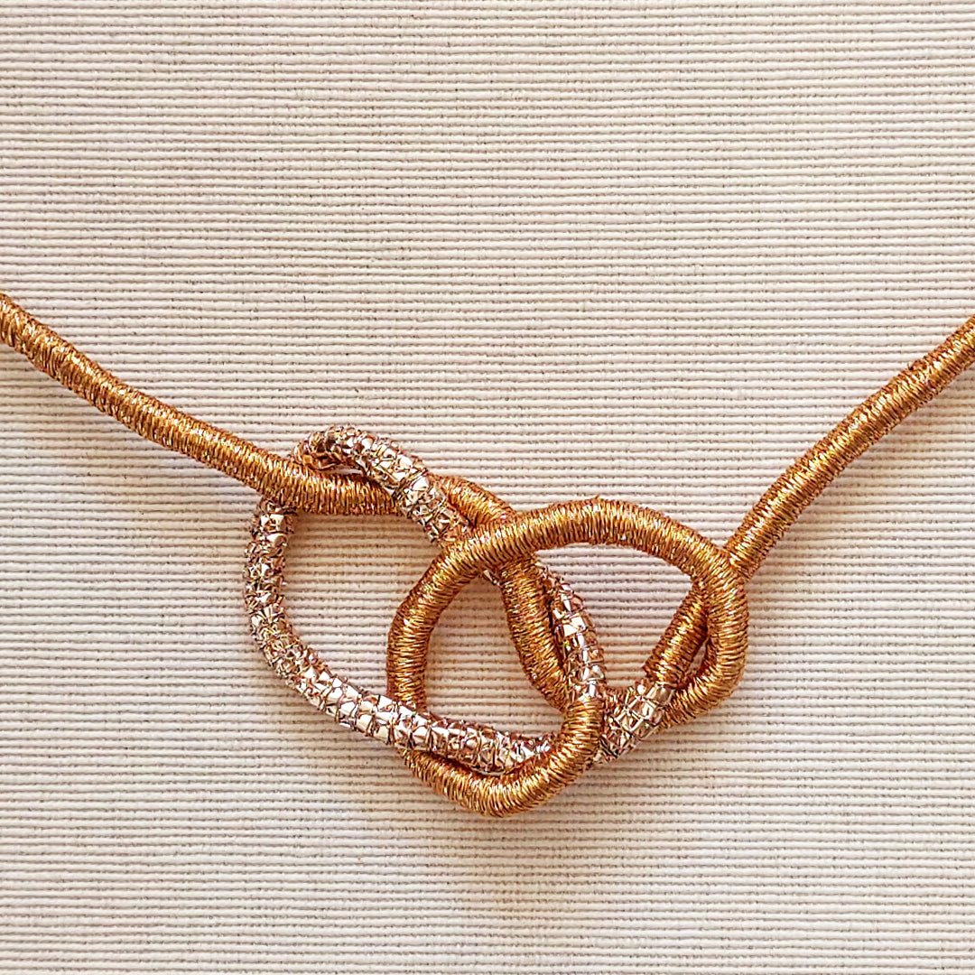 Collar de joyería textil hecho a mano con técnica de embarrilado. En tonalidad cobre, es una pieza de diseño de autor donde el hilo se convierte en joya, destacando por su liviandad y brillo sutil.