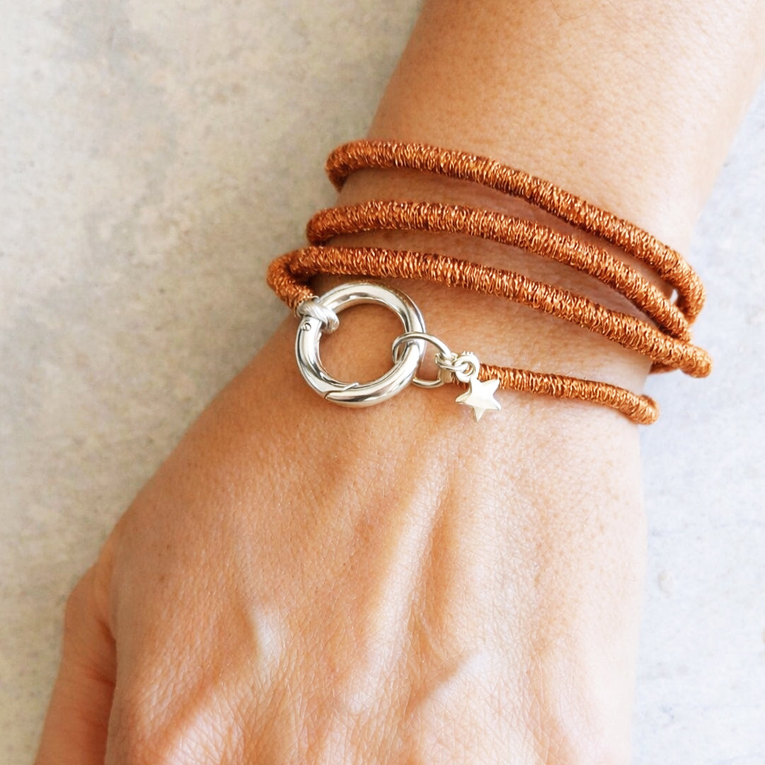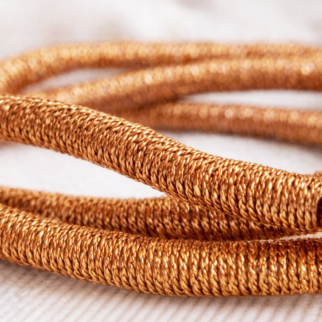 Joya textil elaborada a mano con técnica de embarrilado. En tonalidad cobre, es una pieza de diseño de autor donde el hilo se convierte en joya. Hecha a mano con hilo metalizado de brillo sutil, incorporando detalles de cierres y dijes en plata. Gracias a su diseño adaptable, puede utilizarse tanto como pulsera envolvente como collar, permitiendo distintas formas de uso. Materiales: Hilo metalizado, cierres y dijes en plata. Cuidados: Evitar contacto con agua y perfumes. Guardar en lugar seco. Los componentes metálicos pueden variar levemente su color con el tiempo así como la tonalidad los hilados pueden variar sutilmente. Diseñado y confeccionado en Chile por ENLAZADA. |