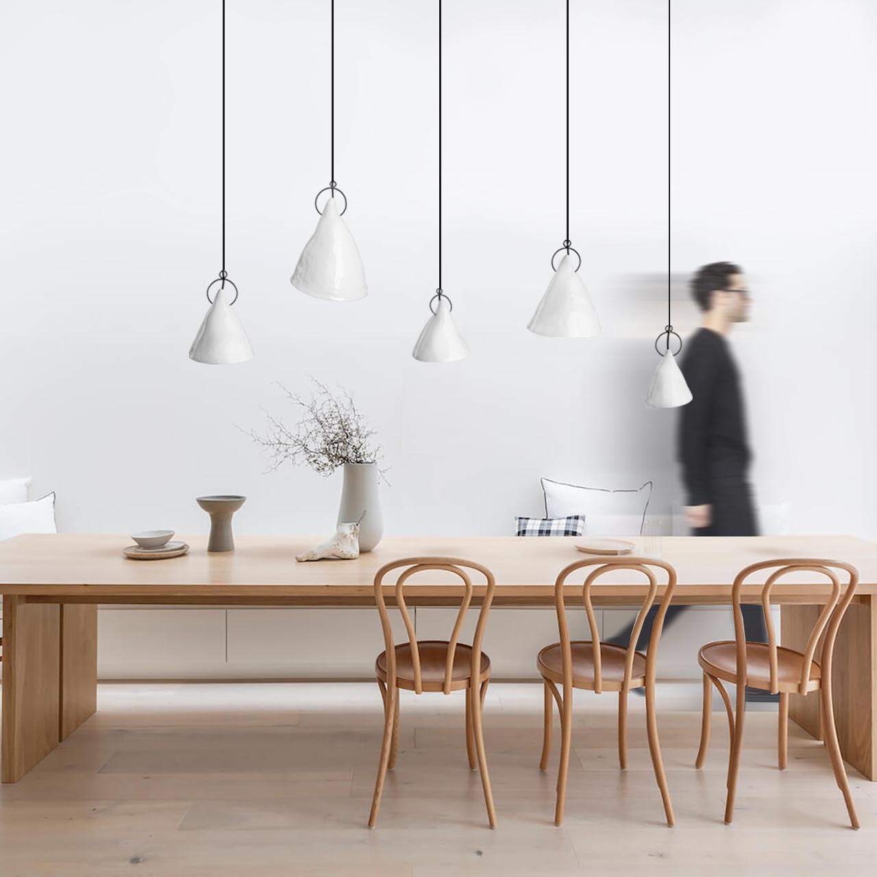 Materialidad: Pantalla cerámica y cable textil liso negro (130 cm). Los tamaños M-L y XL llevan un cable paralelo de acero para su suspensión