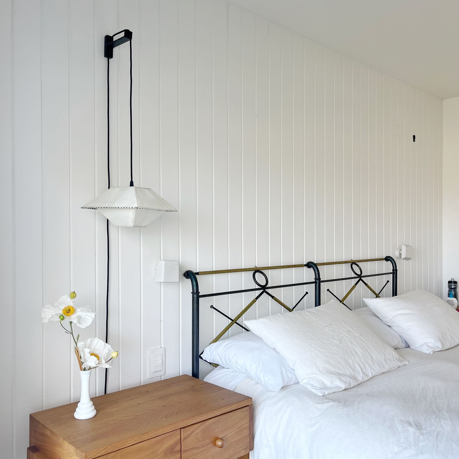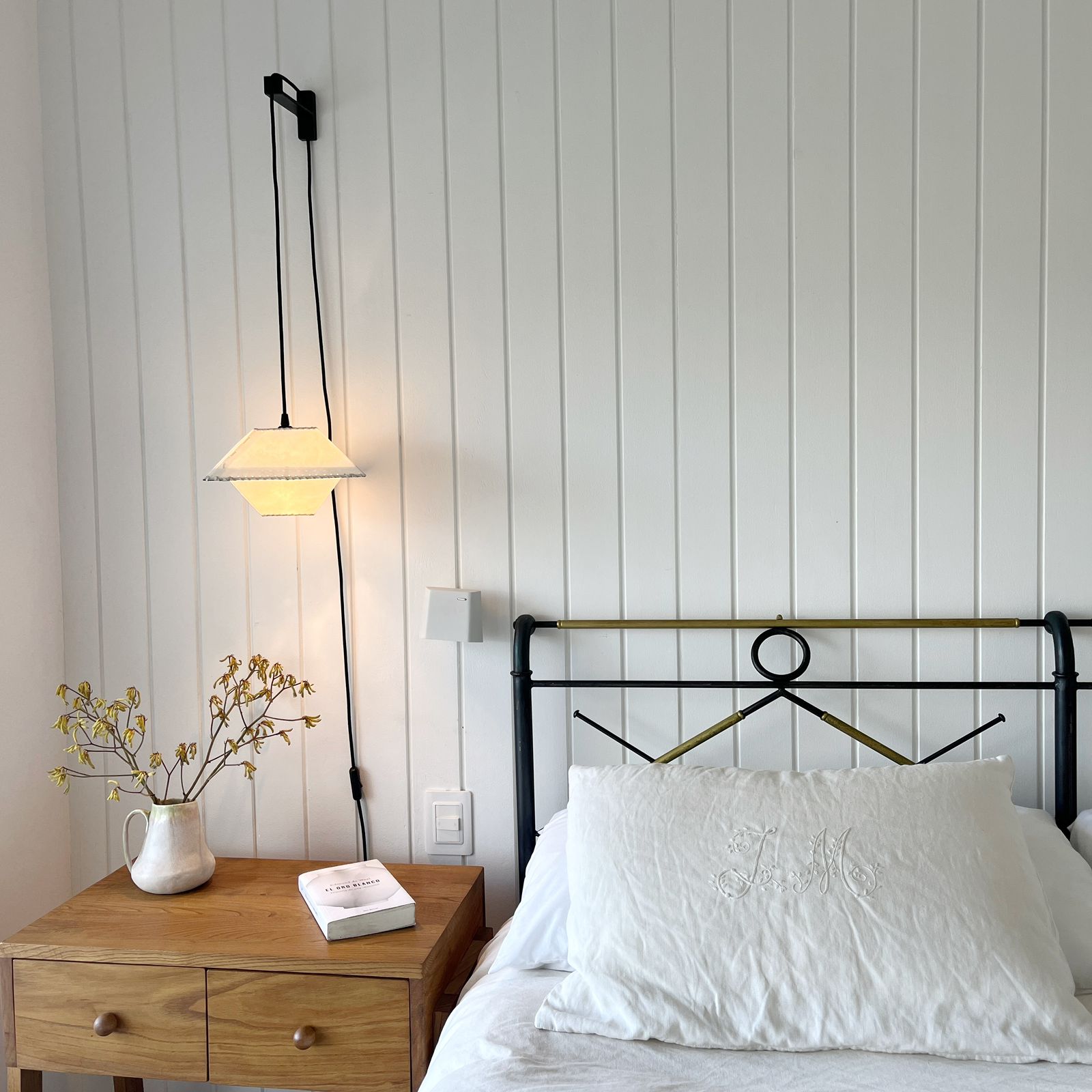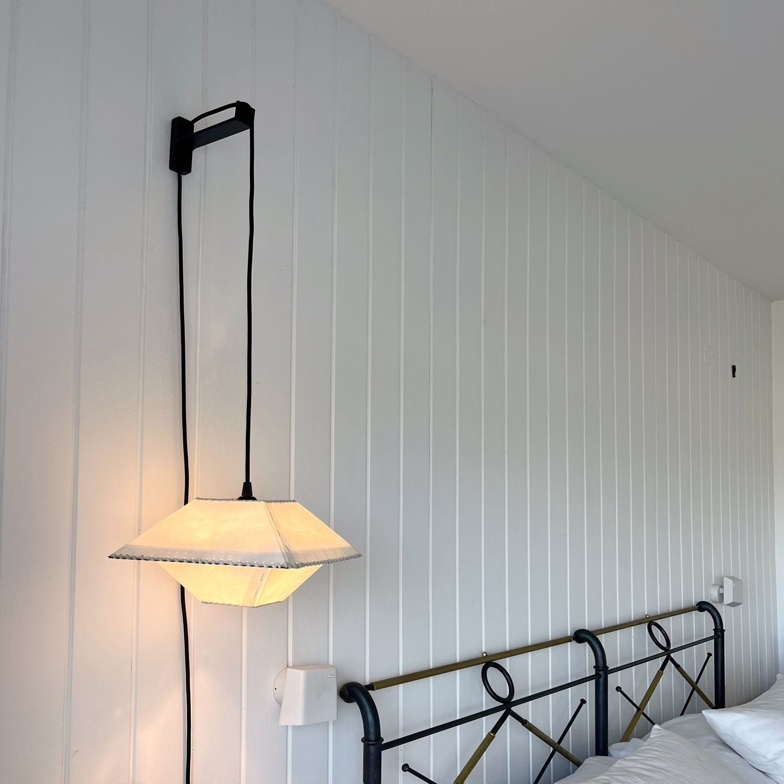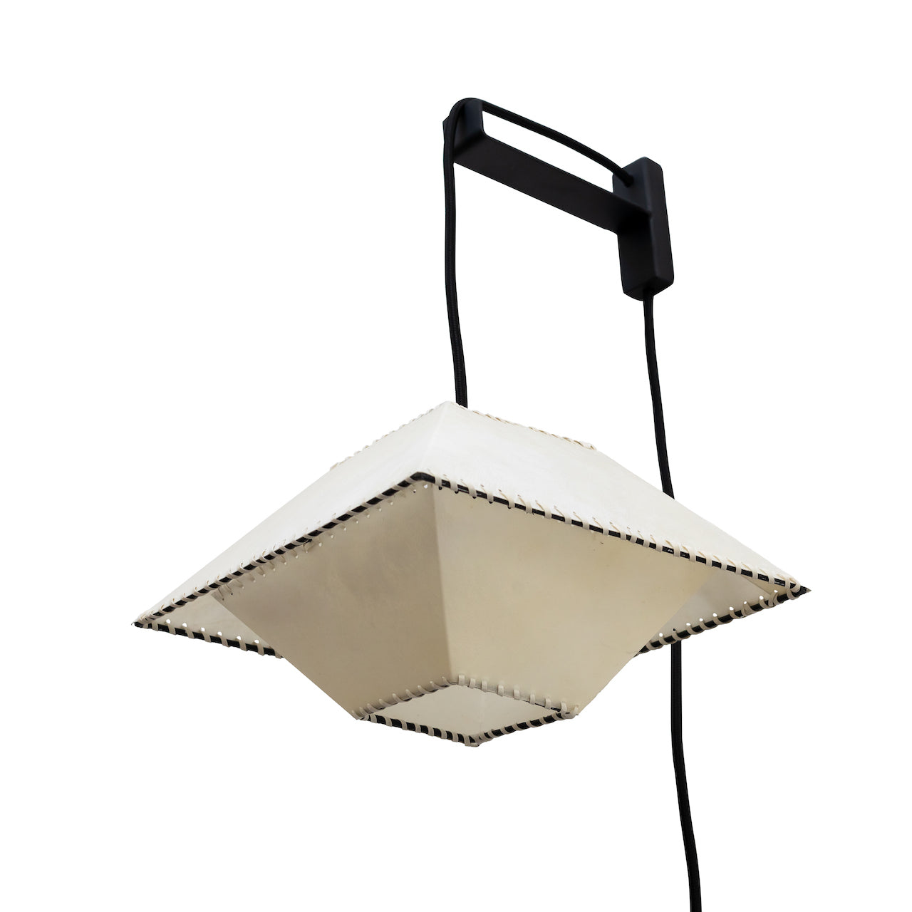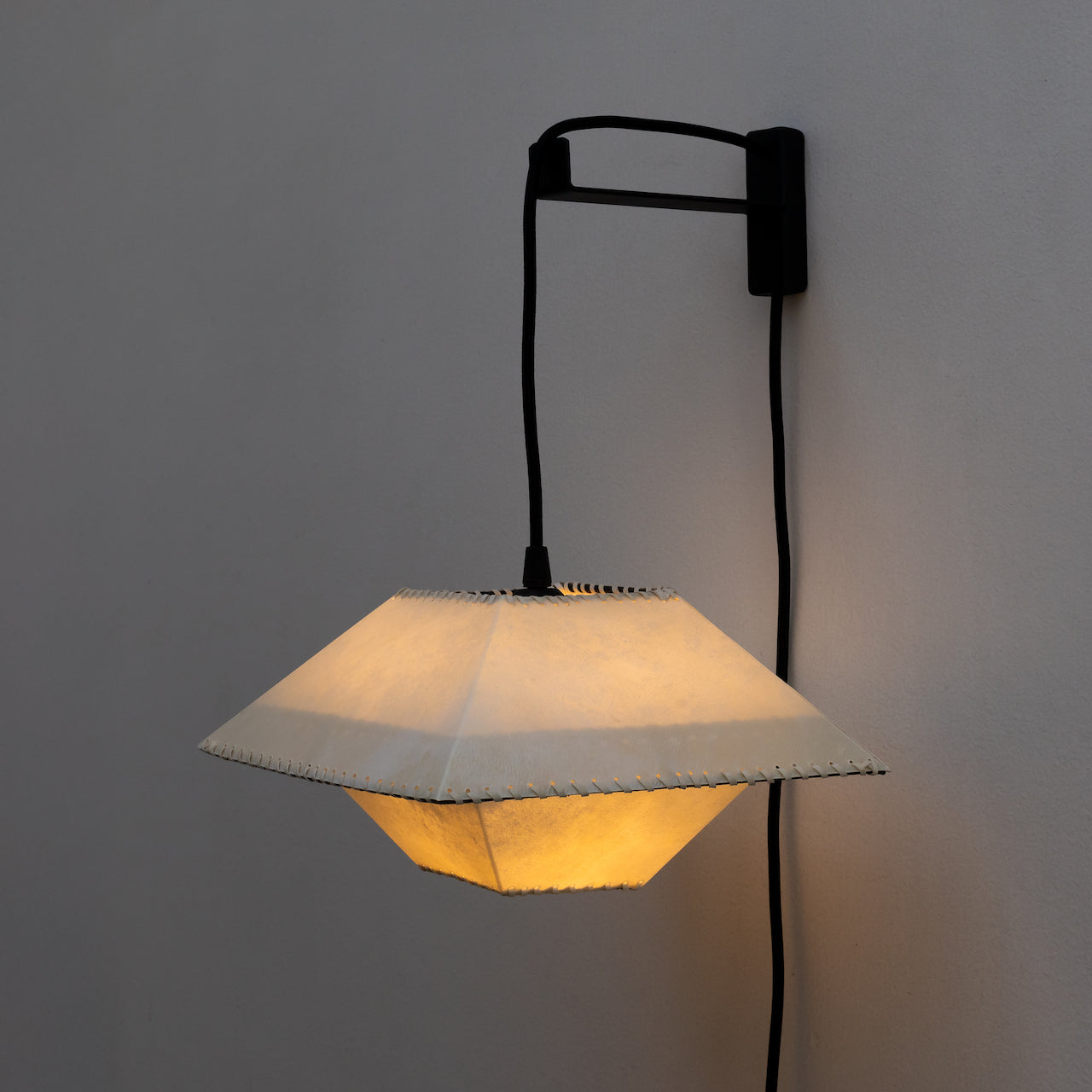 Materialidad: Pantalla pergamino y cable textil liso negro (300 cm)