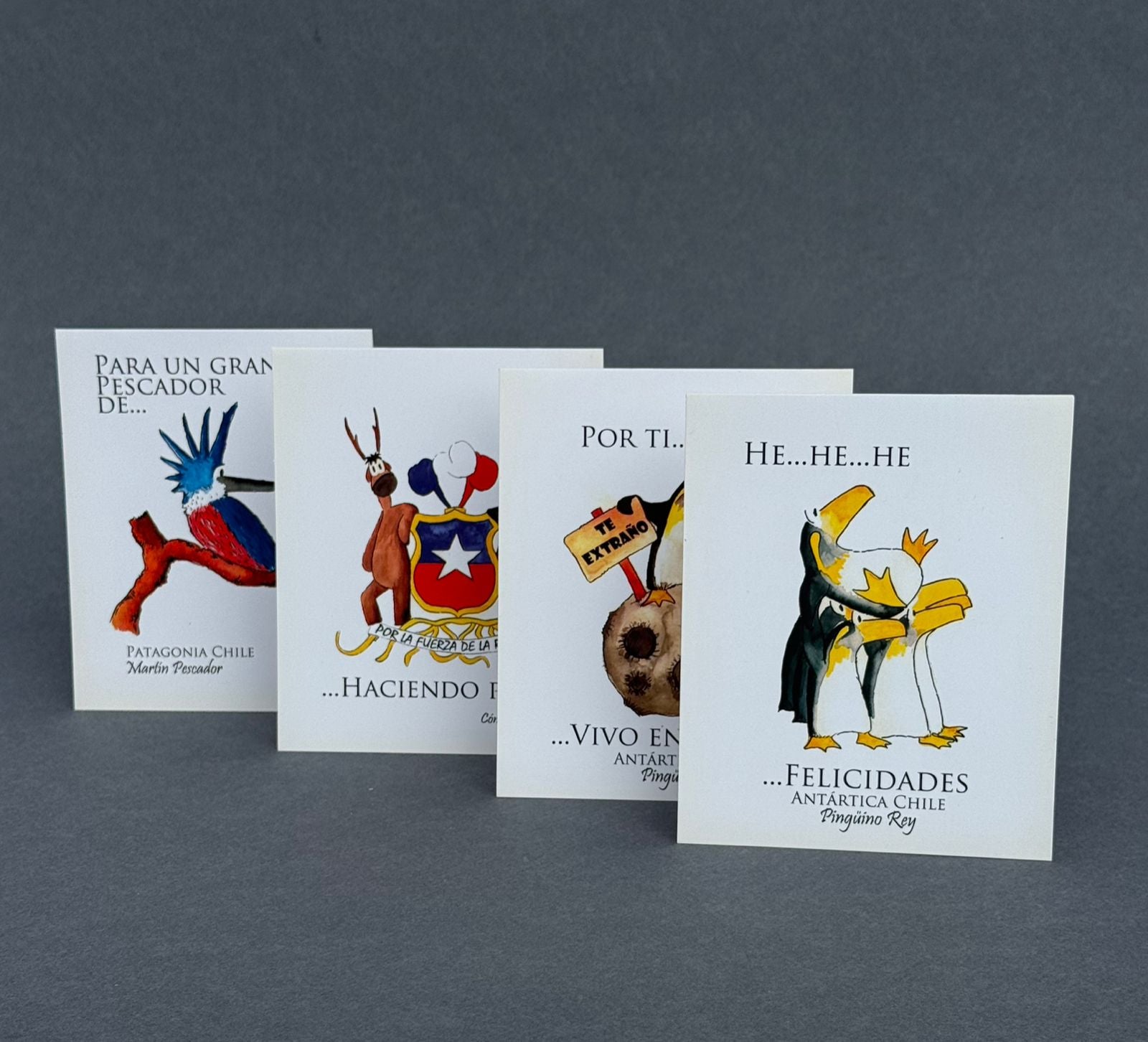 Una forma original, encantadora y con sentido de saludar a quienes más quieres. Cada tarjeta presenta una ilustración exclusiva hecha en acuarela por Chile-Souvenir, inspirada en el patrimonio natural y cultural de nuestro país, con un estilo artístico lleno de humor, ternura y carácter local.