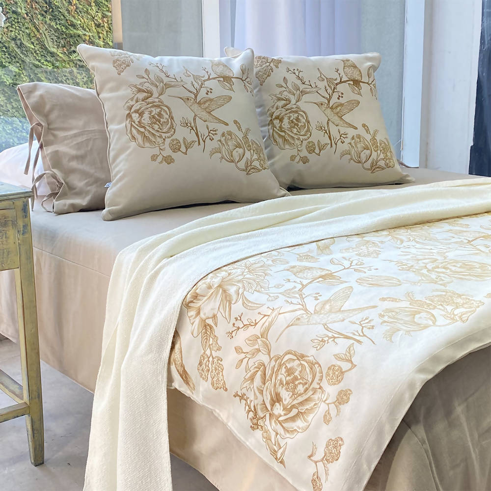 Dale un estilo sofisticado y acogedor a tu dormitorio con esta Piecera y cojines de suave textura en velvet crudo, estampada.