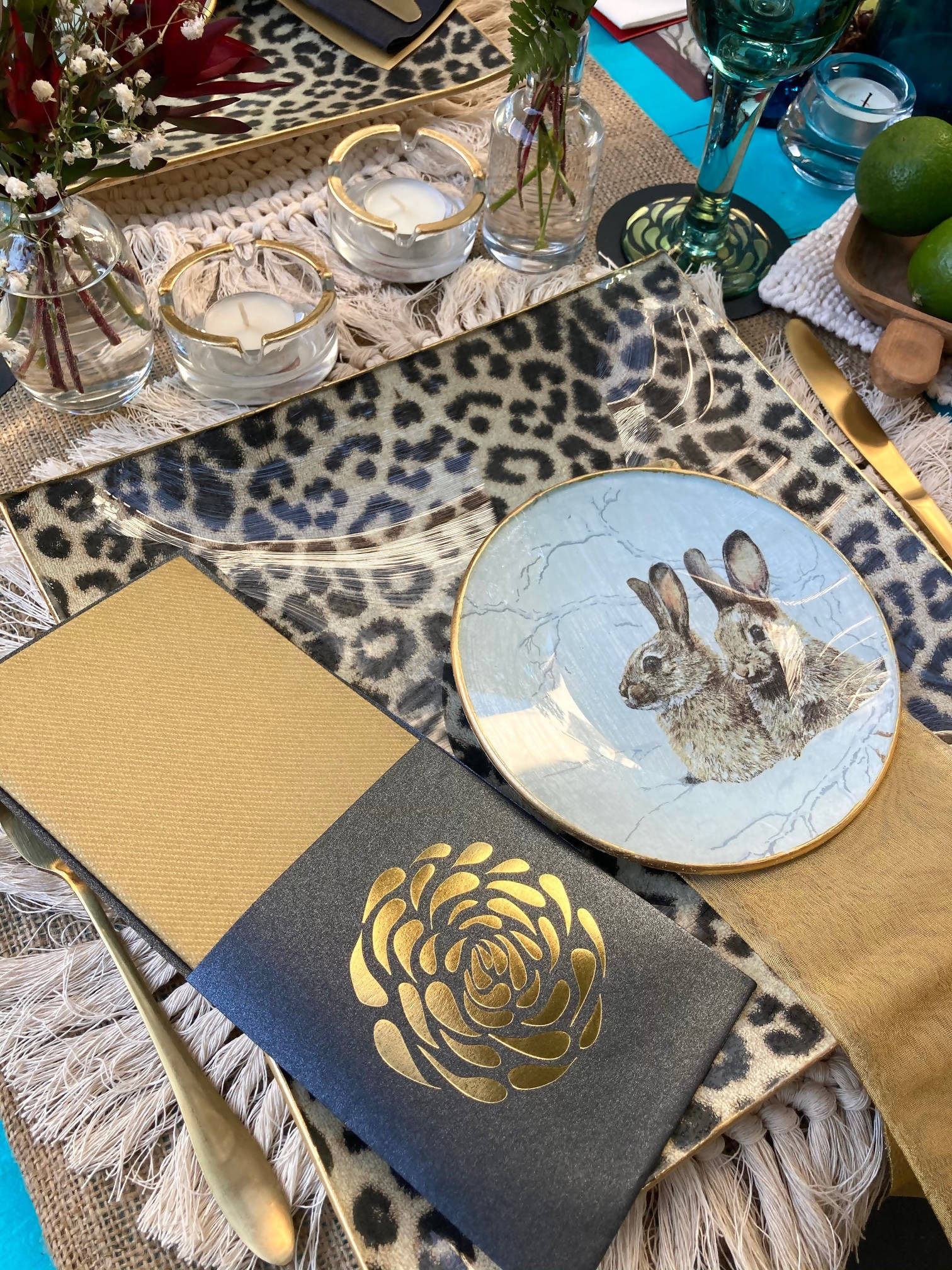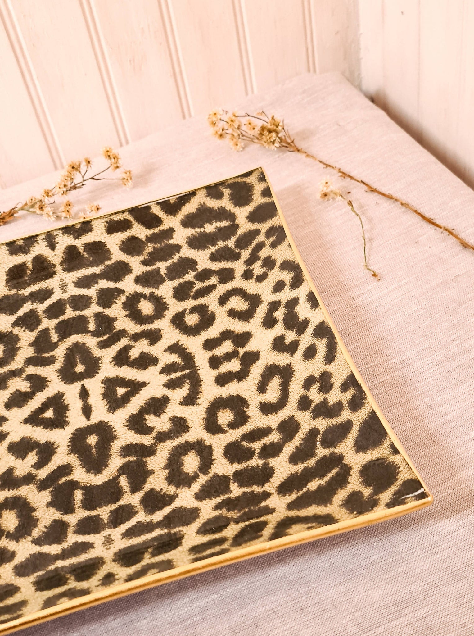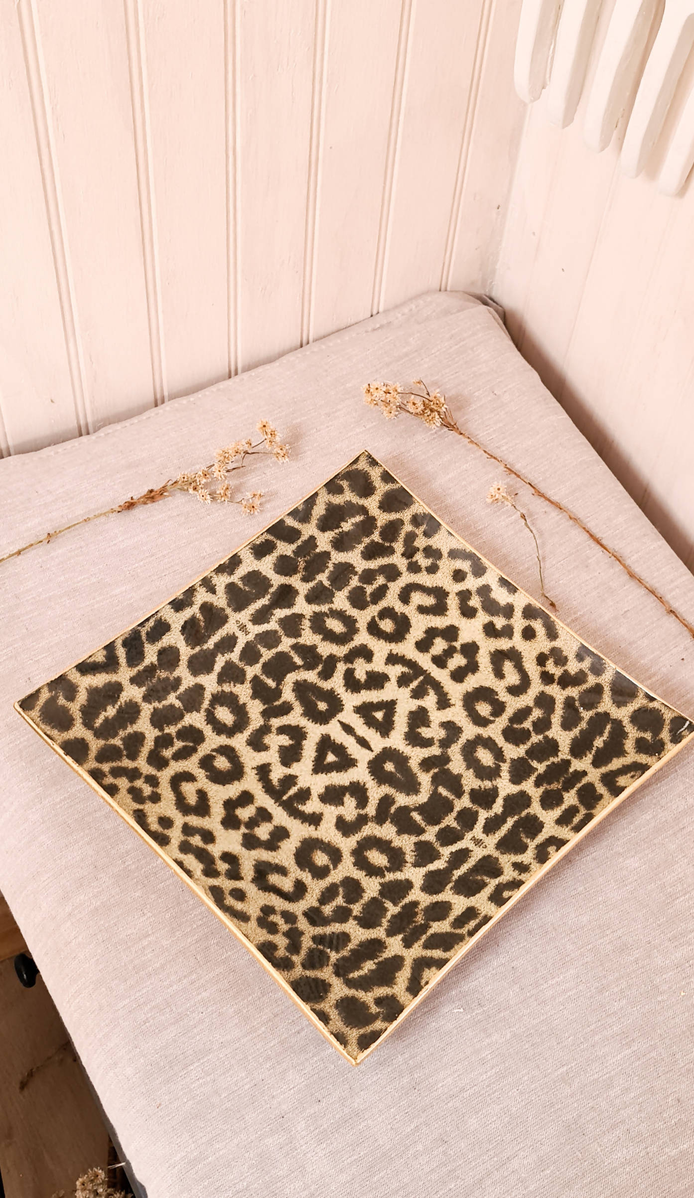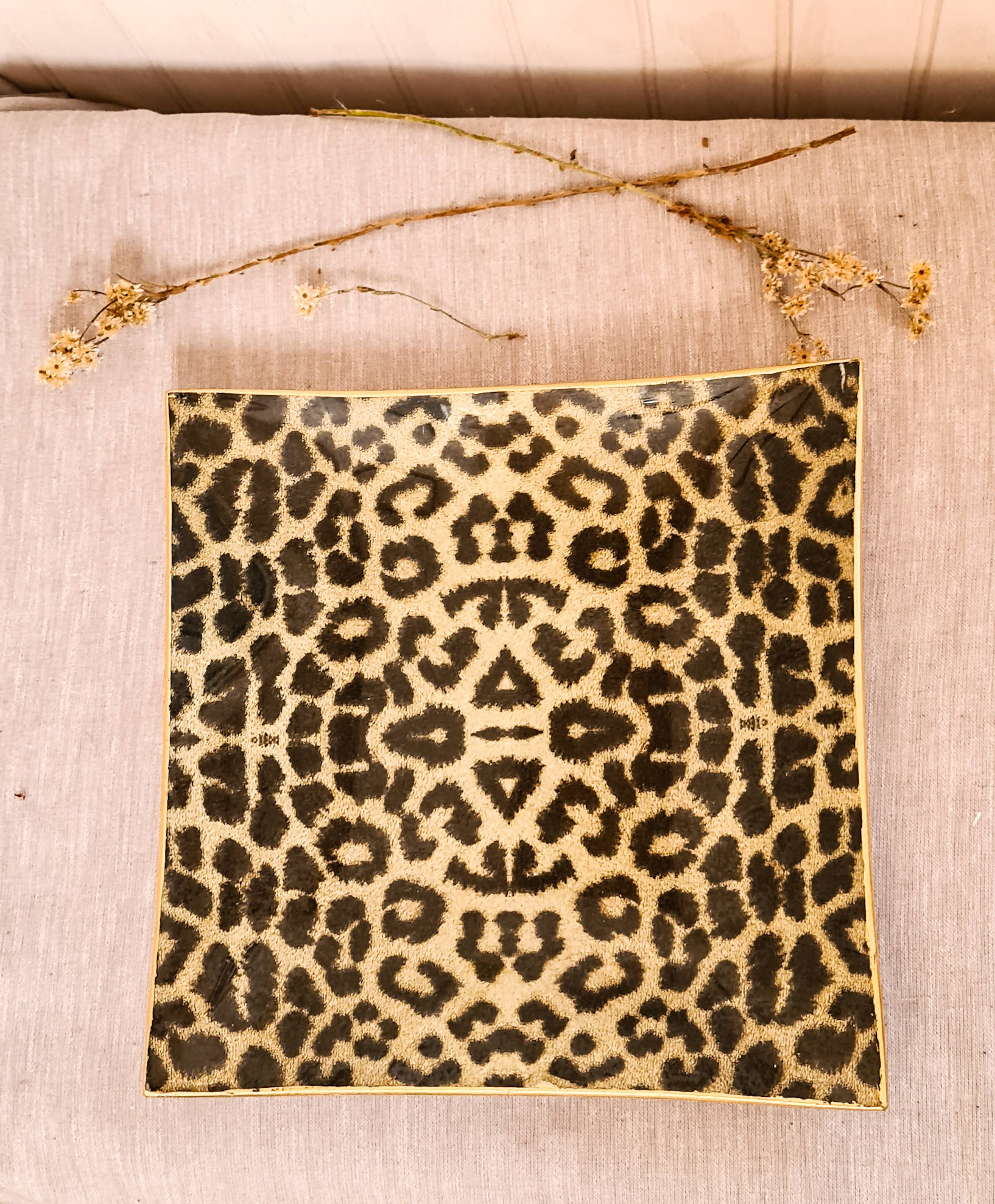 Plato cuadrado de vidrio templado de 25 cm, con tratamiento artesanal de decoupage. Apto para el lavado a mano y para el uso de comidas o elementos calientes sobre la superficie.