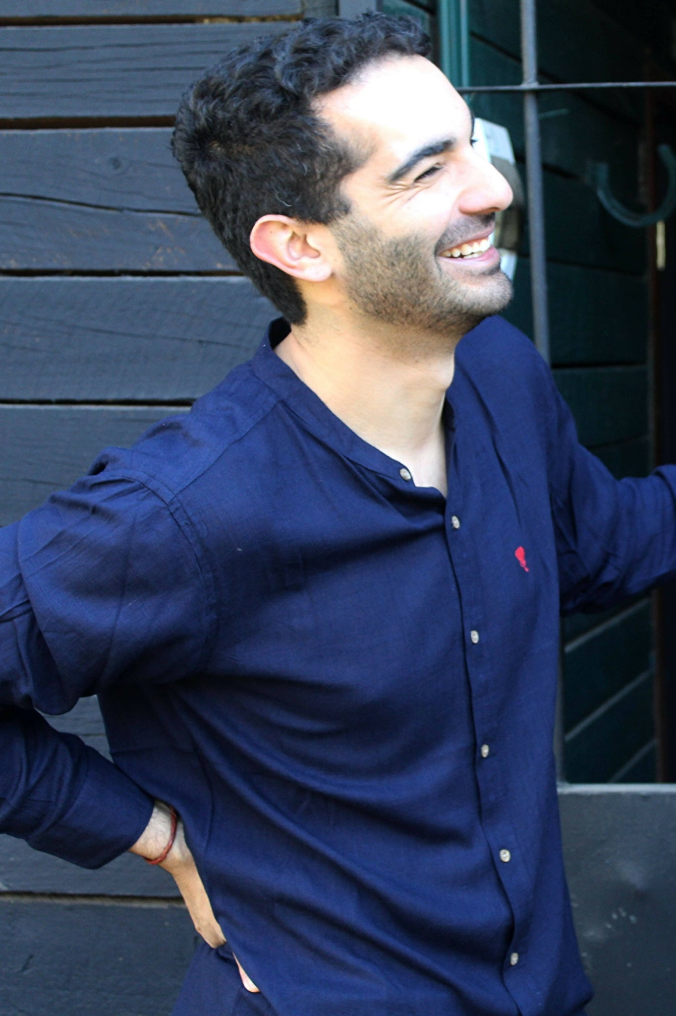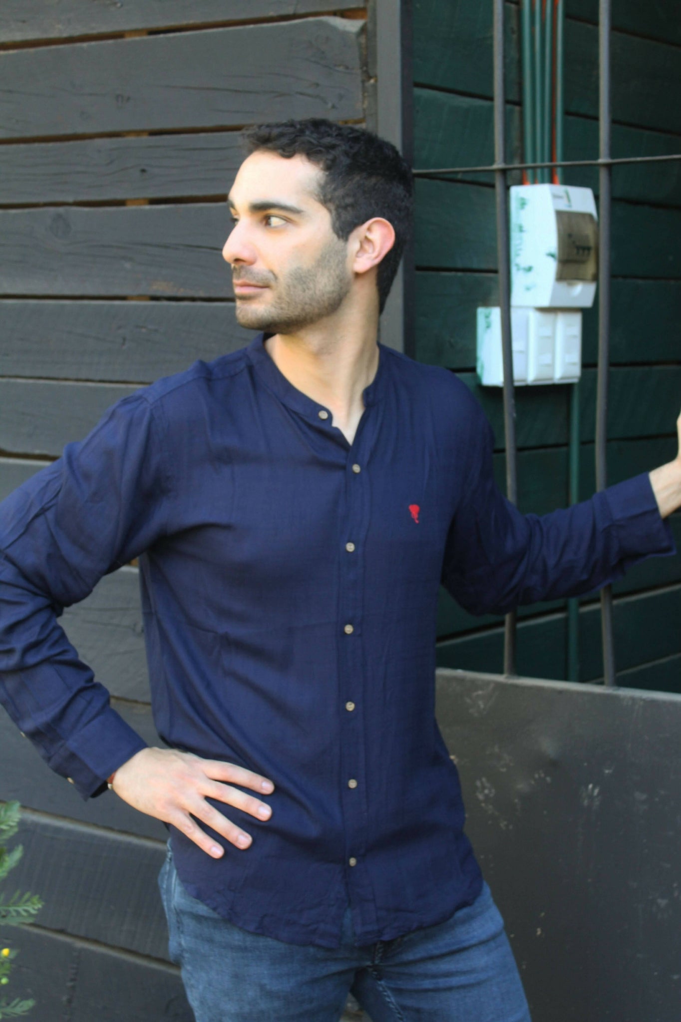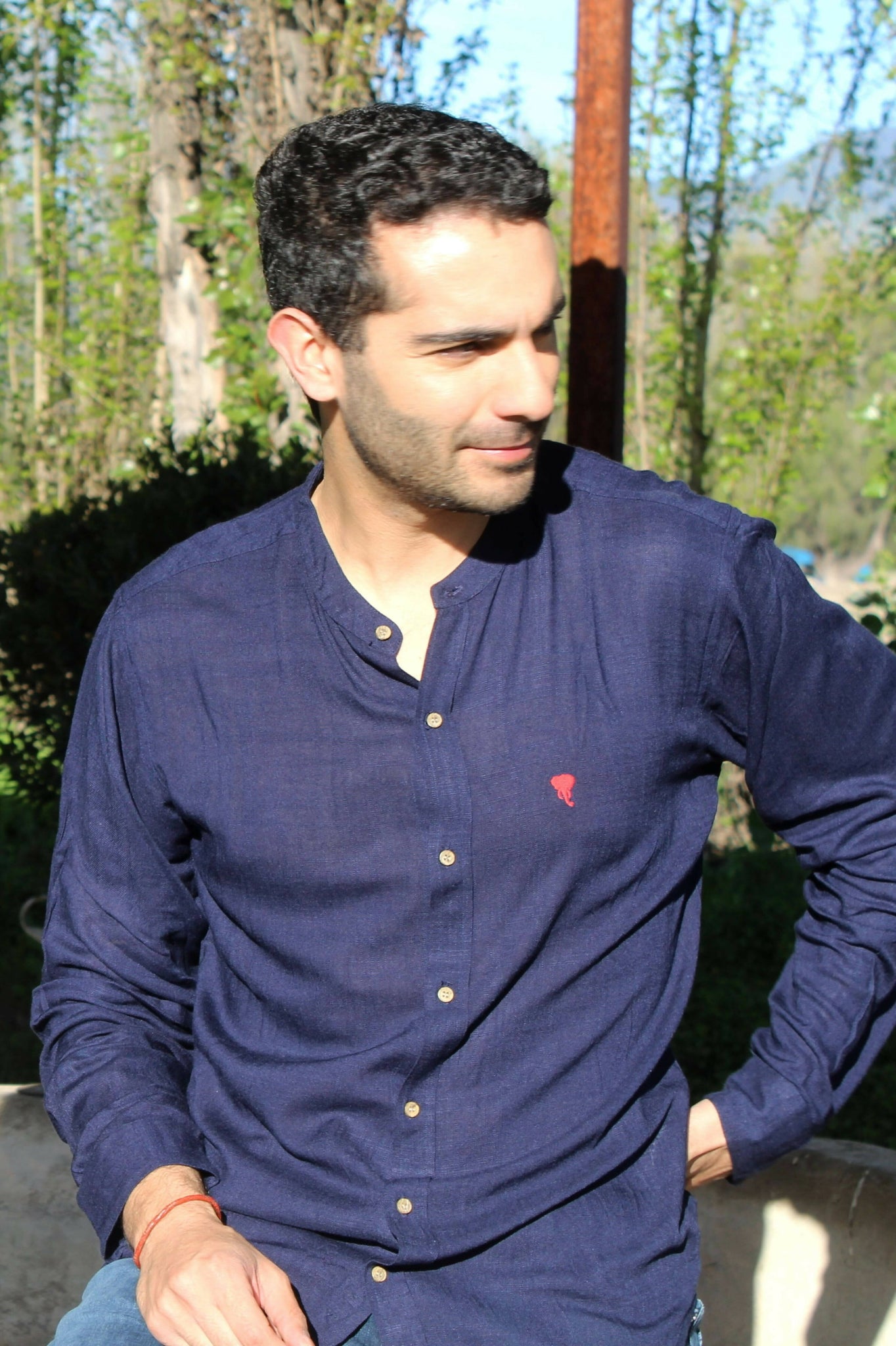 Camisa Azul Marino Mao de hombre 80% lino y 20% viscosa hecha en India, con un diseño versatil y elegante. Botones de madera.