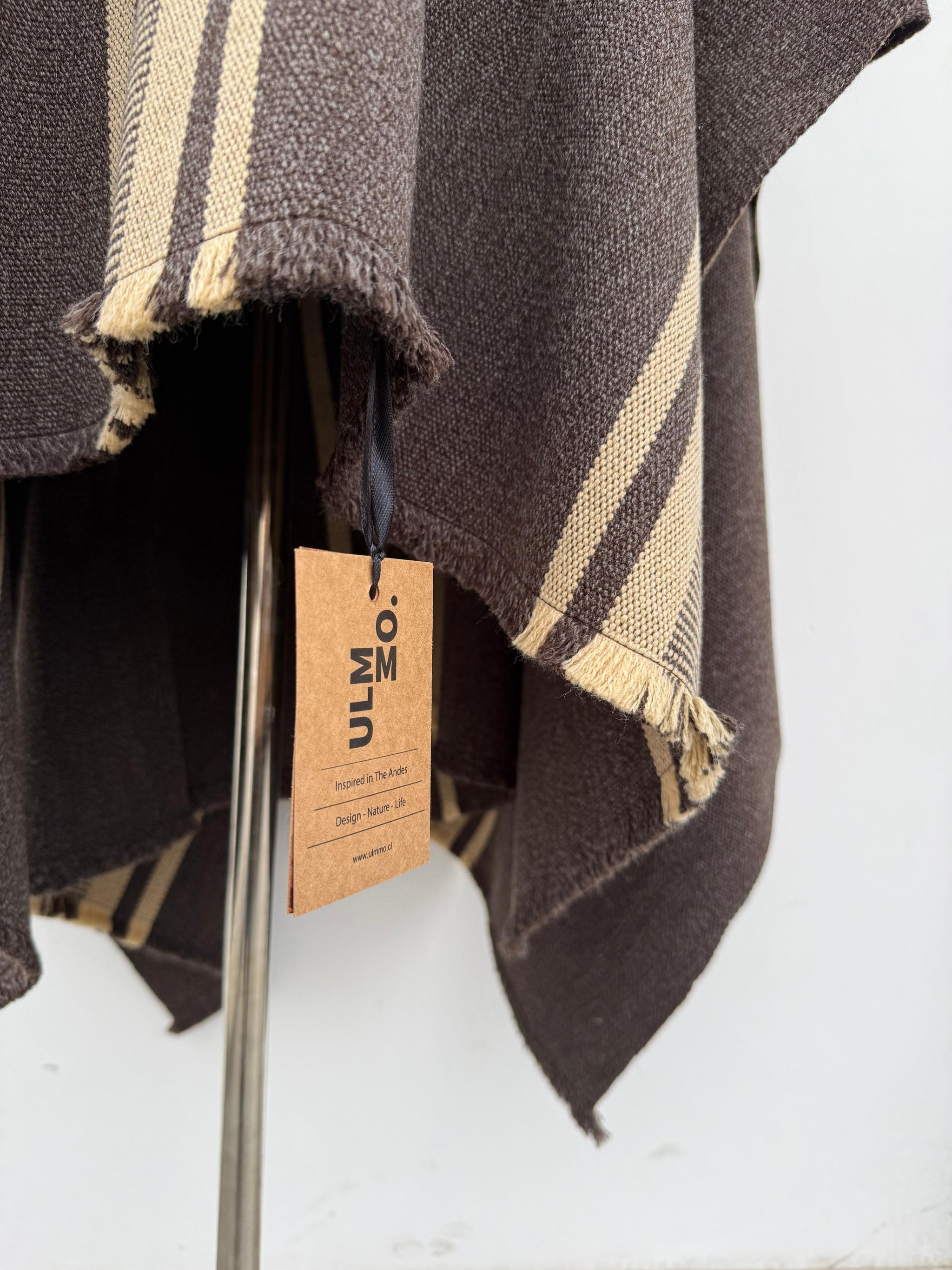 Este poncho ha sido tejido a mano en telar en Chile, con el emblemático diseño peinecillo, reconocido por su elegancia, simetría y valor cultural.