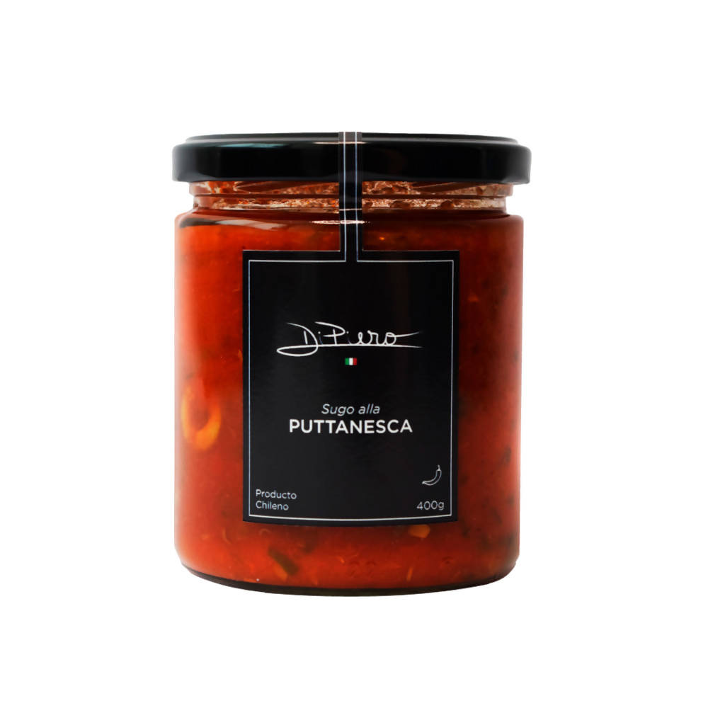 Intensa salsa de tomate con aceitunas negras, alcaparras y un leve toque de picante.