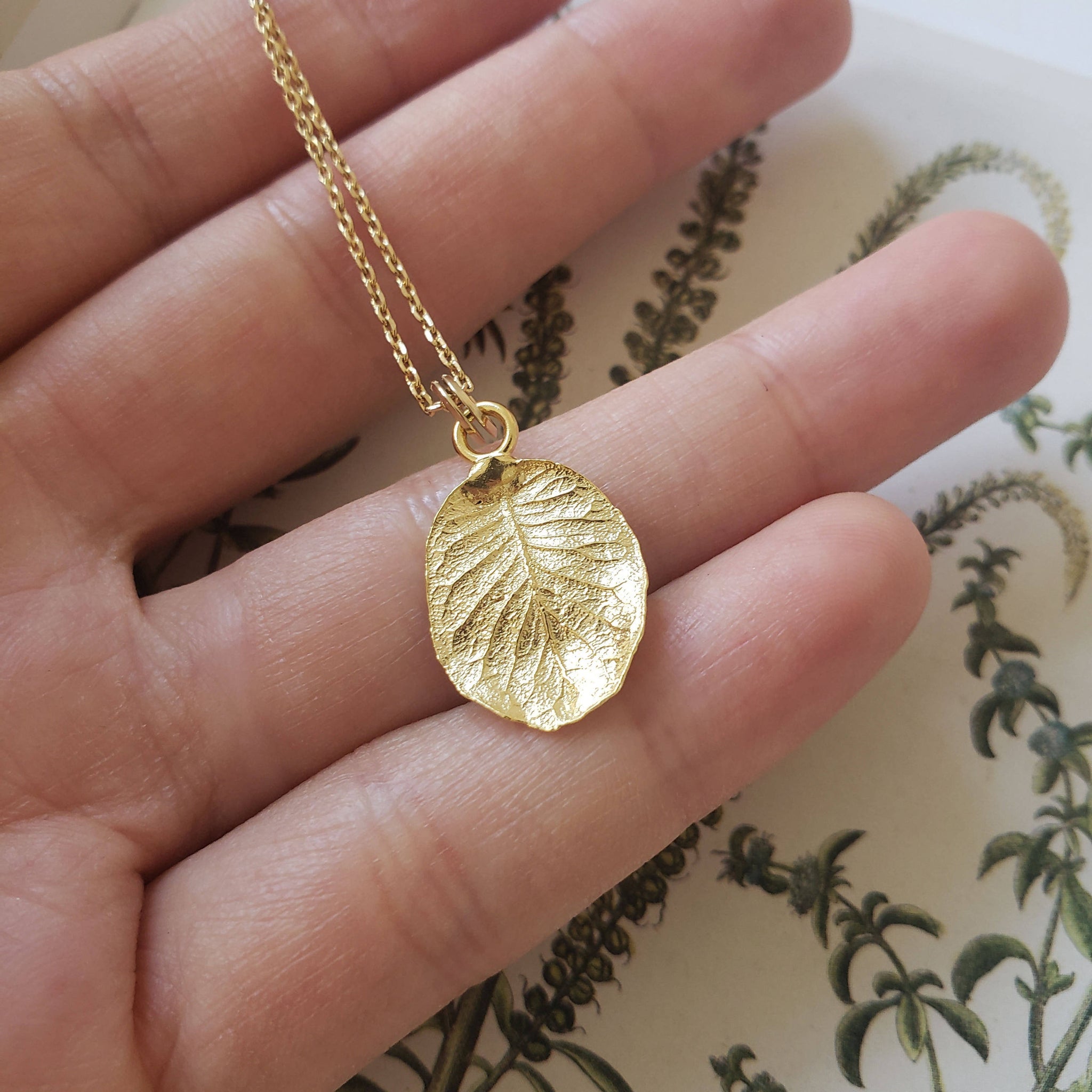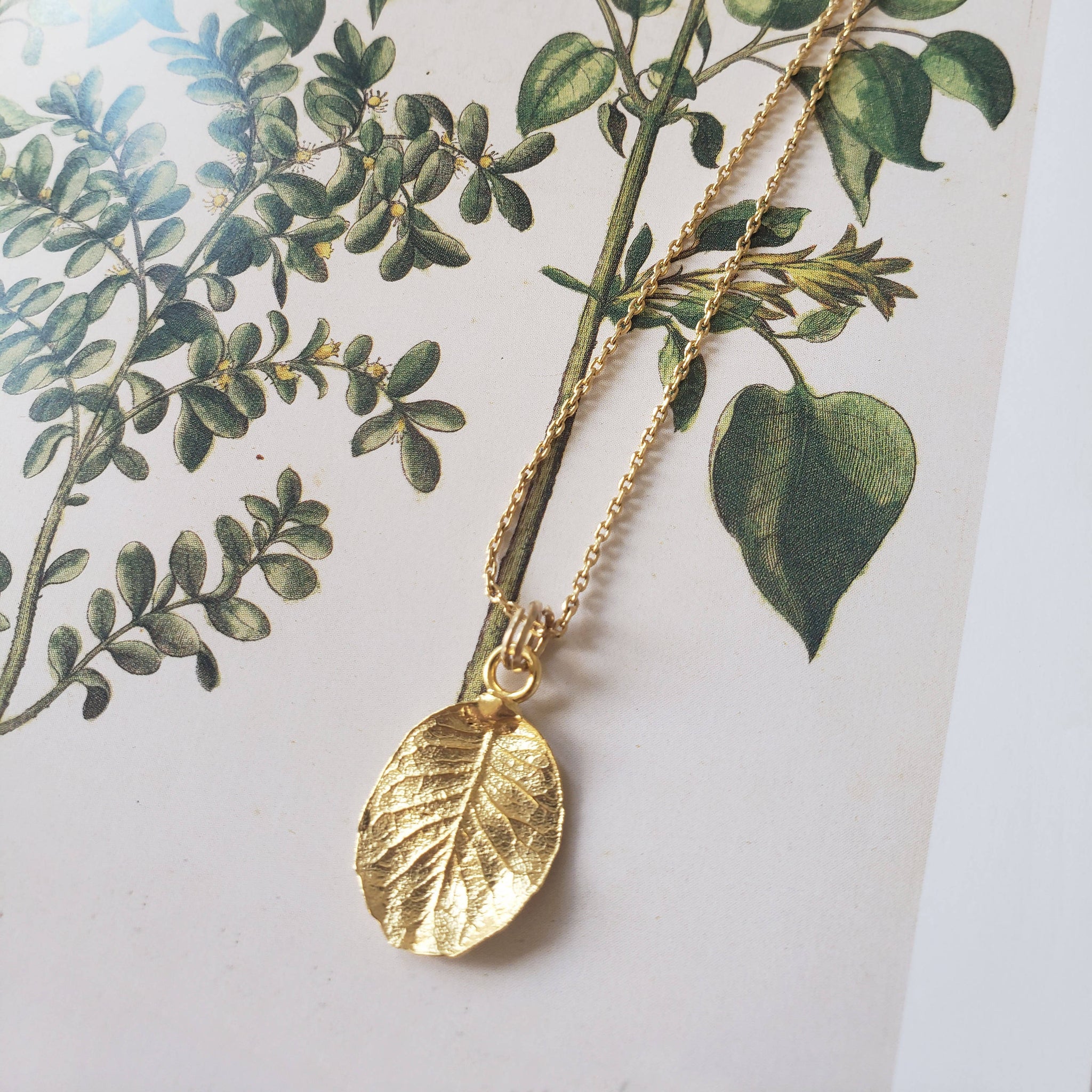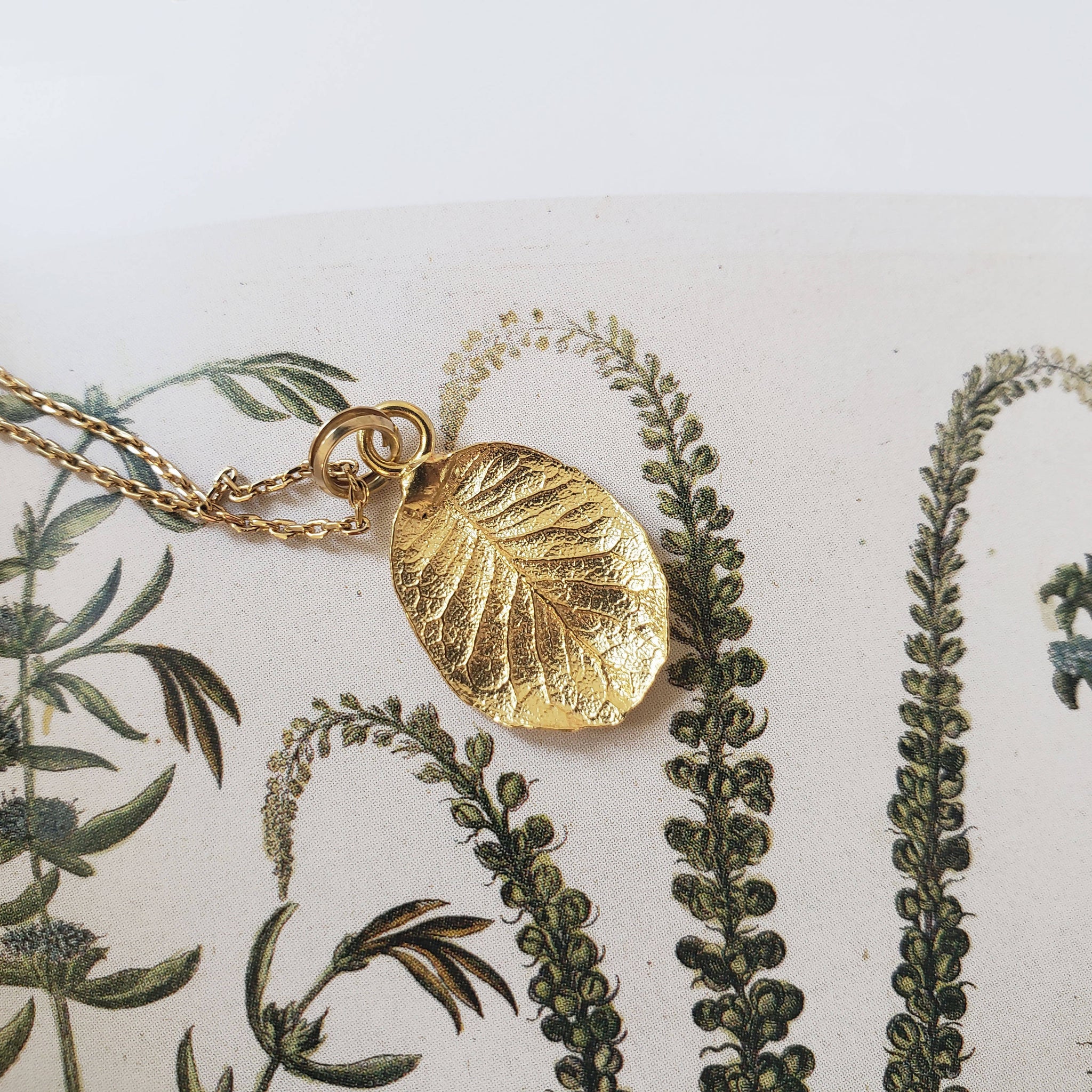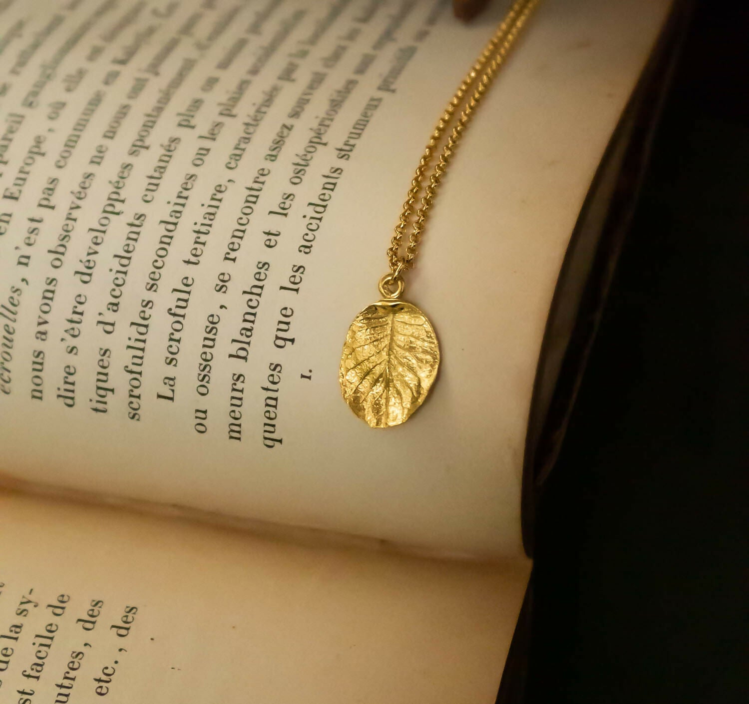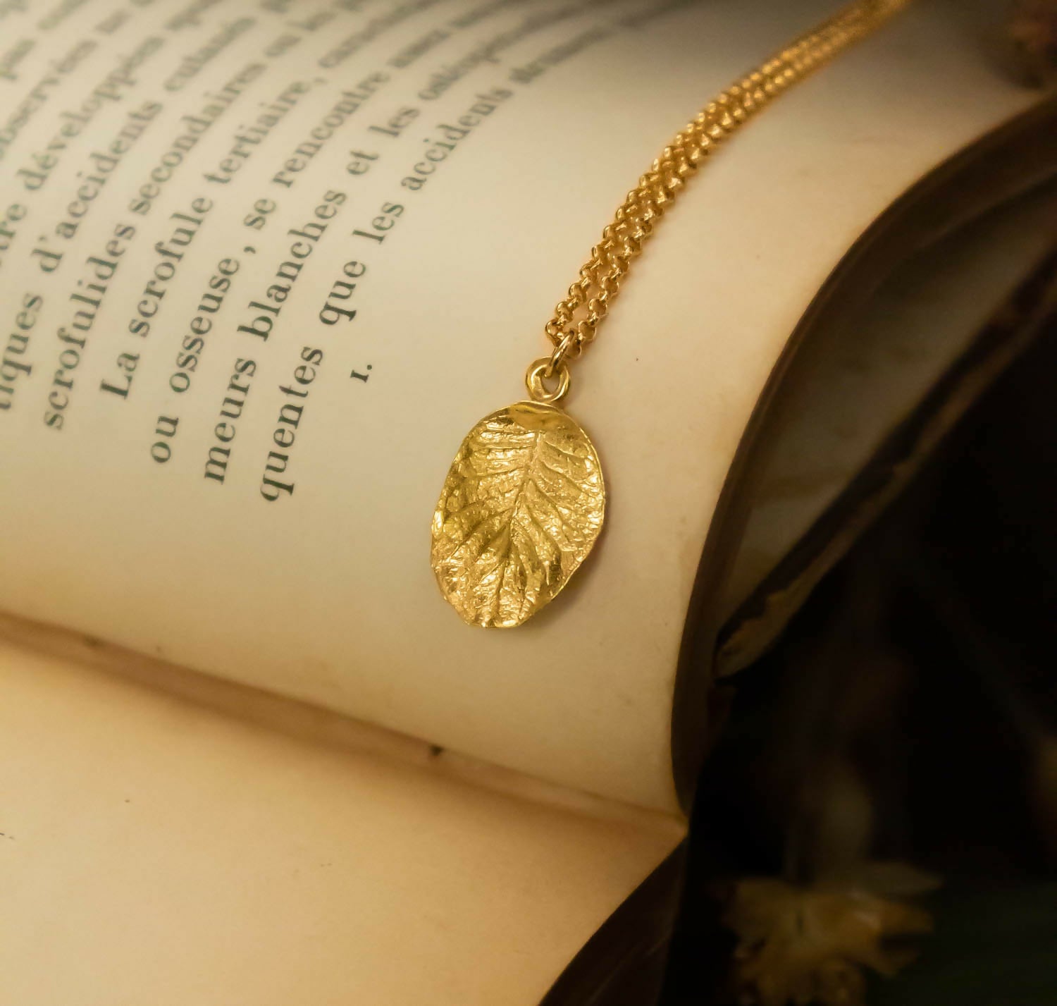 Colgante de hojita de ulmo tamaño pequeño, basado en el árbol de Ulmo del sur de Chile. Pertenece a la colección Bosque de Midas, donde trabajamos con la matriz de la hoja real, hecho en plata 950 y enchapado en oro.