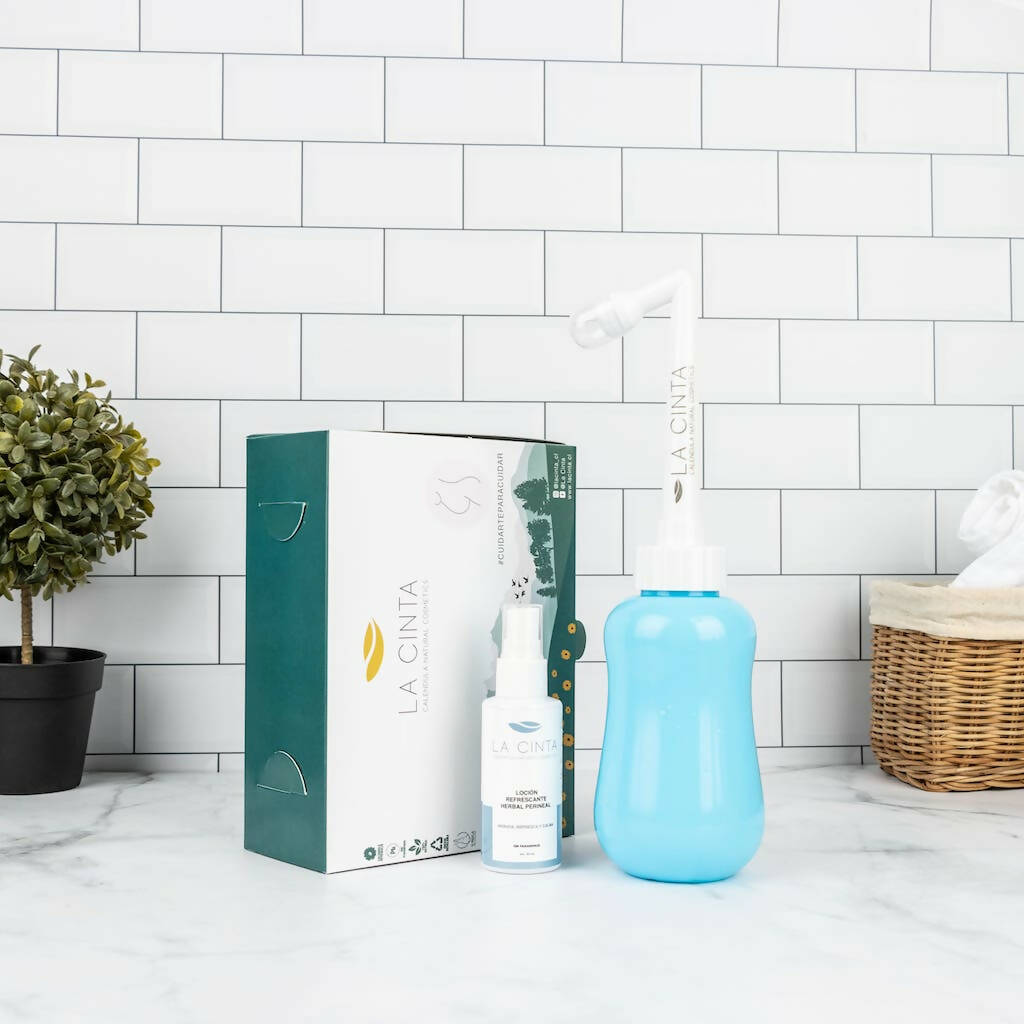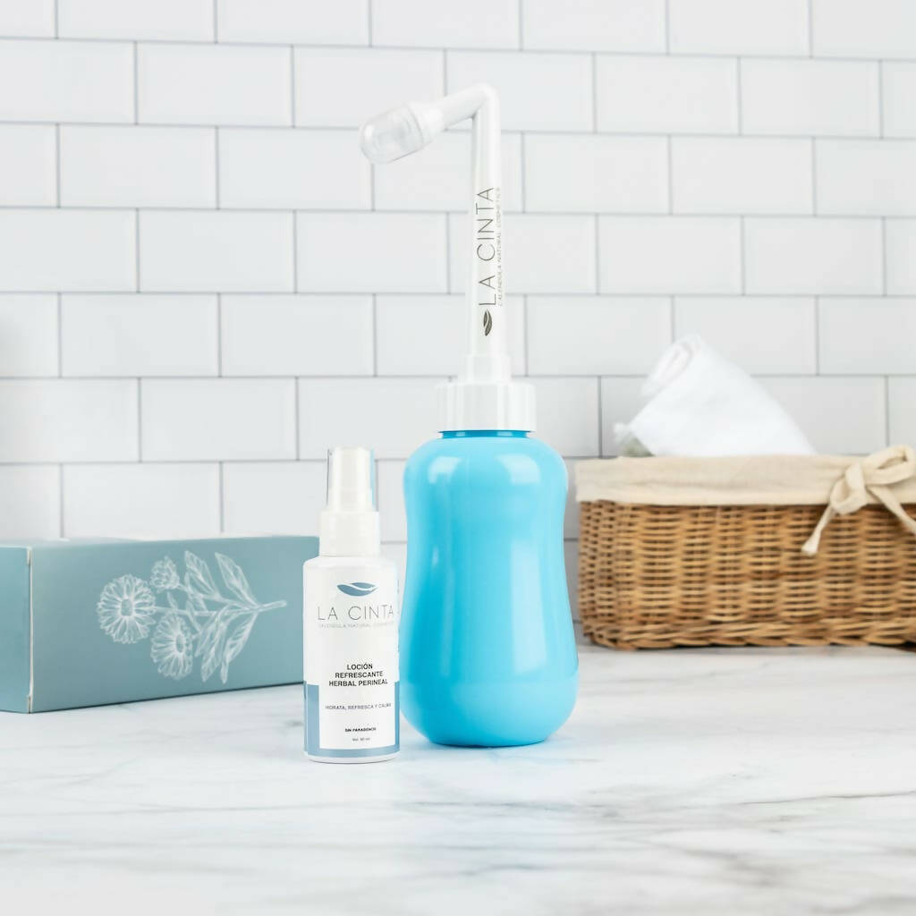 Pack con 2 infaltables para el cuidado perineal post parto. Nuestra Botella de Higiene Perineal con boquilla de ducha para lavado y aseo más fácil, y la Loción Herbal Refrescante Perineal para aliviar las molestias de la zona íntima los primeros días post parto. #cuidarteparacuidar