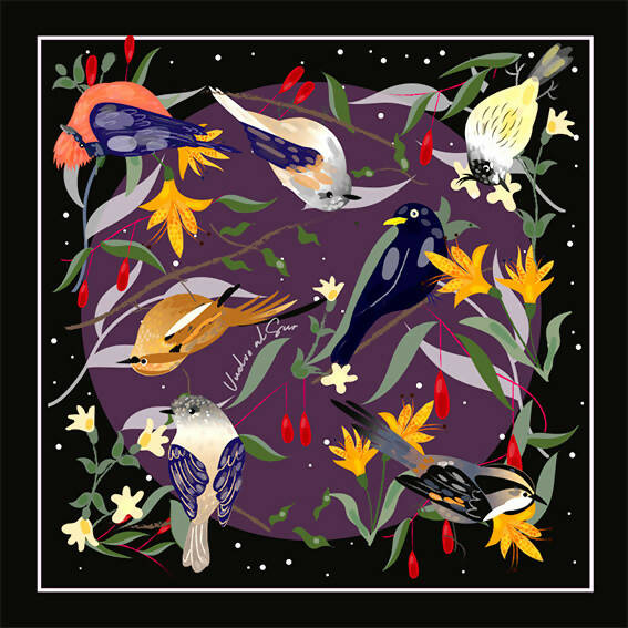 Acompañadas de las lindas Astromelias Flor de Gallo, estas Pequeñas Aves son hermosas protagonistas de los paisajes chilenos. El Run Run, Rayadito, Cachudito, Saca tu Real y la Viudita nos regalaron su esplendor para inspirarnos y crear este nuevo diseño. Plasmado de manera muy colorida y elegante en este versátil pañuelo, puedes sacar todo su provecho por su tamaño y materialidad, ya que es un perfecto y original complemento para cualquier tenida tanto de día como de noche.