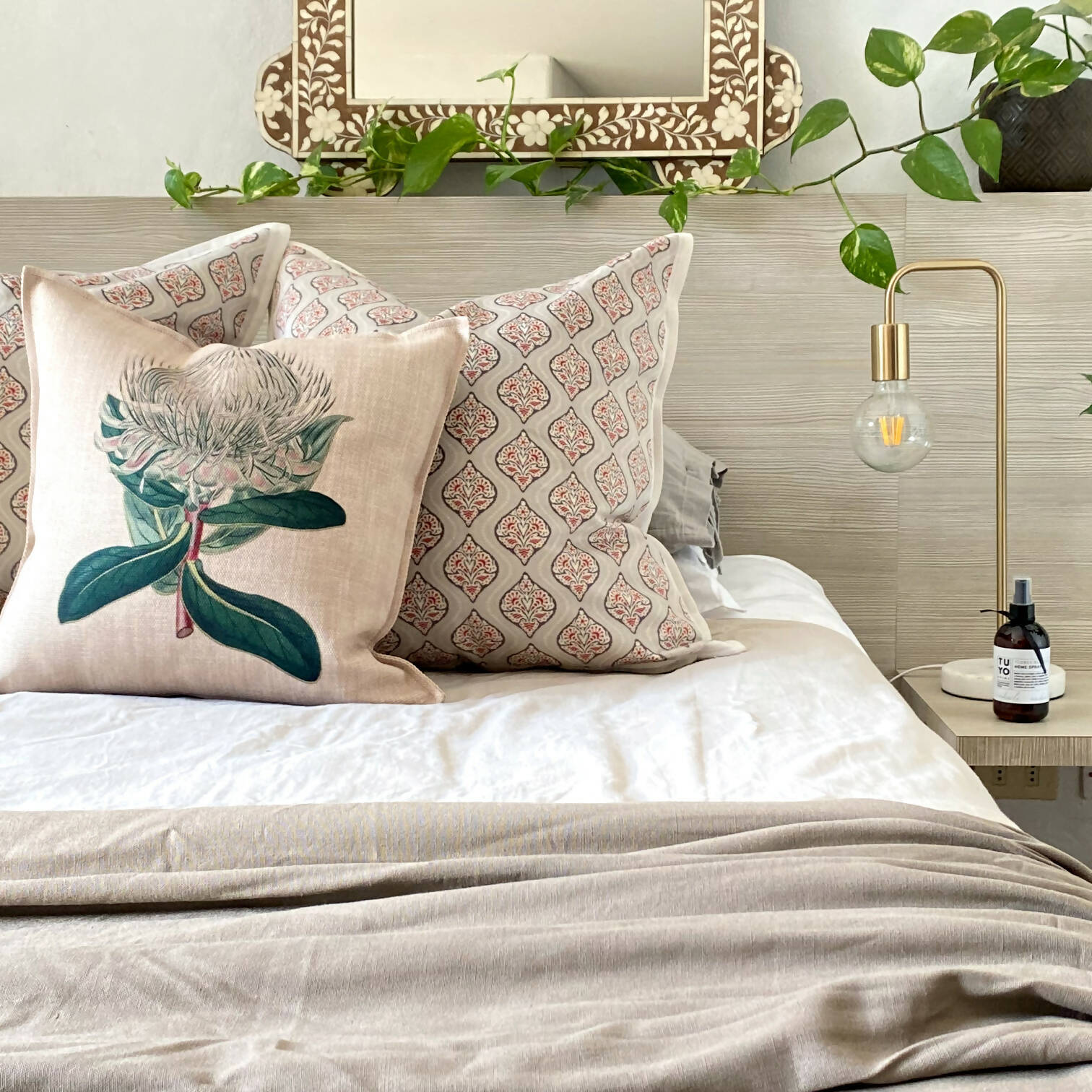 Cojín para renovar tu espacio. Linet (Lino con poliéster) estampado. 45×45 cm. con cierre, relleno desmontable.