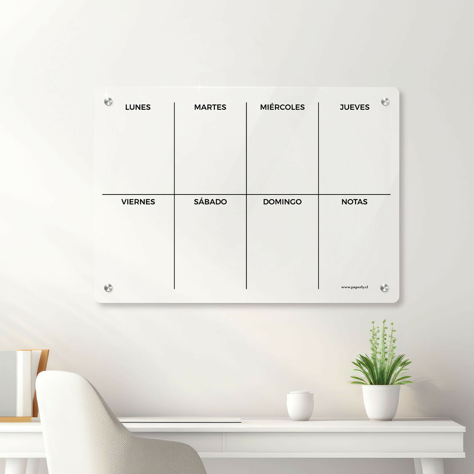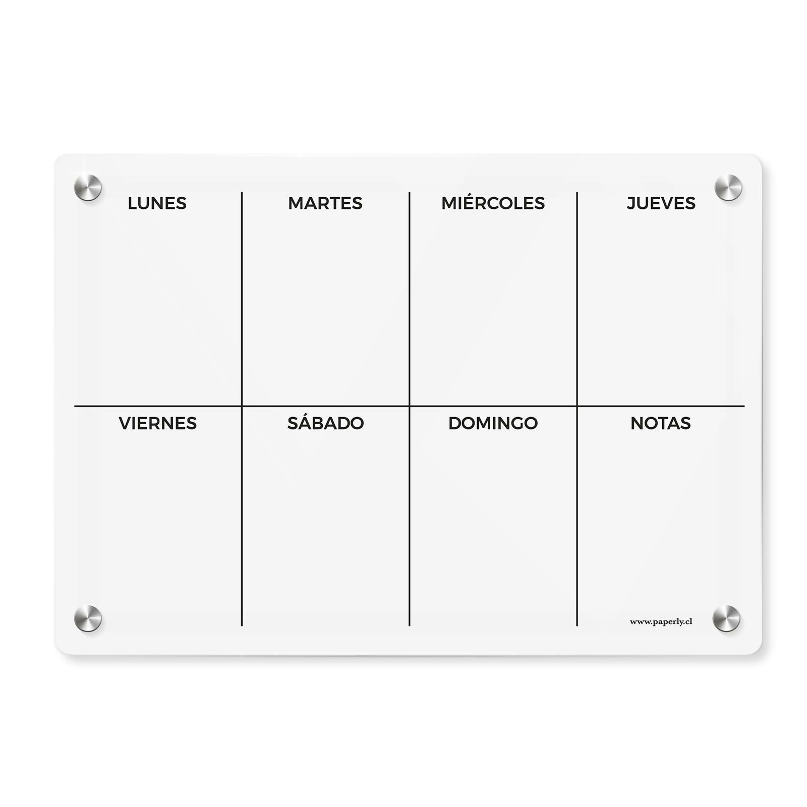 Elaborada en material acrílico transparente, no magnético, de 4 milímetros de espesor, bordes redondeados y con las perforaciones para su instalación.