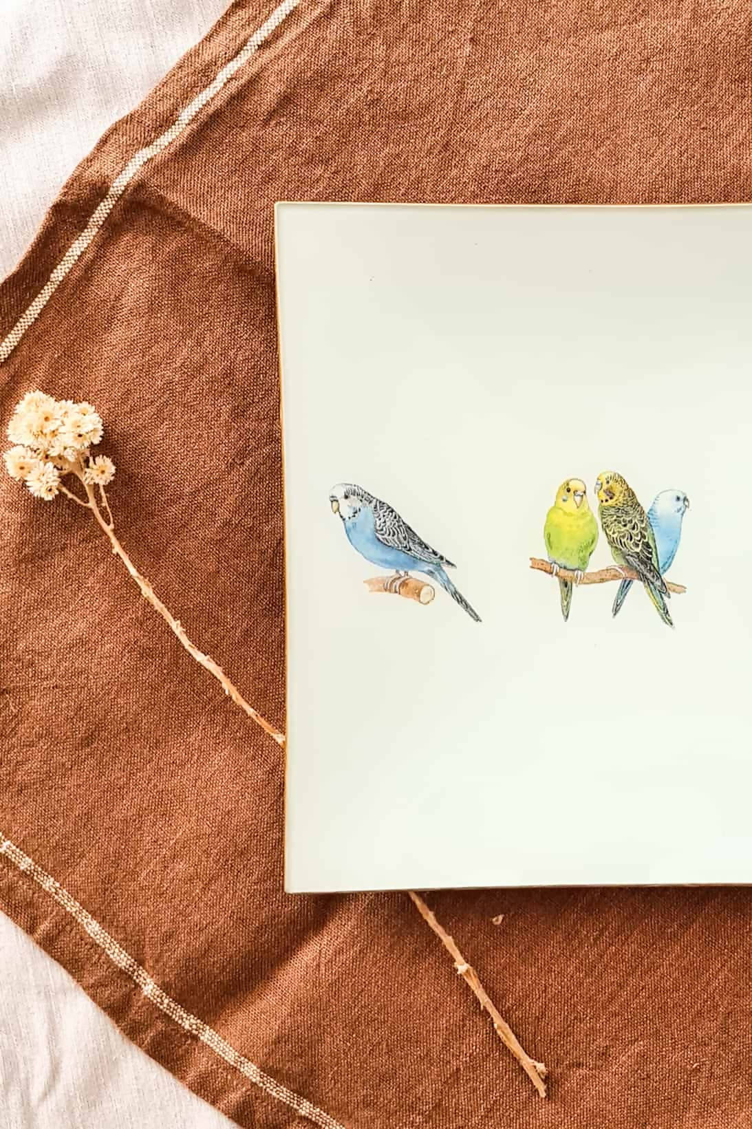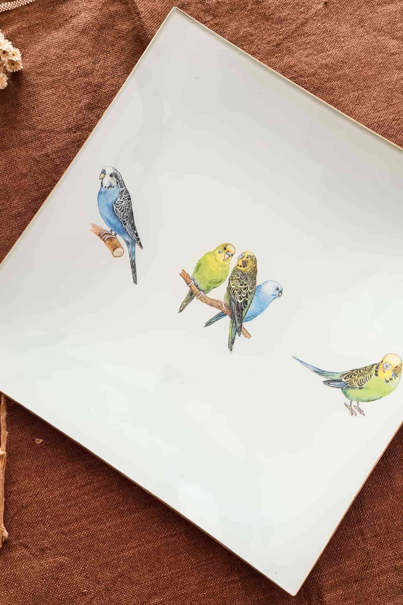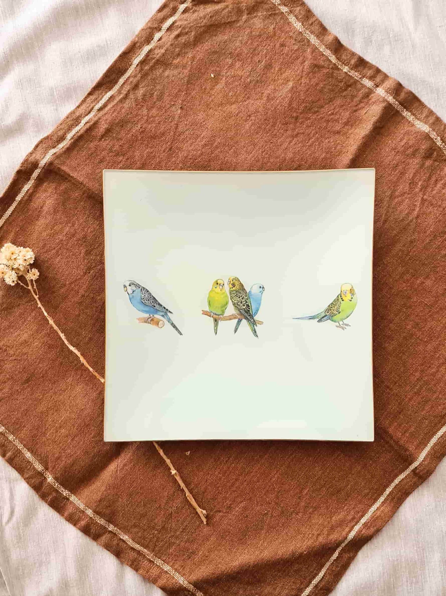 Plato cuadrado de vidrio templado de 30 cm, con tratamiento artesanal de decoupage. Apto para el lavado a mano y para el uso de comidas o elementos calientes sobre la superficie.