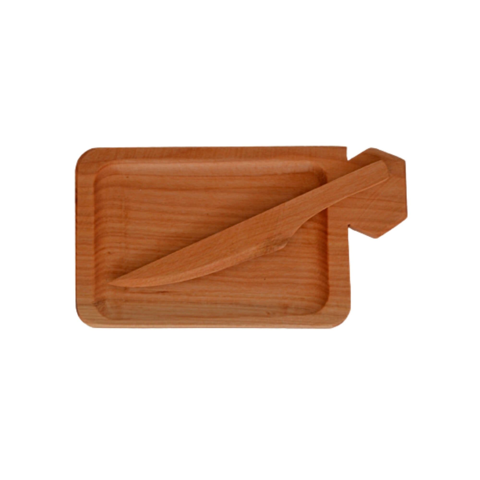 Esta tradicional mantequillera con mango de madera nativa es un objeto típico utilizado en las mesas del sur de Chile. Fue tallada a mano en madera nativa de raulí hualle, por artesanos de Villarrica, de la Región de la Araucanía.