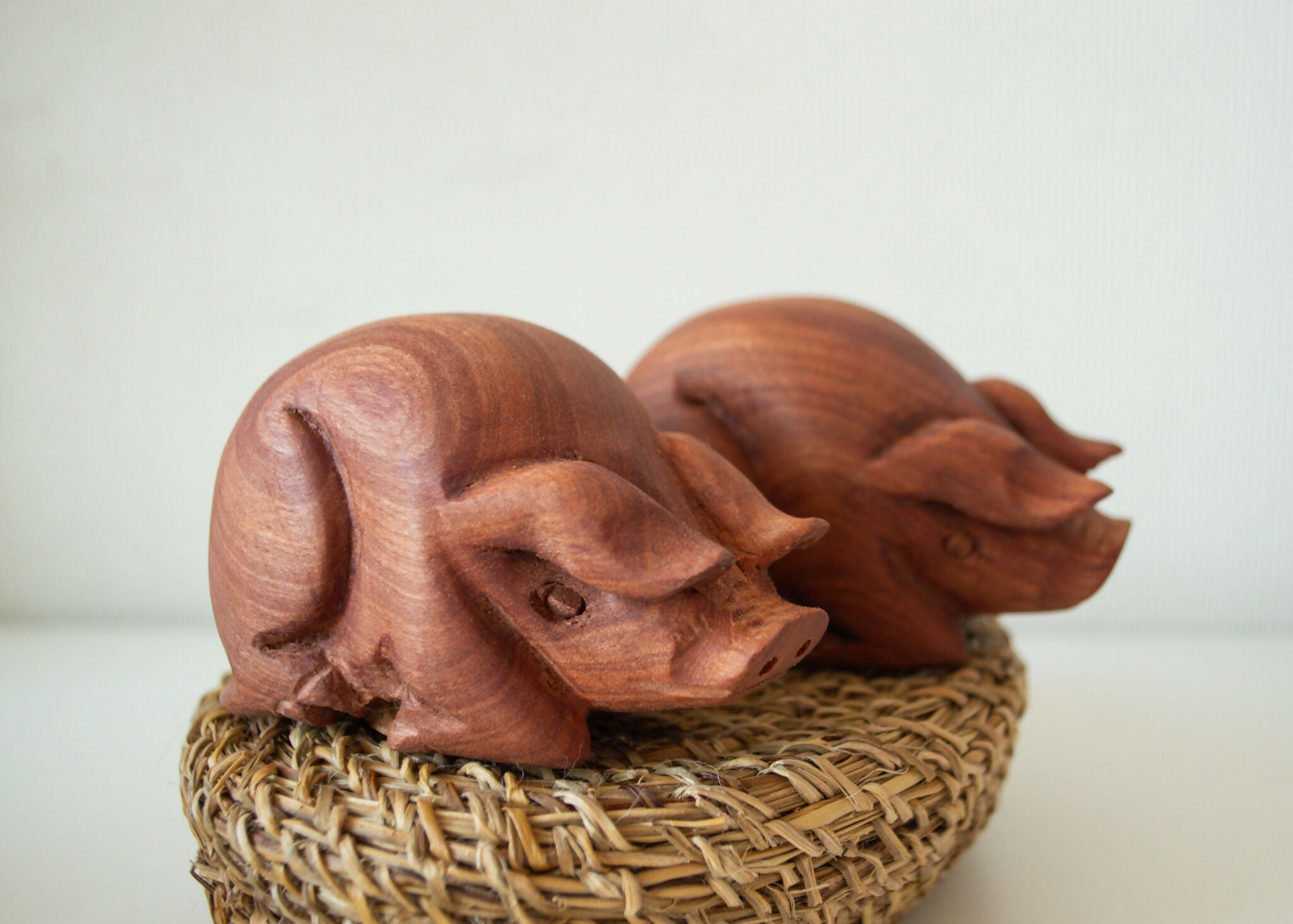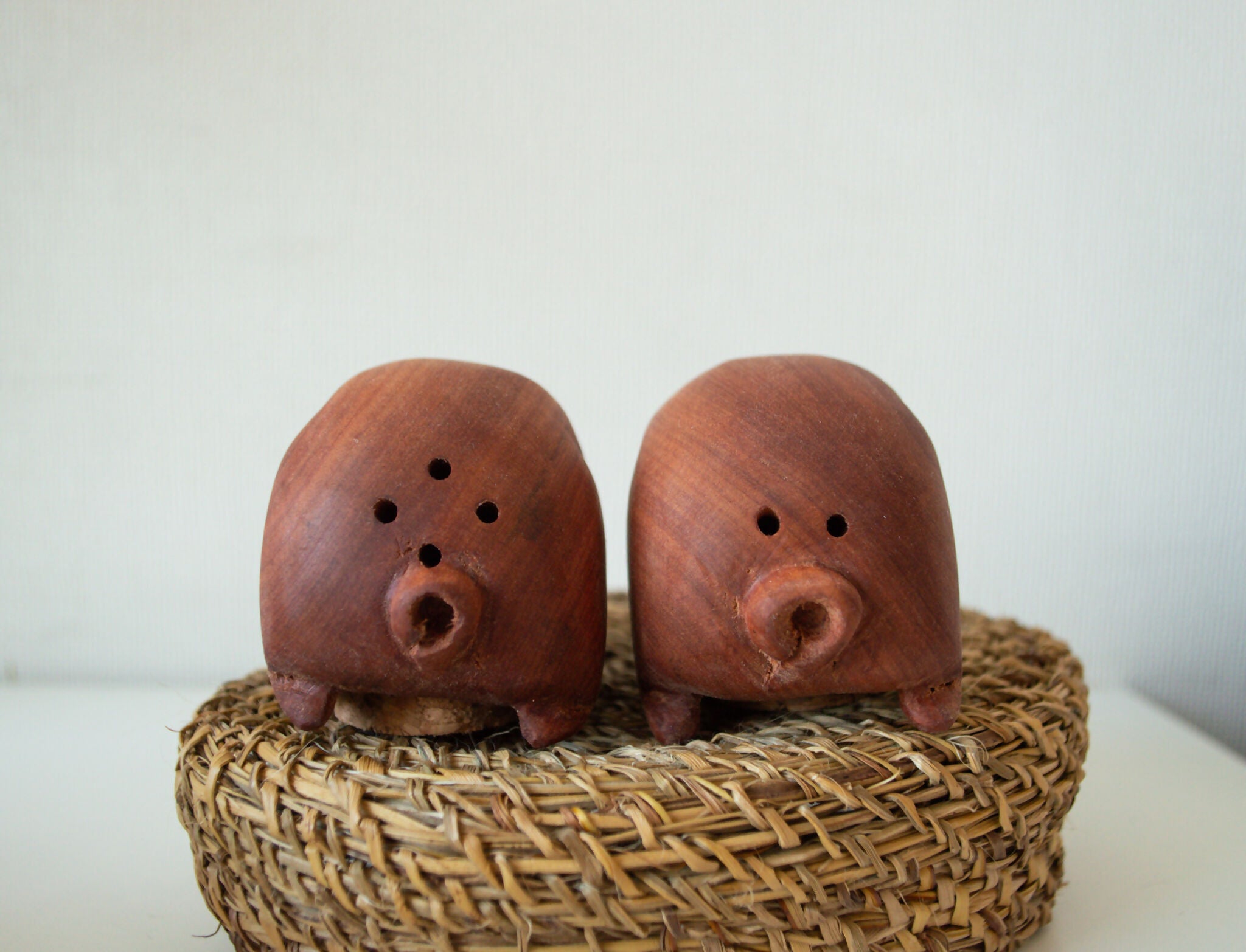 Originales salero y pimentero, tallados a mano por un artesano del sur de Chile, utilizando maderas nativas y recreando animales de la granja. Especial para condimentar tus comidas y darle un toque original y decorativo a tu mesa.