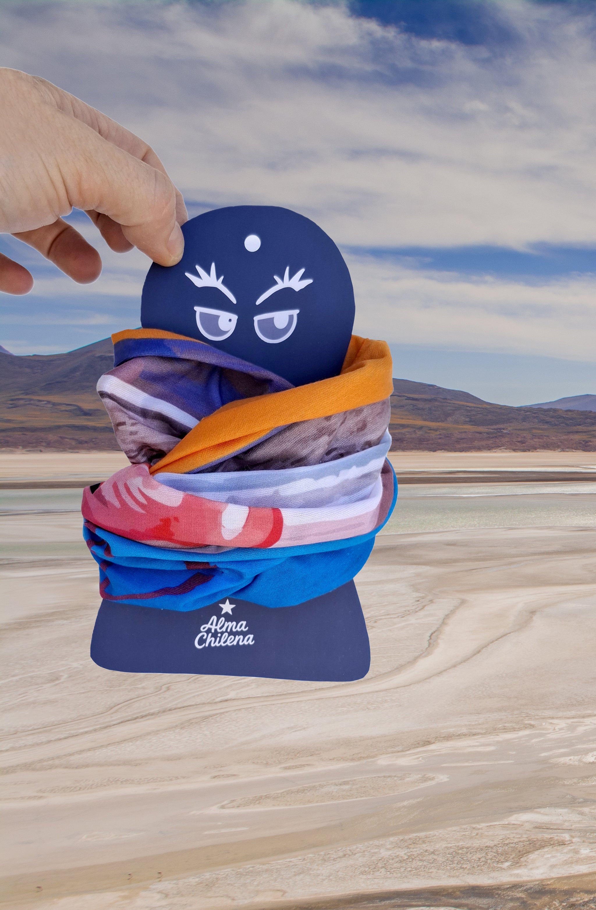 La bandana Alma Chilena lleva en cada diseño la esencia de nuestro territorio. Sus ilustraciones, inspiradas en la geografía de Chile de norte a sur, convierten este accesorio en una pieza llena de identidad, color y cultura local.