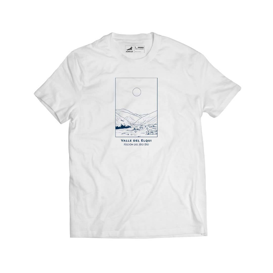 Esta polera lleva estampado en la parte frontal en un color azul marino, un paisaje clásico del Valle, procurando dejar un gran espacio de cielo en la parte superior (obra de Michael Ramírez). En la paste posterior está estampado en un tamaño pequeño el logo Kuntur en un negro grafito.