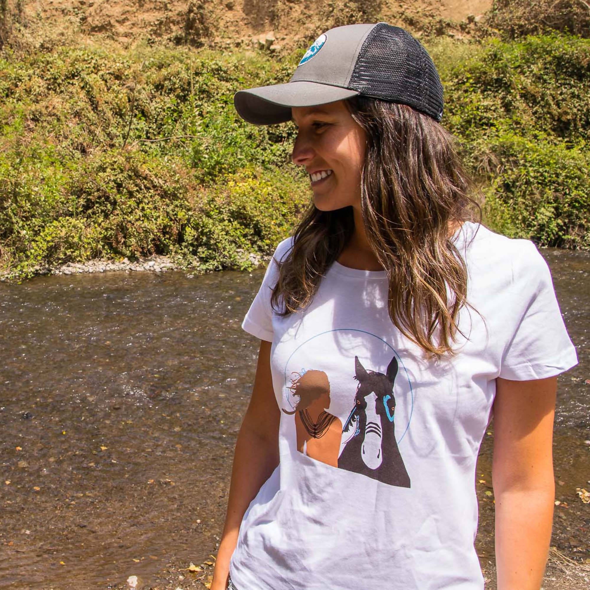 Una de las poleras de la colección que realizamos junto a la artista Wild Rata (Natalia Witt), que busca resaltar el estrecho vínculo que existe entre la naturaleza y las mujeres. En esta ocasión, se representa una mujer en compañía de su caballo salvaje.