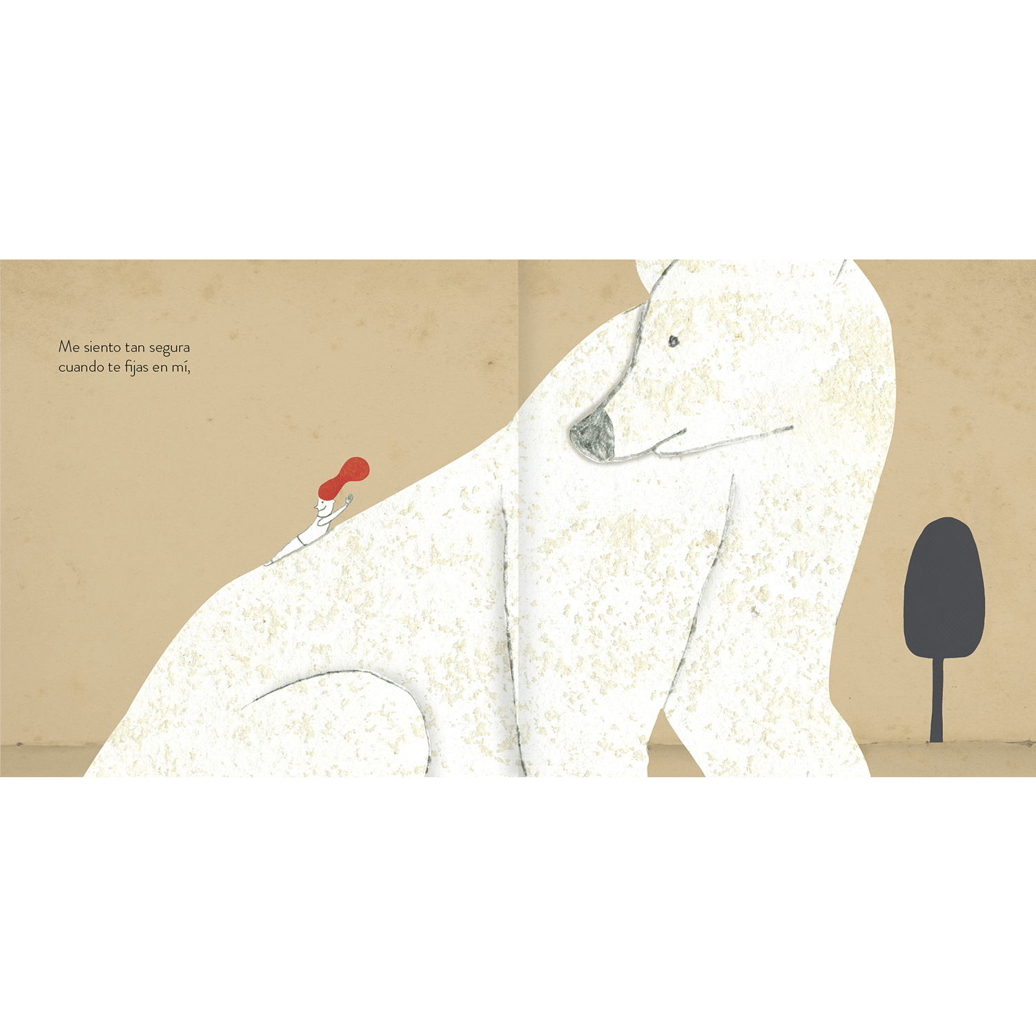 "A simple vista el inmenso oso y la pequeña niña son totalmente diferentes, pero en realidad son cómplices cuyos corazones laten juntos y se entienden sin palabras. El texto y las imágenes se centran exclusivamente en los dos protagonistas: el pacífico e impresionante oso y la niña delicada y alegre y con unas pocas oraciones simples, la niña describe esta relación jovial y única que se basa en la seguridad y confianza, lealtad y afecto, fidelidad e individualidad. Los colores pastel suaves dominan las ilustraciones, destacando sólo el cabello rojo brillante de la niña. De forma poética y asociativa, las imágenes presentan este pequeño universo de amistad y amor." -The White Ravens, 2015