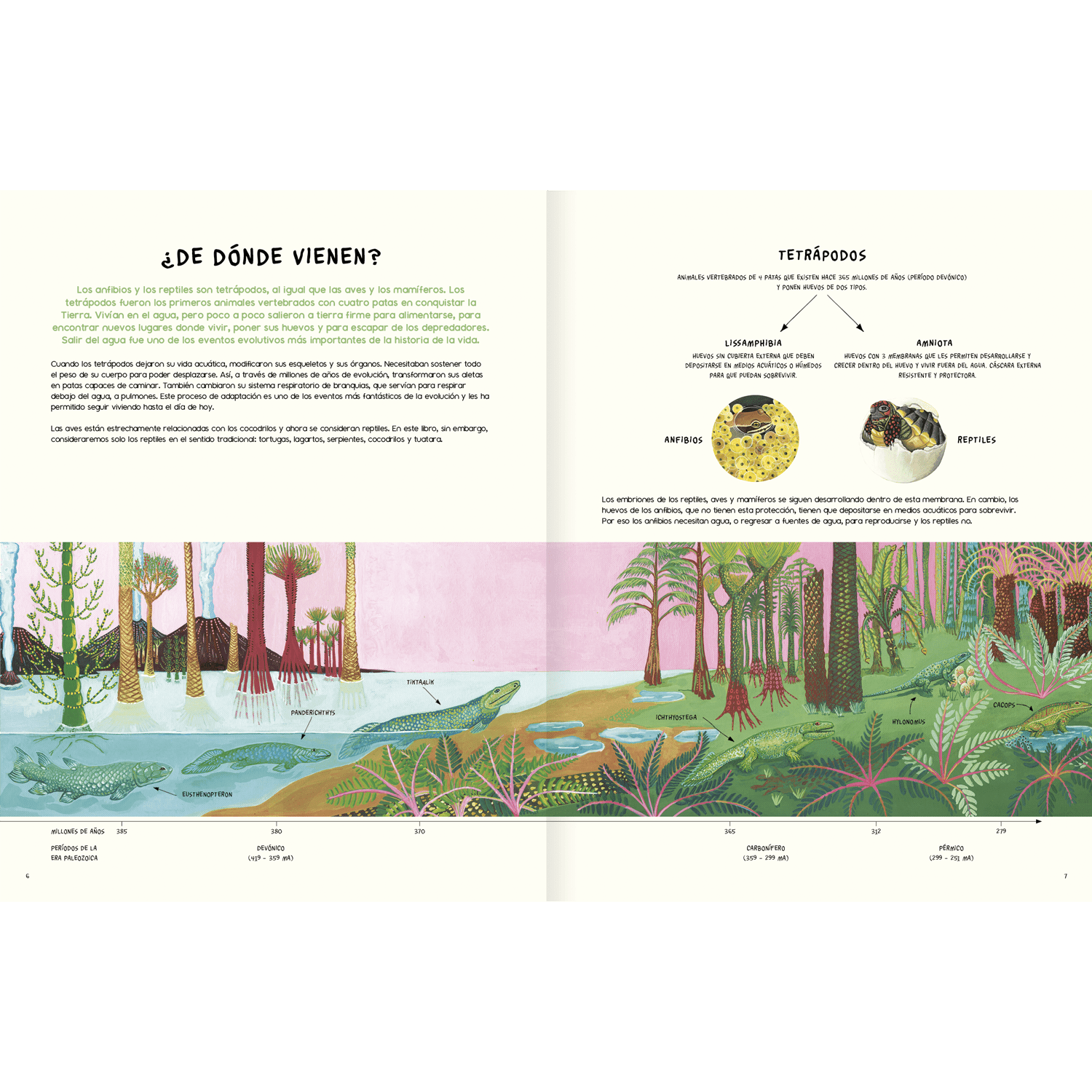 Los reptiles y los anfibios son criaturas fascinantes y sorprendentes, que llevan millones de años en la tierra, pero ¿qué sabemos de ellos? ¿Dónde viven? ¿Cómo lo hacen? En este libro, Martha Crump y Andrés Charrier, dos especialistas en el tema, responden estas preguntas y nos cuentan muchas más cosas sobre estos peculiares habitantes de nuestro planeta. Las atractivas y hermosas ilustraciones a cargo de Loreto Salinas nos ayudarán a sumergirnos en su mundo, invitándonos a conocer y comprender aspectos básicos, y algunos más complejos, de los reptiles y anfibios de América. Es un libro para todas las edades, para admirar lo fantástica que es la evolución, los procesos de adaptación de las especies y la gran diversidad de la vida en la tierra. Un libro entretenido, sorprendente, didáctico y bello.