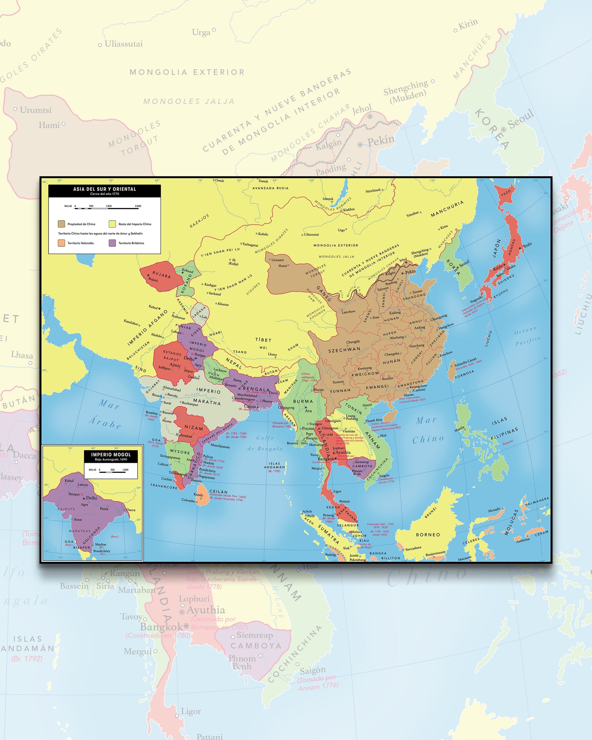El mapa de Asia Oriental y del Sur en 1775 muestra la distribución política y geográfica de la región en un momento histórico clave. En ese momento, la región estaba dividida en varios imperios y regiones con identidades políticas y culturales distintas.
