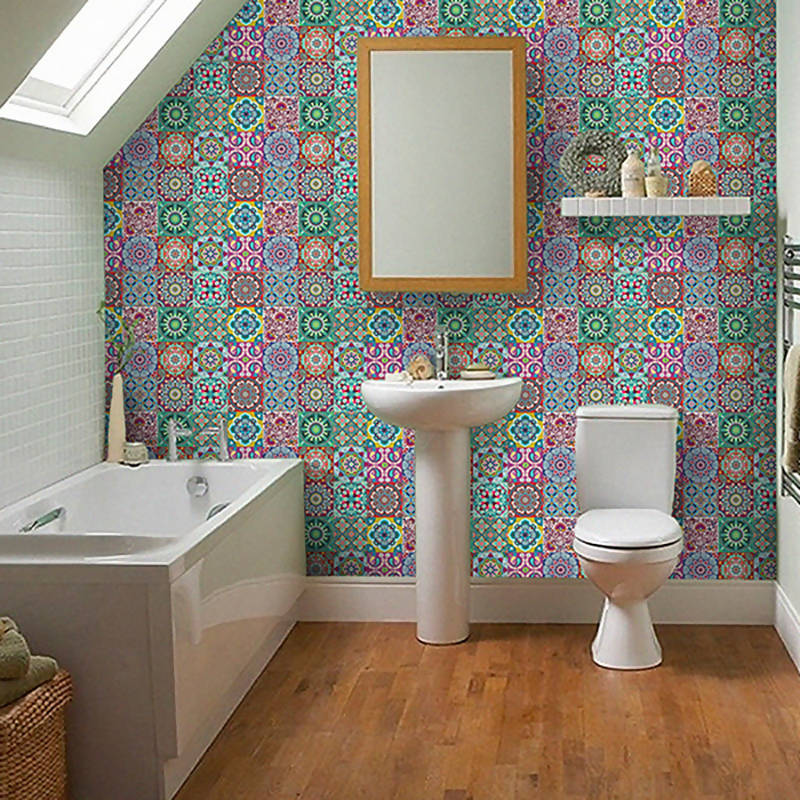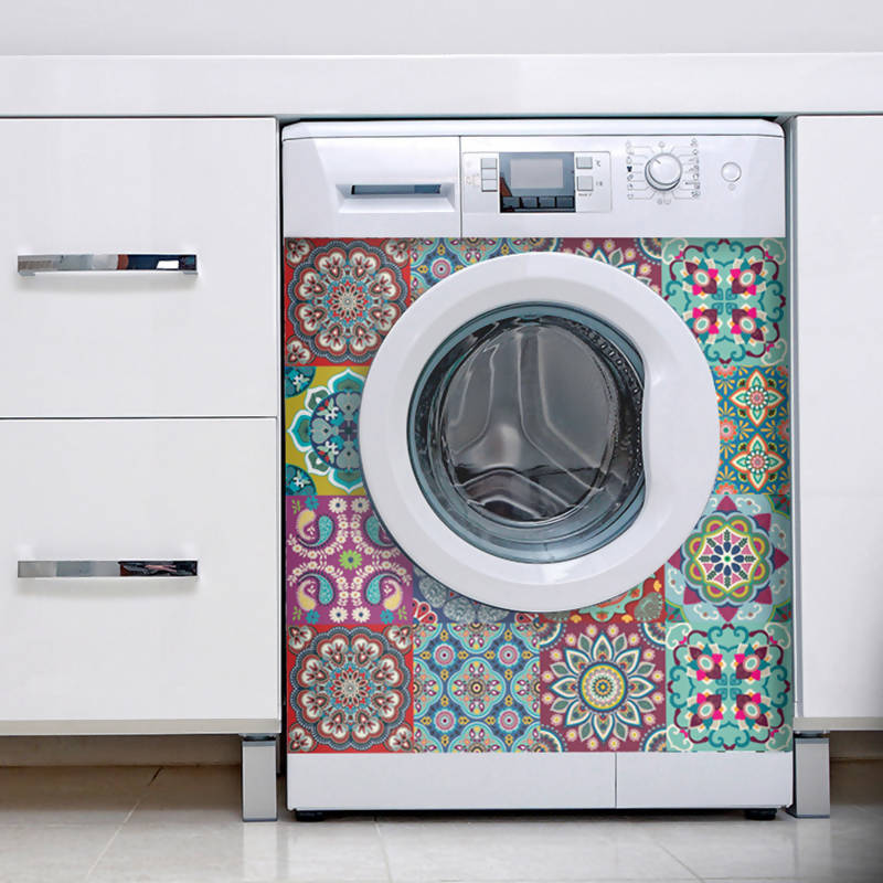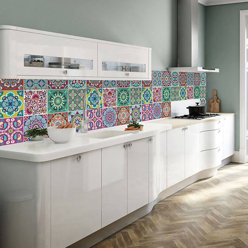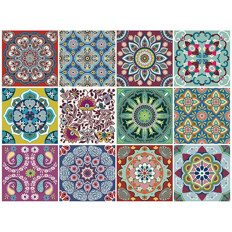 Azulejos de vinilo autoadhesivos de 15x15cm cada uno. Cada paquete trae 12 unidades mixtas, es decir son todas diferentes, tal como se puede ver en la foto.