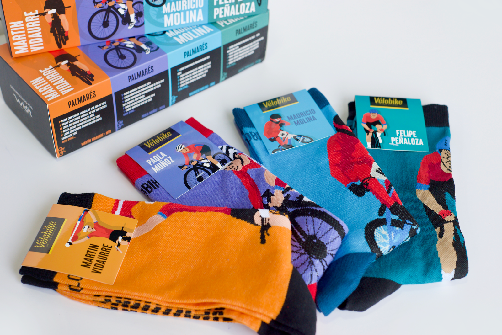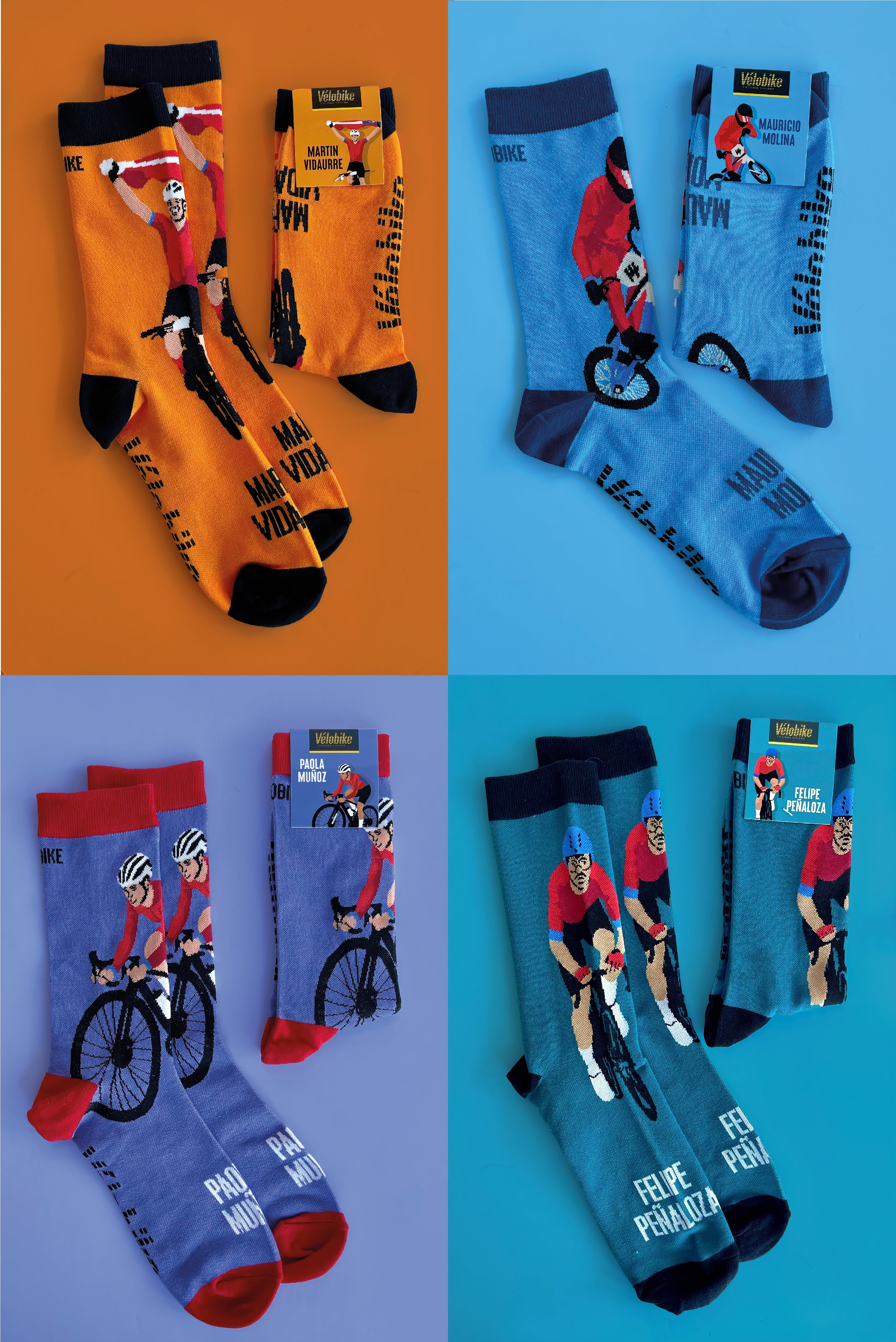 En colaboración con Velobike creamos un pack de calcetines en tributo a cuatro renombrados atletas chilenos en diferentes disciplinas ciclísticas: Martín Vidaurre, especialista en Mountain Bike; Paola Muñoz, destacada en Ciclismo de Ruta; Felipe Peñaloza, experto en Pista; y Mauricio Molina, reconocido exponente del BMX.