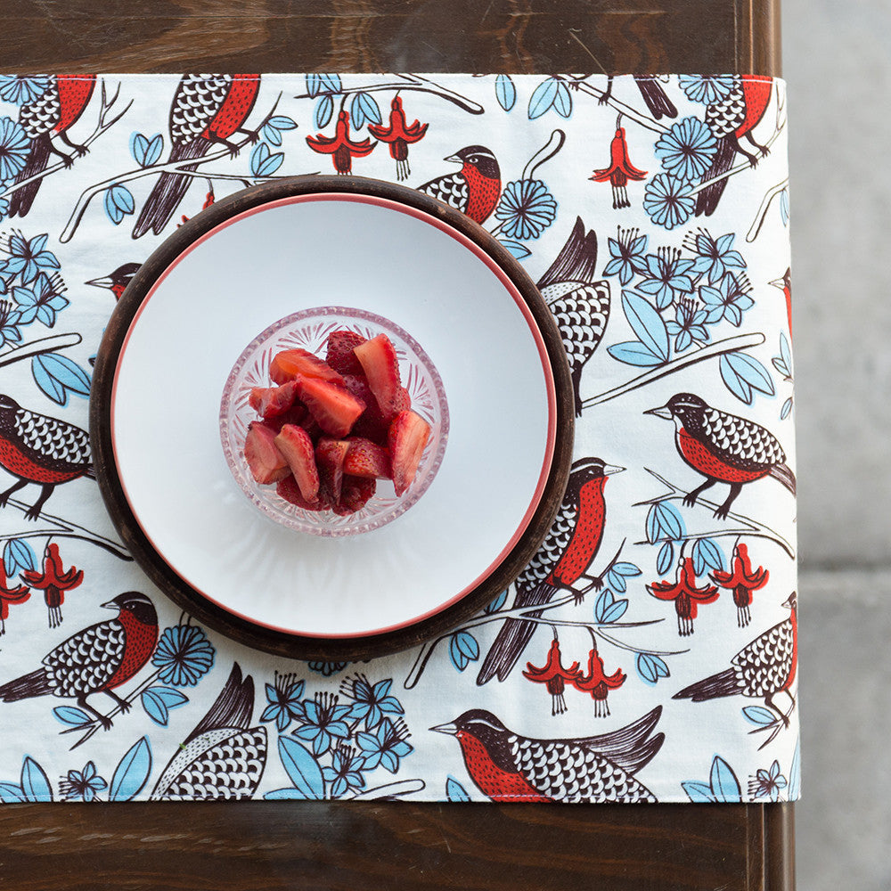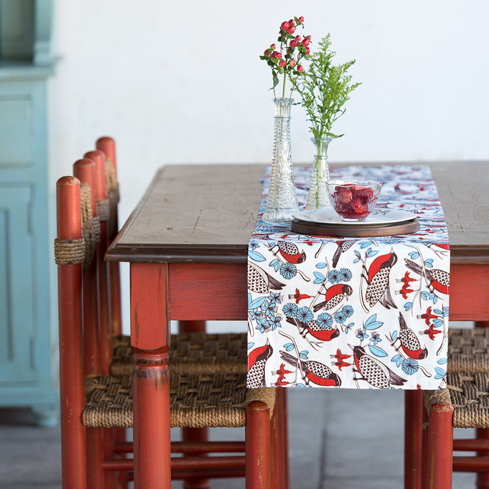 Camino de mesa estampado en serigrafía con ilustraciones exclusivas realizadas por Hued hued. Loicas es una colección que rescata a una de las aves más típica, reconocible y bella de Chile: La Loica. Rodeada de Chilcos y flores de Arrayán, las diferentes Loicas se posan en las ramas de los árboles para adornar los paisajes de la Zona Central de nuestro país.