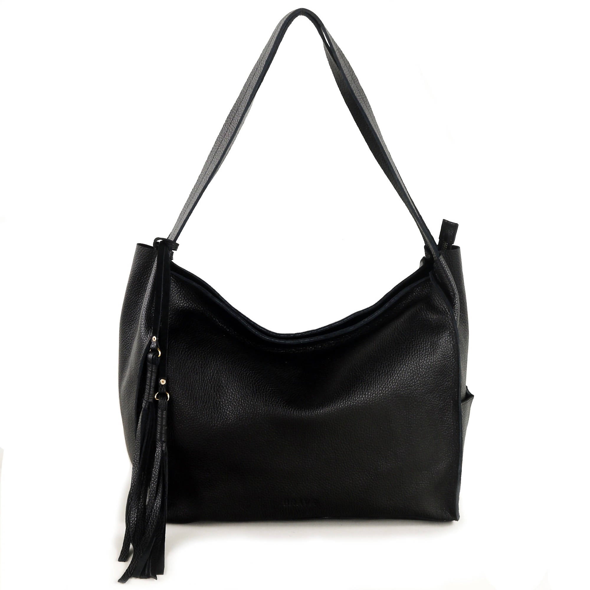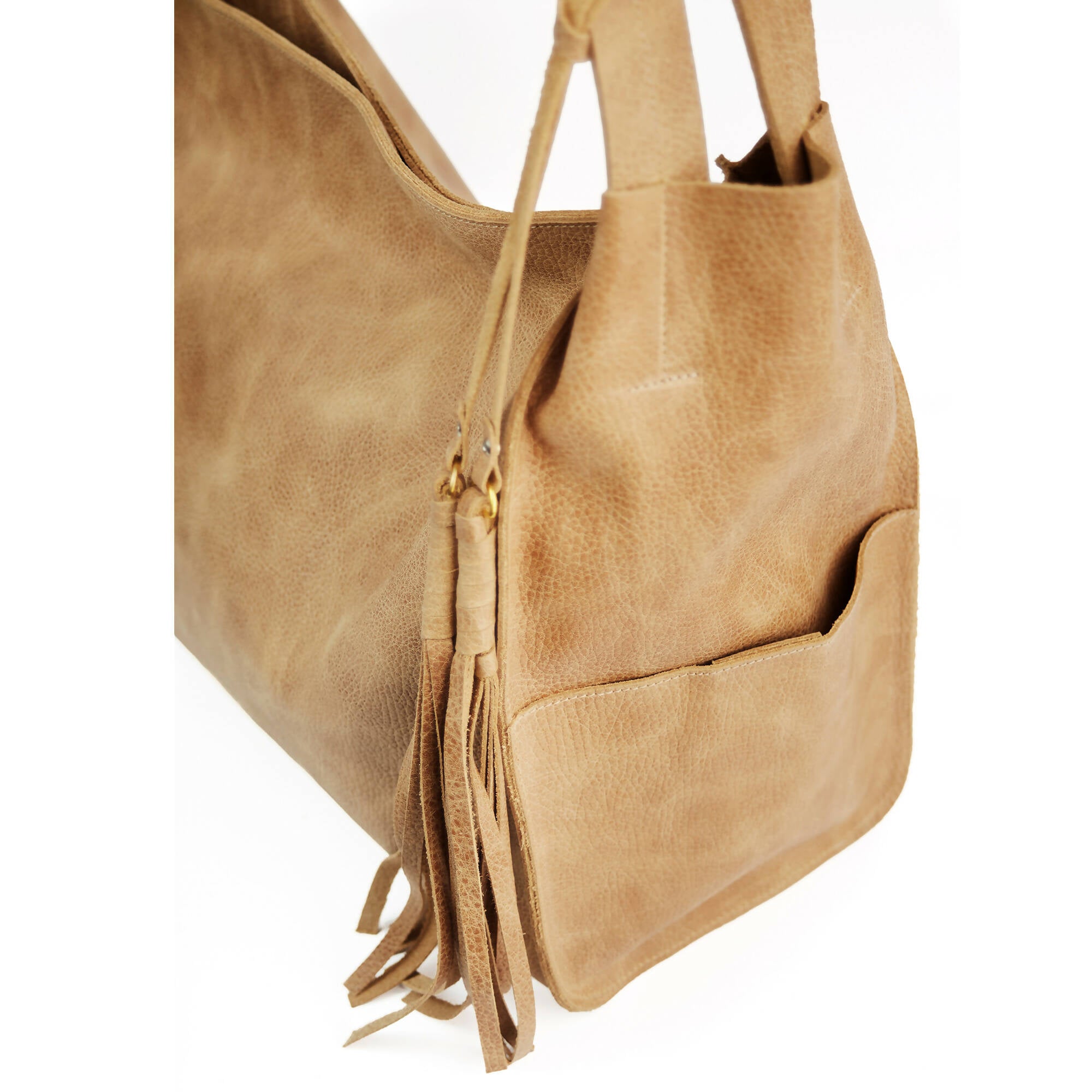 Maxicartera de cuero perfecta para llevar todo y aún más. Cuenta con un bolsillo externo con broche magnético para que accedas a tus cosas fácilmente, además de un bolsillo adicional interno de cuero con cierre metálico. Posee cierre exterior metálico en su apertura, no tiene forro interior, y cuenta con dos asas firmes para colgarla cómodamente sobre tu hombro. Para hacerla más especial lleva un adorno colgante con flecos removible. Puedes llevar en ella perfectamente tu notebook junto con el resto de elementos personales.