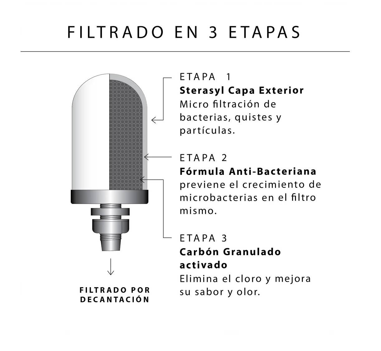 El filtro Doulton tiene la capacidad de filtrar 99,9% de partículas, quistes y bacterias (E.Coli, Cólera, Salmonela entre otros) 95% de Cloro y quita el mal sabor y olor de el agua.